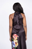 The Christy Lynn Kelly Blouse in Twilight Aster is a striking blend of boldness and elegance. Crafted from silky, fluid fabric, its sleeveless design features a high halter neckline tied into a delicate bow for a refined touch. The vibrant oversized floral print in radiant yellows, blues, and pinks pops against a rich dark background, making it a standout piece. Perfectly polished yet effortlessly wearable, this blouse pairs beautifully with tailored pants, skirts, or denim, making it ideal for day-to-night style transitions.