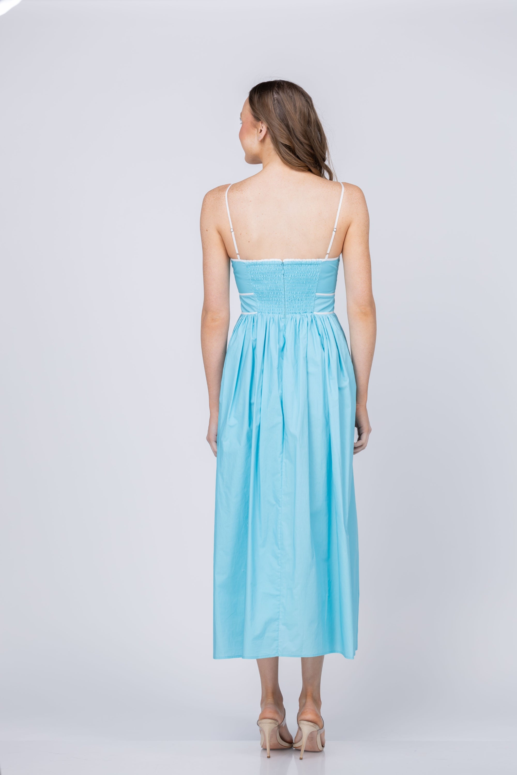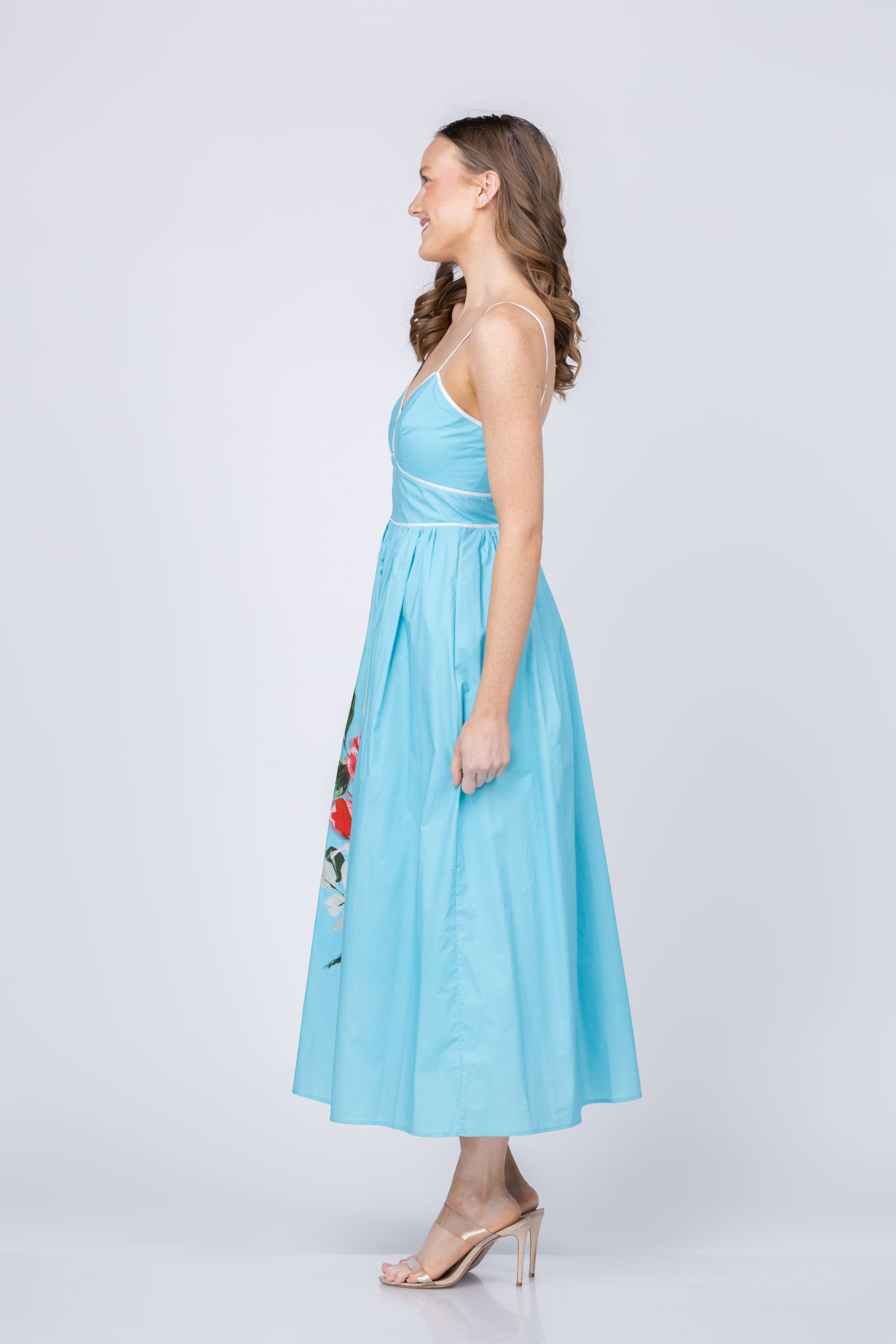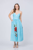 Embrace warm-weather style with the Leilani Dress, a breathable cotton essential that combines comfort with undeniable charm. The softly structured bodice features delicate contrast trim and slender straps that flatter while allowing freedom of movement, thanks to strategic back smocking. A vibrant Turquoise Rose floral adorns the flowing skirt, creating an eye-catching statement that feels fresh and romantic. The invisible center-back zipper provides a seamless silhouette without compromising ease. Perfect for vacations, garden parties, and sun-soaked celebrations, Leilani delivers effortless elegance when you need it most.