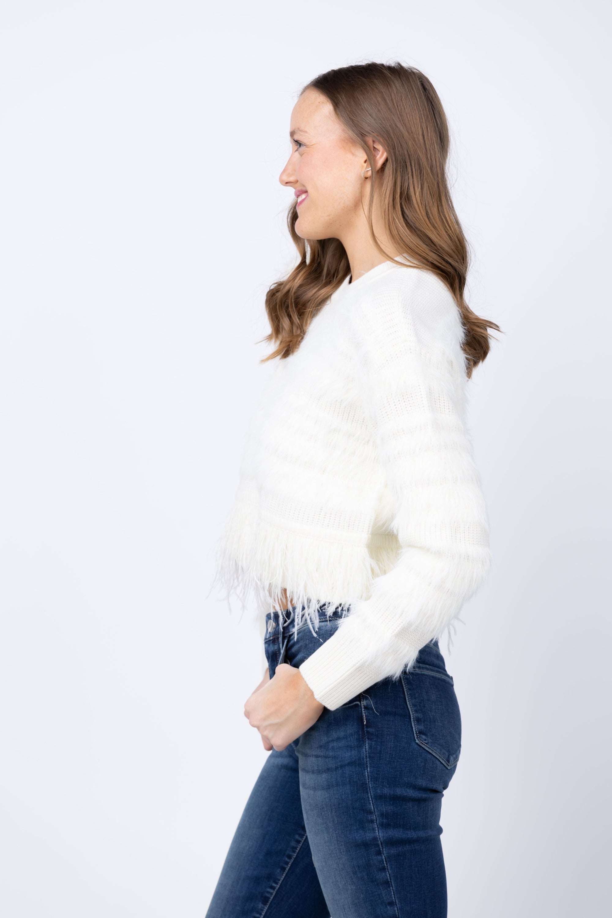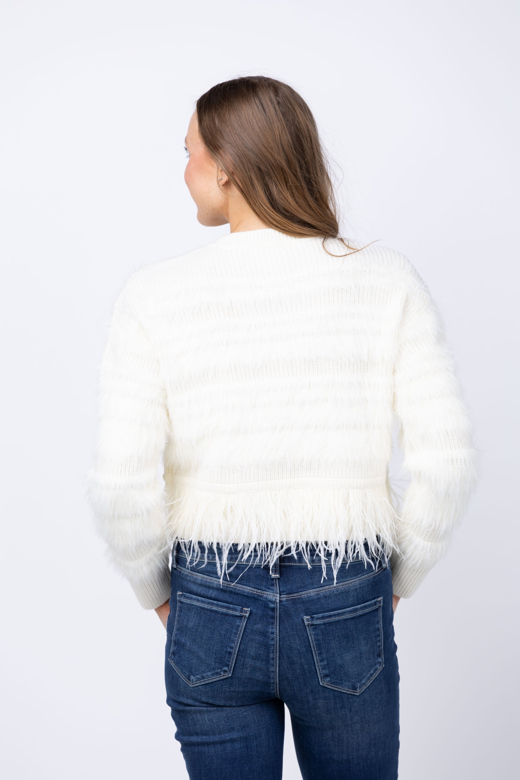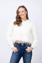 The Vivi Pullover is your new go-to for effortless elegance. Crafted in soft ivory, this beauty features delicate feather strip accents and a charming feather trim at the hem that whispers sophistication without demanding attention. Perfect for layering or wearing solo, it brings that "I woke up like this" vibe to your everyday rotation while keeping you cozy and chic.
