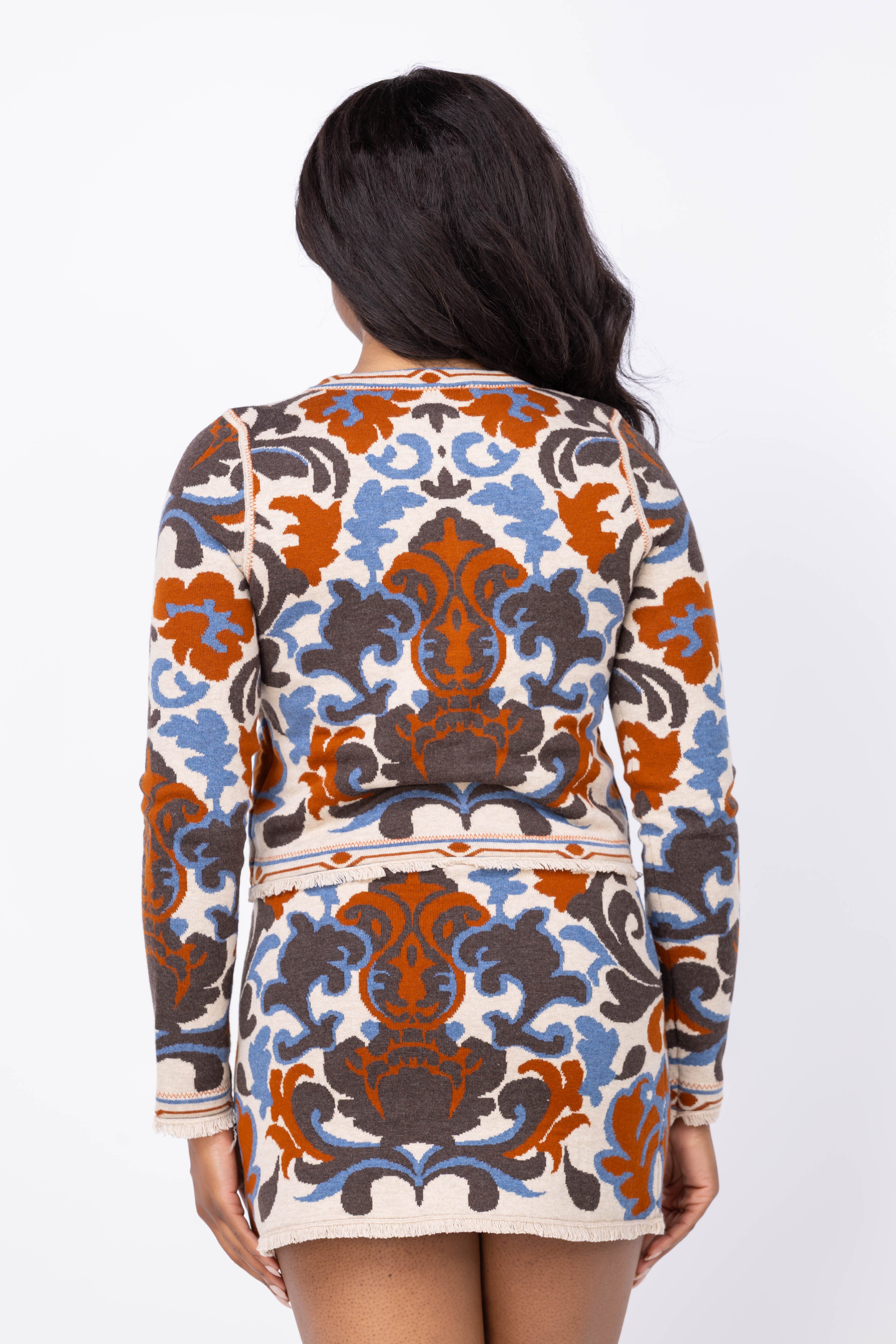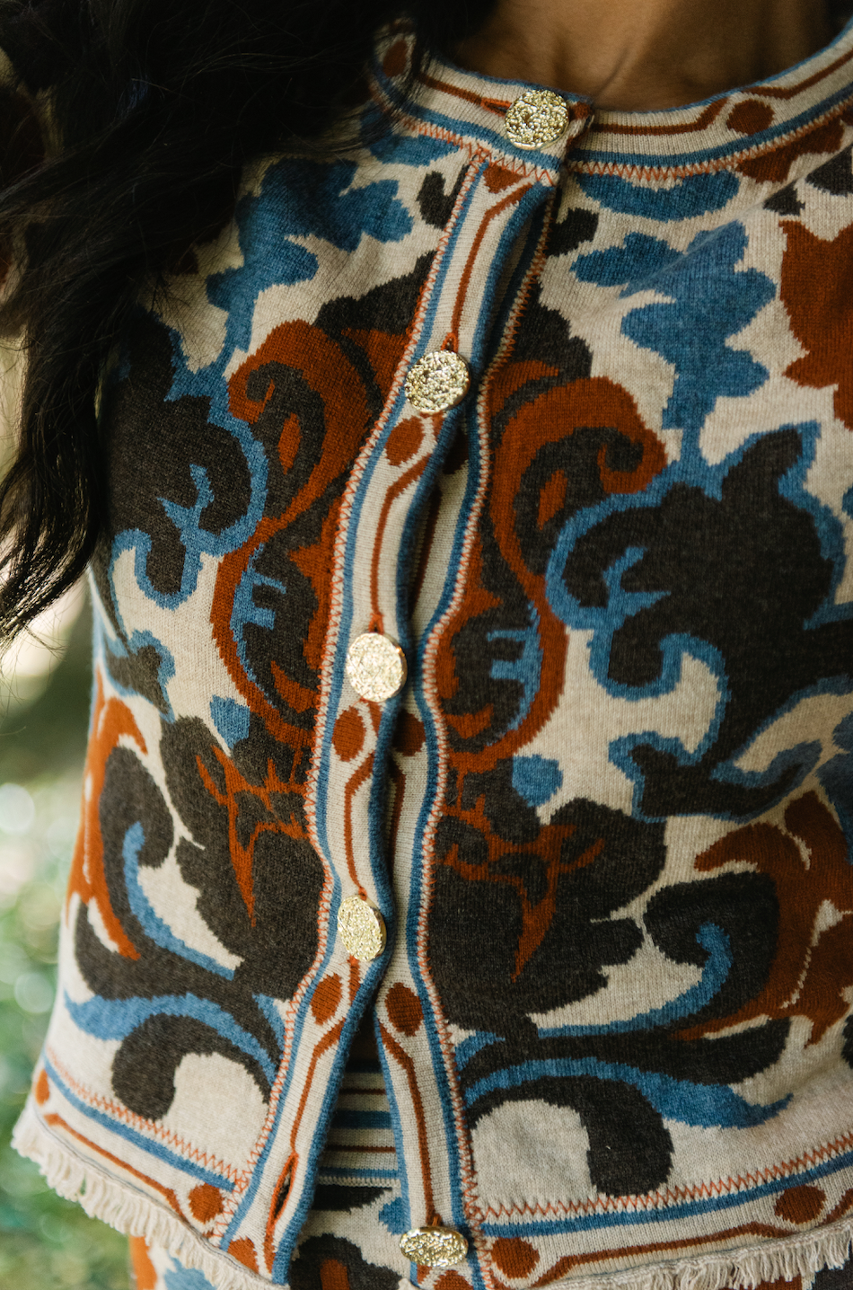 Elevate your wardrobe with the Cara Cara Livi Jacket in Mira Stone. Featuring unique gold buttons and a fitted boxy silhouette, this jacquard knit jacket stands out with fringe details on the cuffs and hem. Perfect for pairing with the matching Lindy Skirt or your favorite denim, it combines style and versatility. To maintain its shape, fold rather than hang, as the fabric may stretch over time. Choose this jacket for a chic, polished look that lasts.