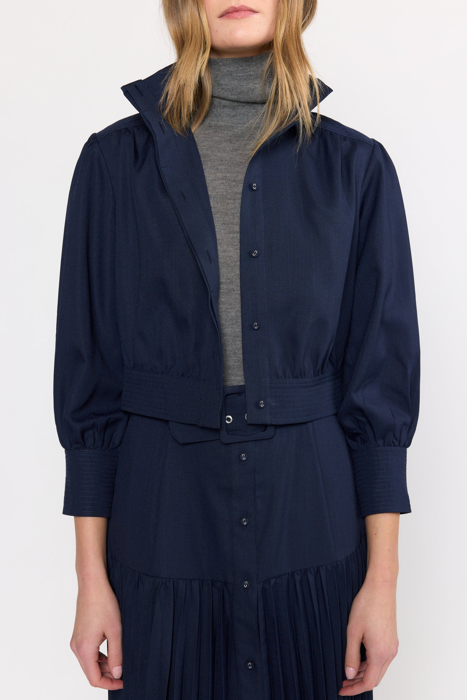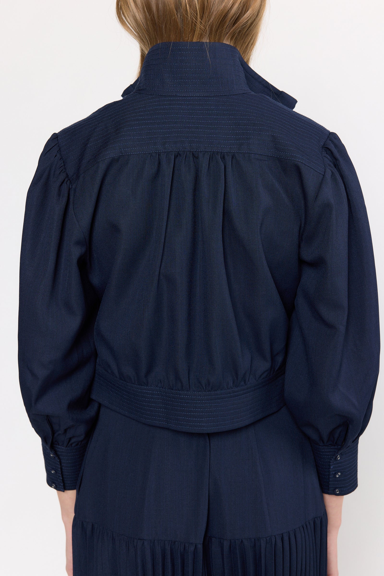 The Christy Lynn Fae Jacket in Navy blends comfort and style with its cropped fit and thick elastic waistband that ensures a secure, cozy feel. Its loose silhouette and three-quarter cuffed sleeves allow effortless movement, while the button-up front provides timeless appeal. Playful ruffles at the back add a feminine flair, and the emphasized collar beautifully frames the neckline. This versatile jacket is perfect for layering, effortlessly elevating any outfit with chic sophistication.
