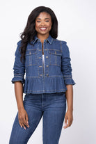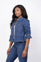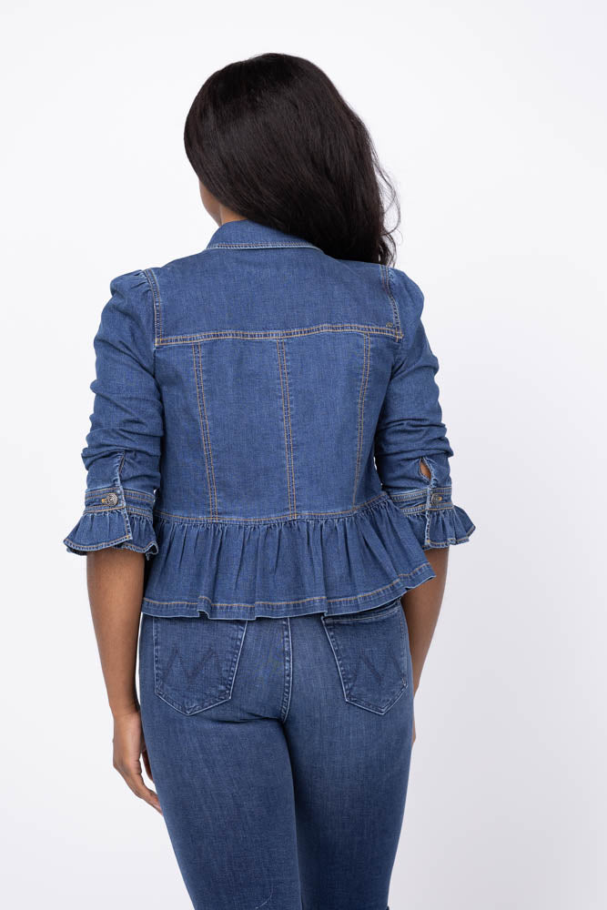 The Cinq à Sept Lightweight Denim Delanie Jacket in Ruisseau brings a fresh, playful update to a classic denim staple. Featuring permanently scrunched-up three-quarter sleeves with one-button cuffs and a ruffly peplum, this jacket adds charming texture and movement. Contrast topstitching highlights its tailored details, including a spread collar, front button closure, and chest button-flap pockets. Perfect for layering, it effortlessly combines casual cool with feminine flair.