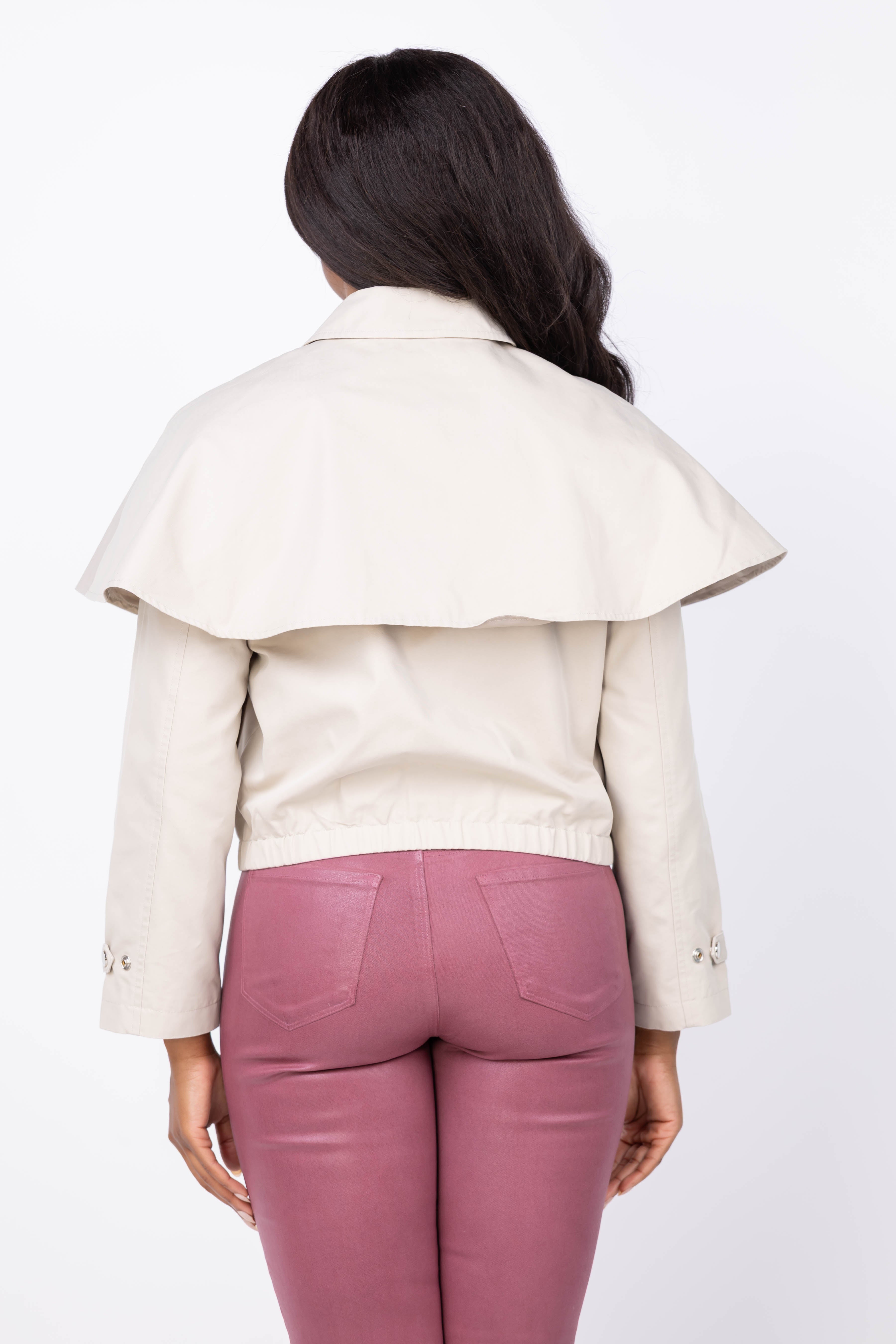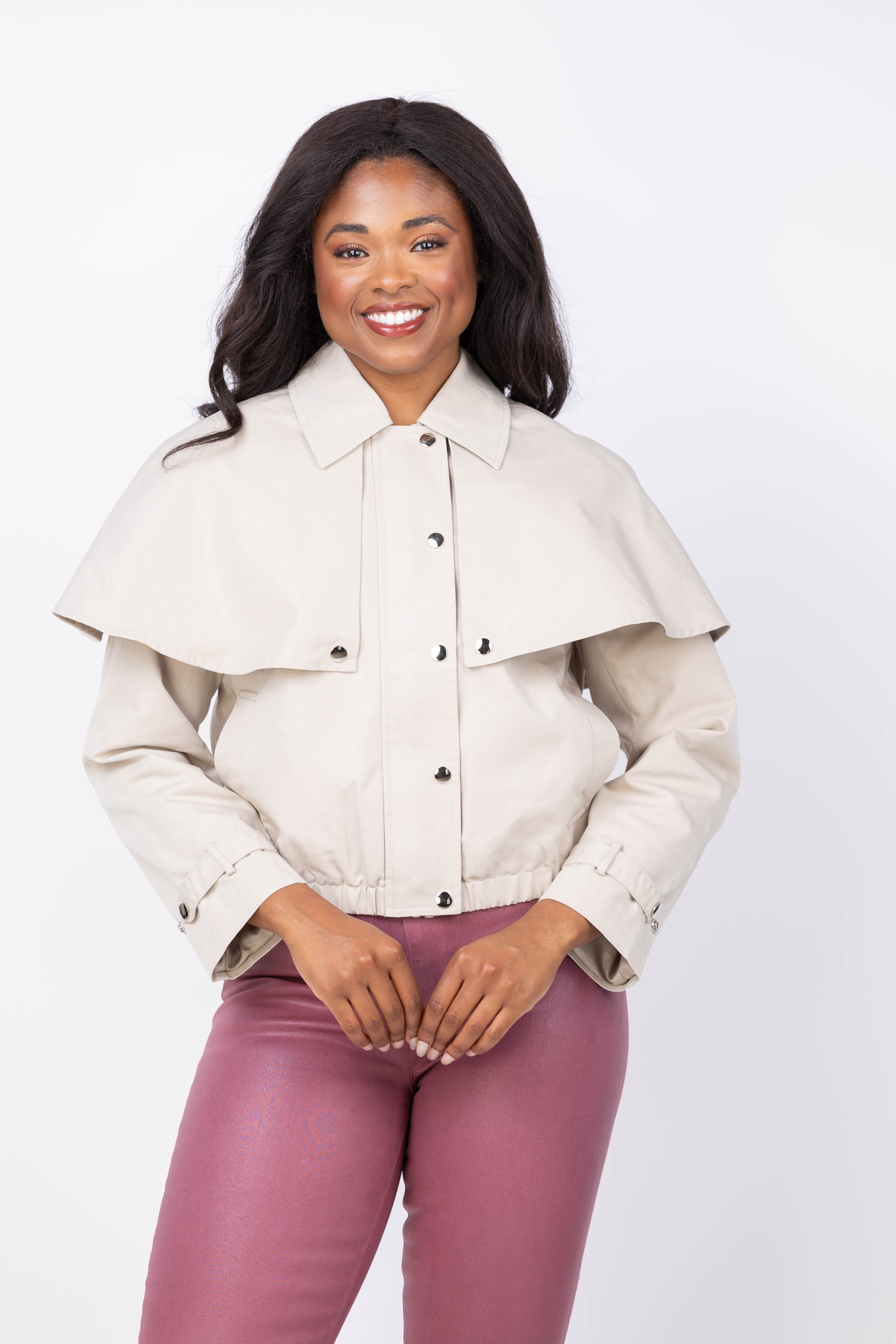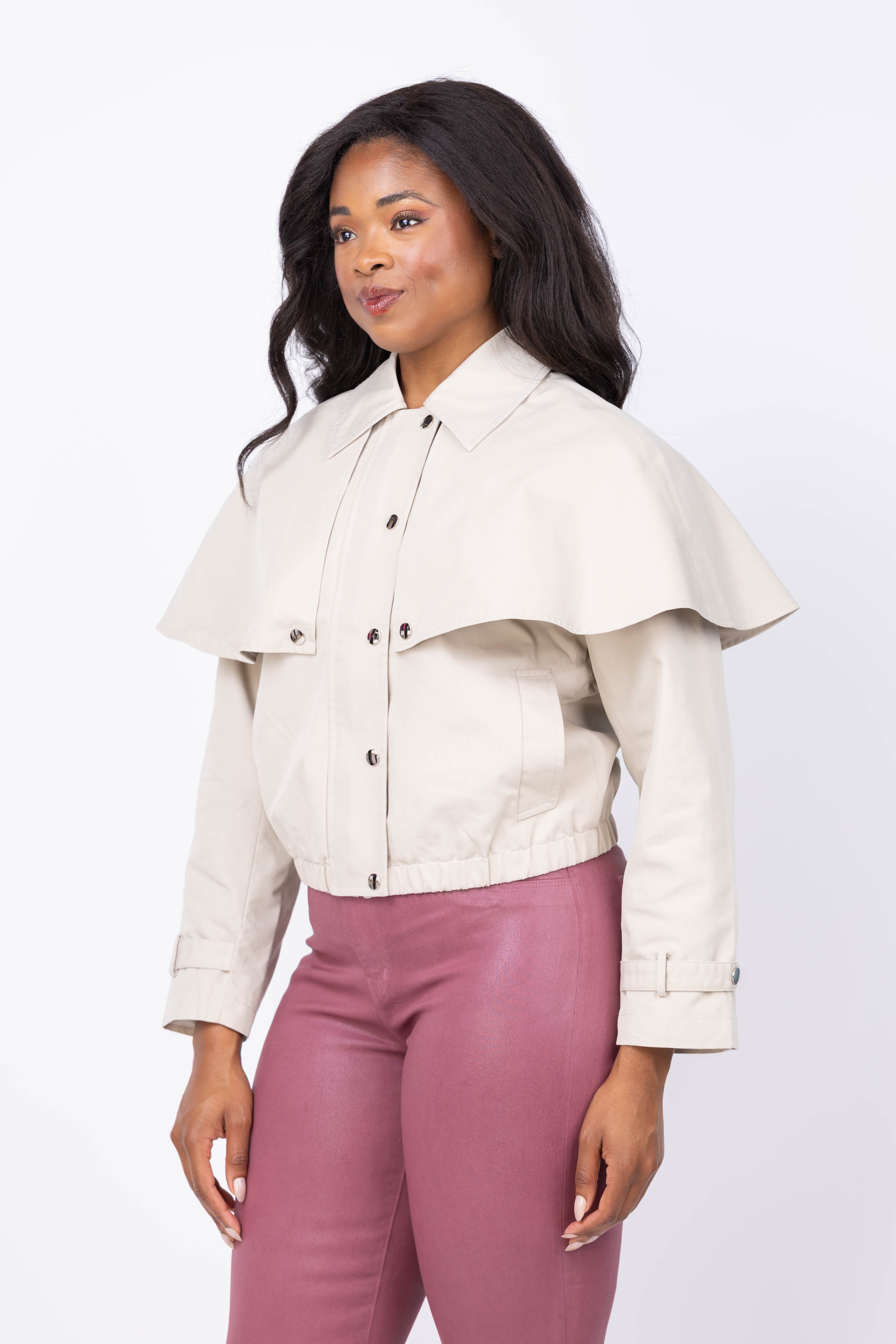 Elevate your outerwear with the DH New York Lyla Jacket in Stone. Crafted from a comfortable cotton blend, this jacket features a stylish cape-style layer and belted cuffs for a modern, tailored look. The point collar and long sleeves add classic sophistication, while side welt pockets provide practical storage. Secure closure with a front zip and snap ensures ease and versatility, making it the perfect statement piece for any season.