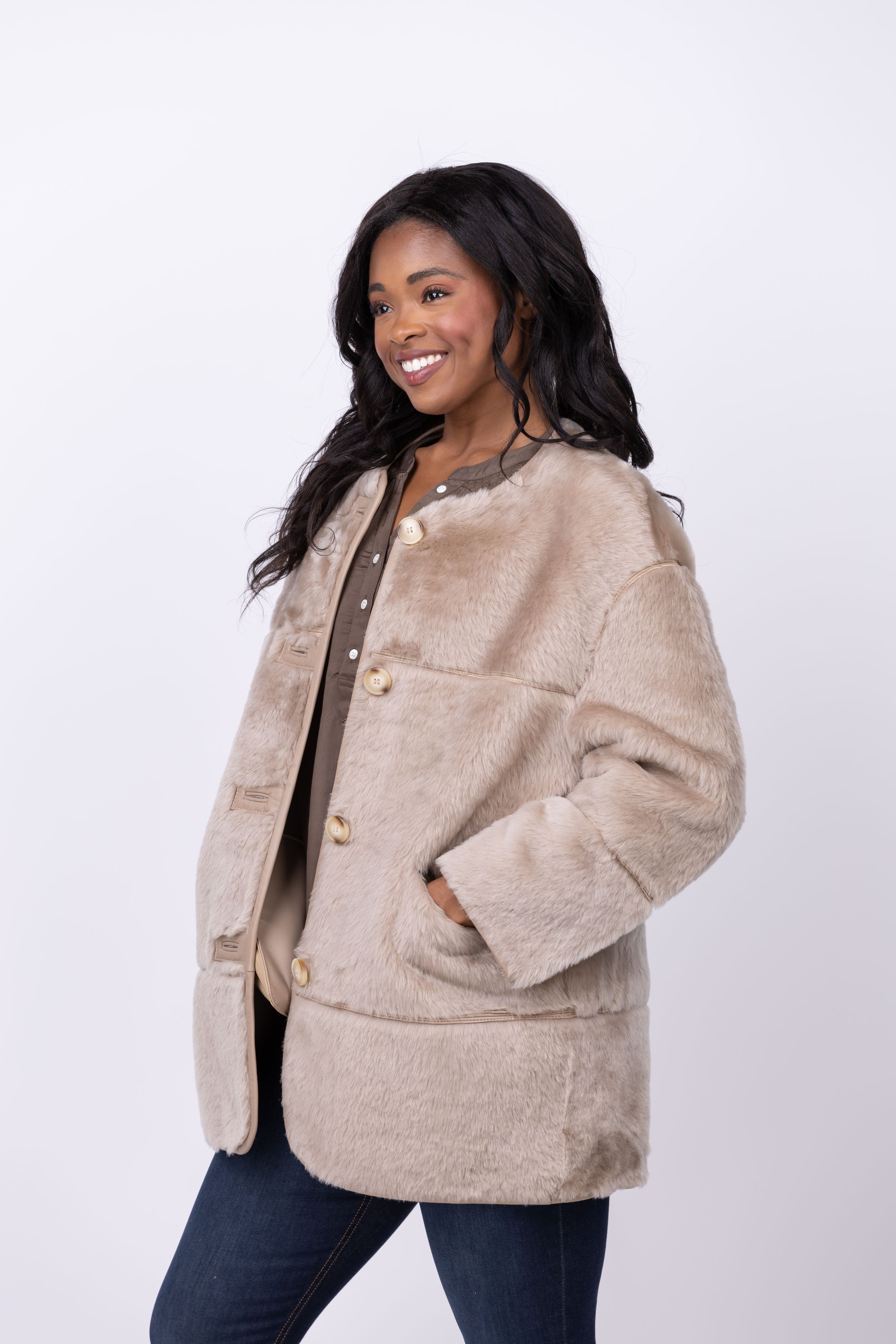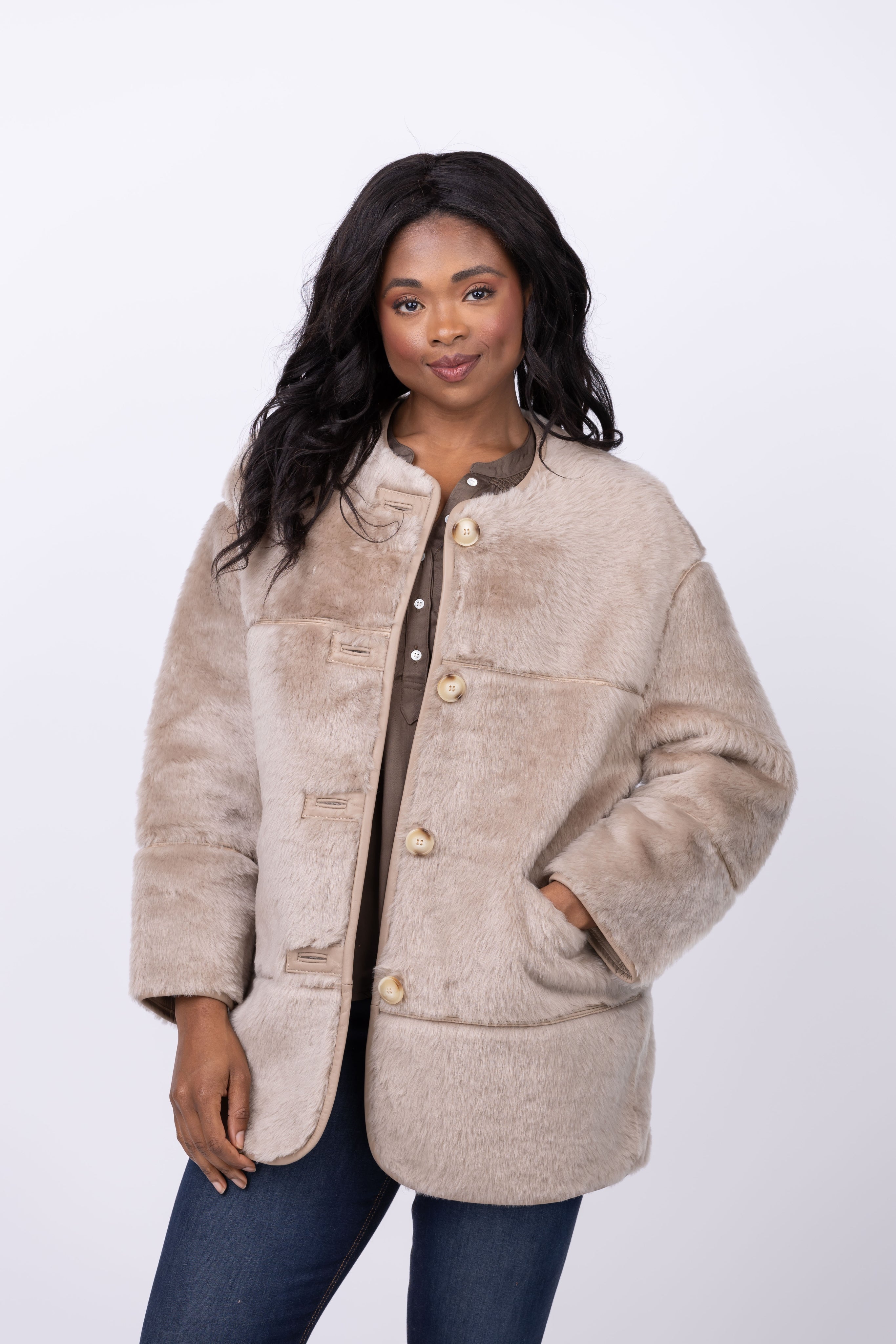 Introducing the Linda Richards Banded Lamp Jacket, crafted from luxurious Australian lamb and featuring a jewel neckline, 2 side pockets, and 4 Corozo button closures. This 31" double face jacket offers both style and functionality, making it a must-have addition to your wardrobe. Stay warm and chic in Oatmeal!