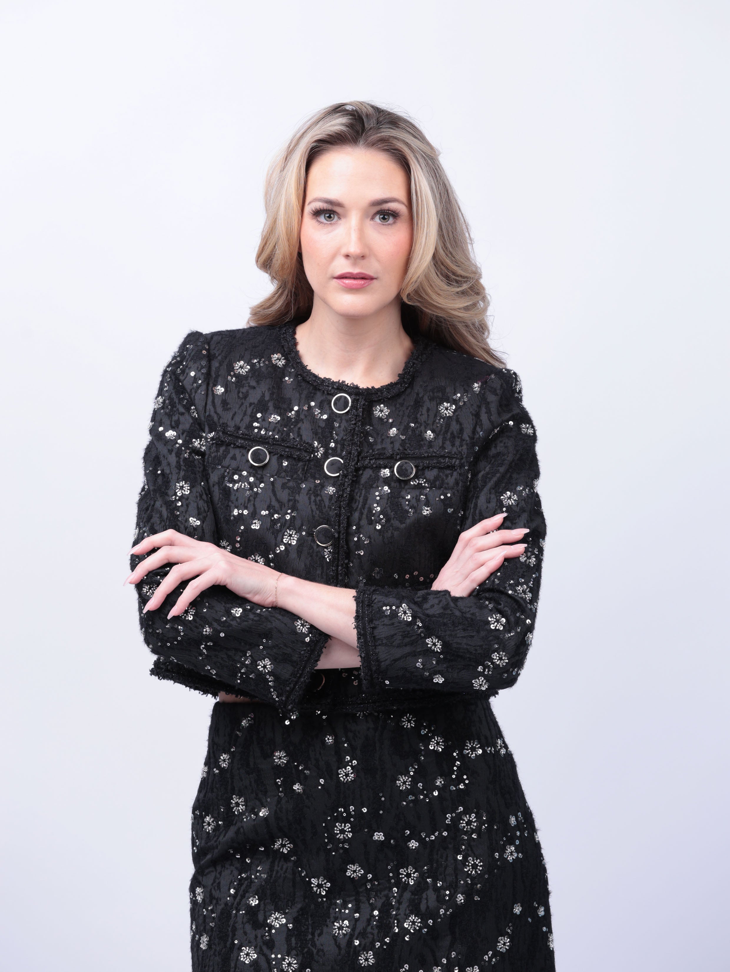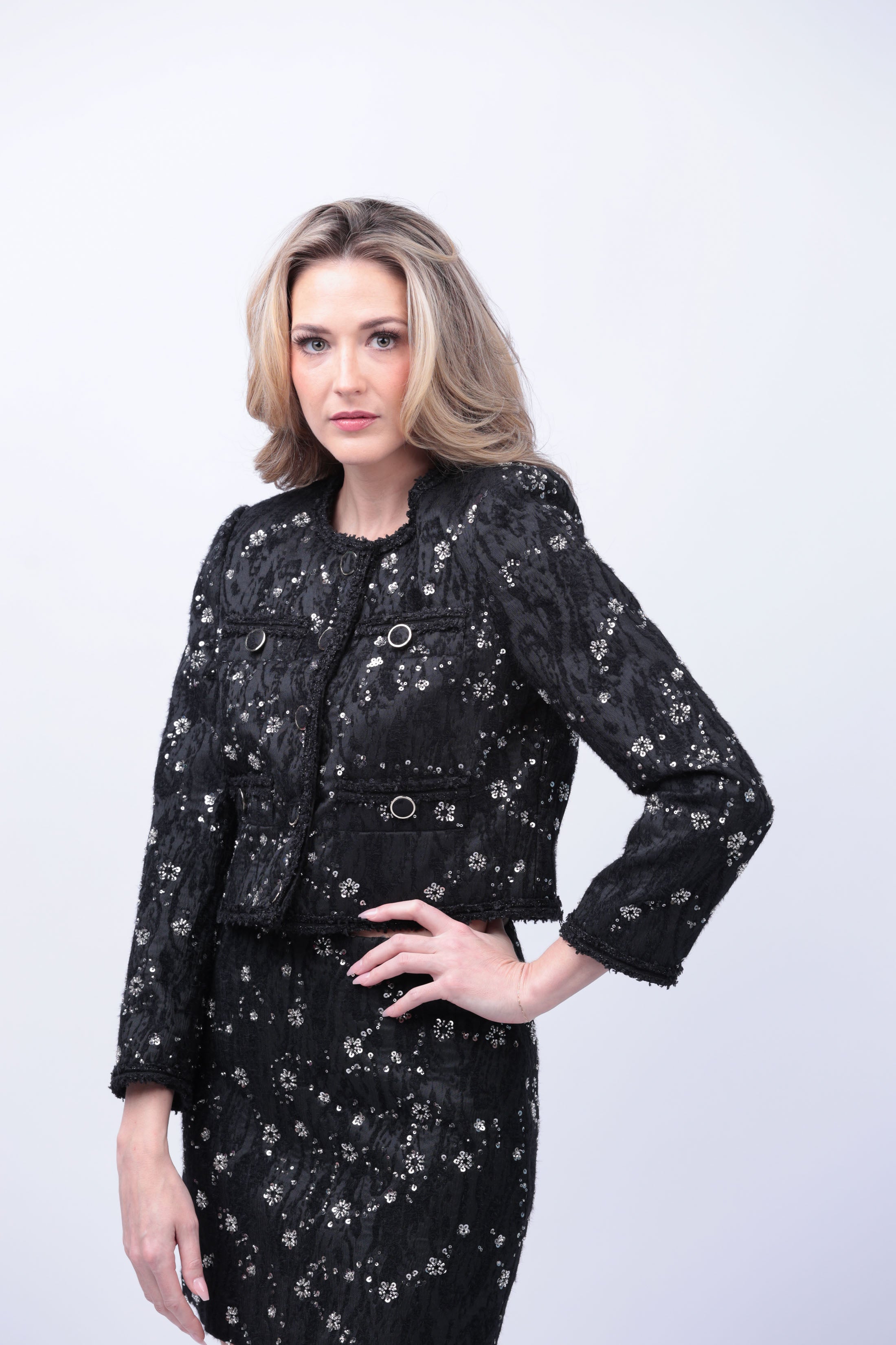Bring a touch of elegance to holiday dressing with our classic, boxy cut Pheobe jacket that’s cut from textured fabric and designed with our festive beaded and sequin detail throughout. It has front pocket details and is finished with covered buttons to close. For the full look, wear it with the Modern Beaded Mini Skirt.