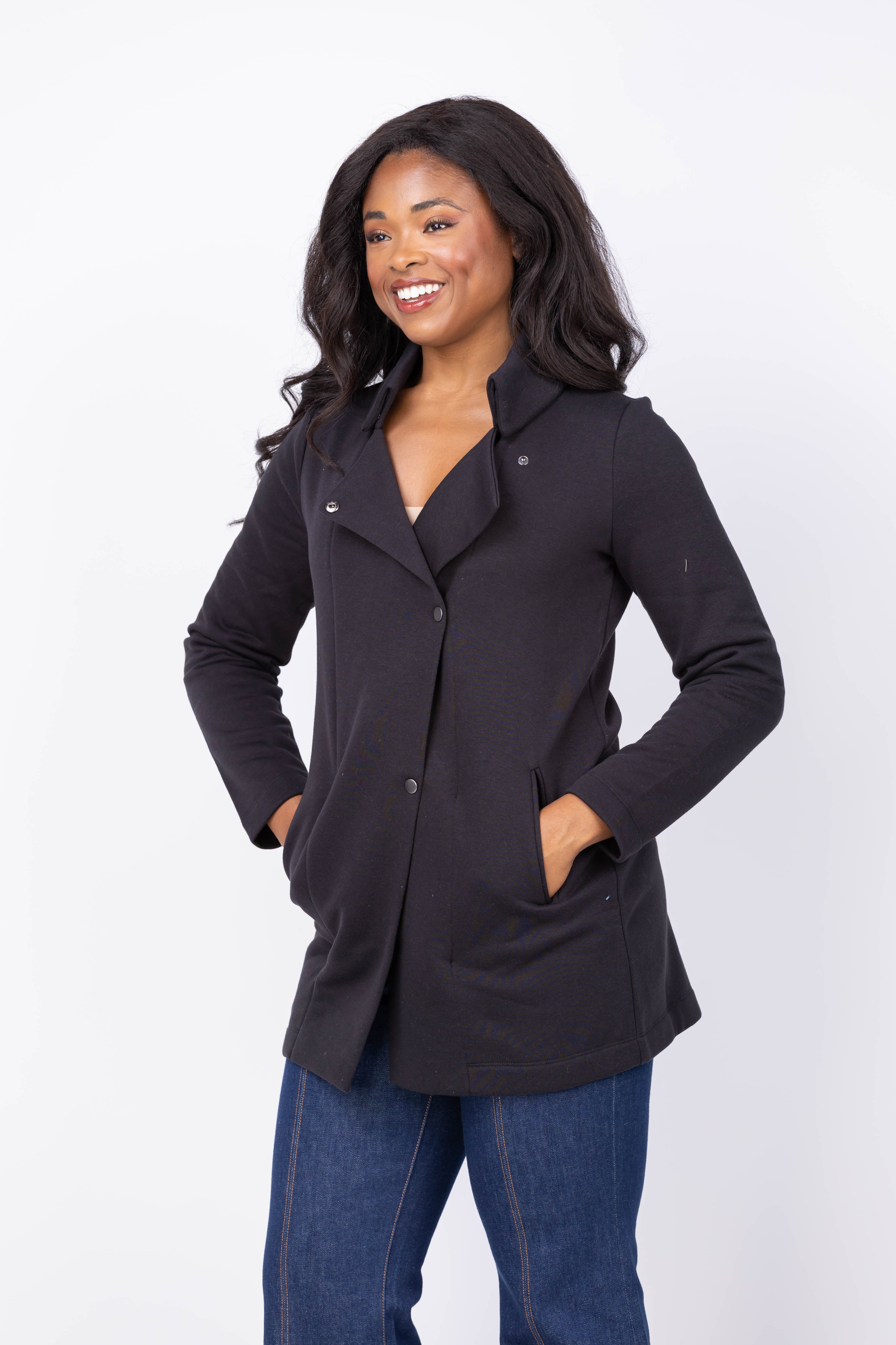The Nic + Zoe About Town Jacket in Black Onyx offers effortless style with a sleek, unlined design that’s perfect for layering. Features like welt pockets, a shirt collar, and snap closure combine for a polished yet relaxed look. Its midweight fabric ensures comfort and versatility, easily pairing with everything from jeans to tailored pieces. Experience a timeless silhouette that makes dressing simple and stylish every day.