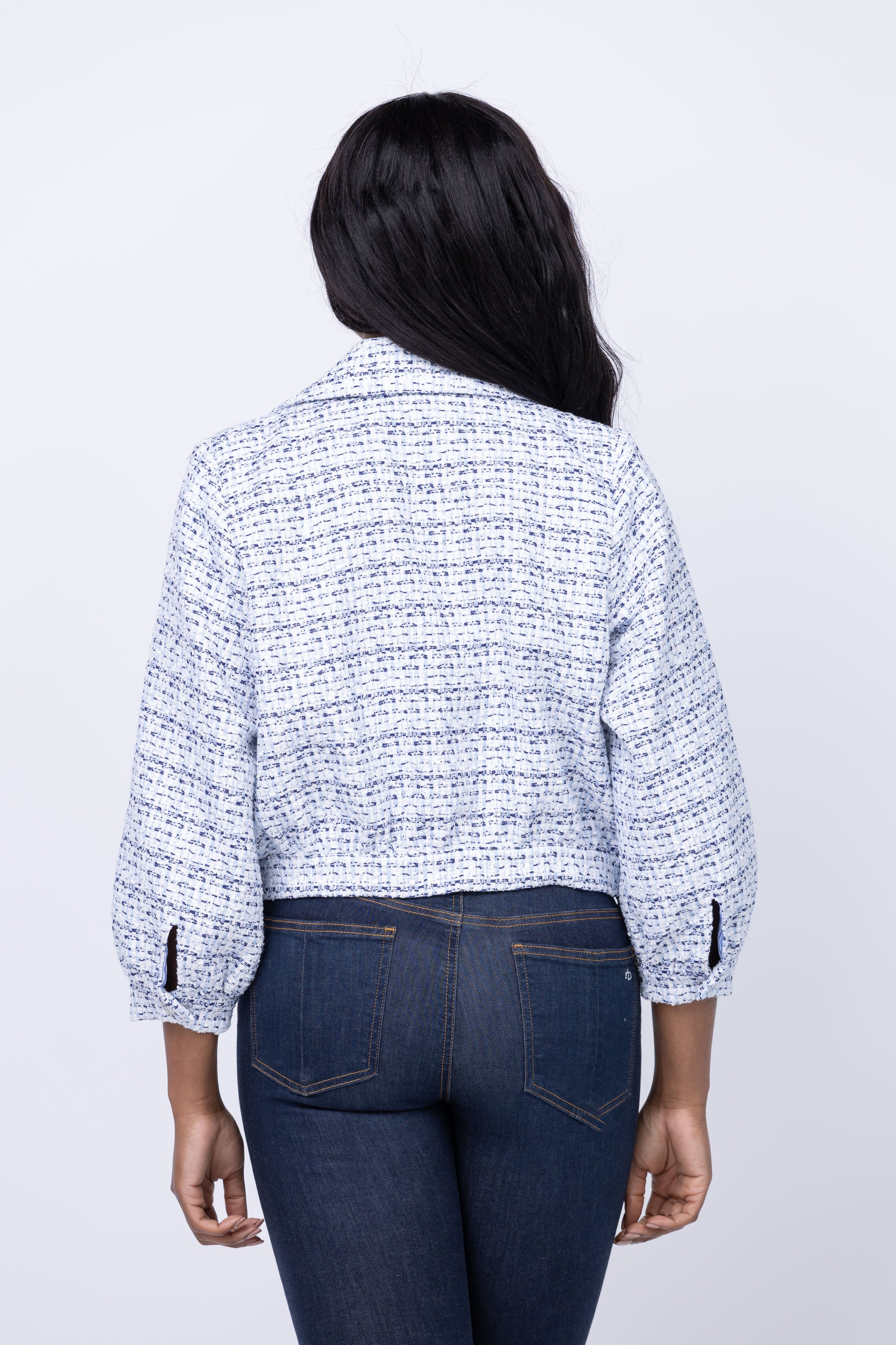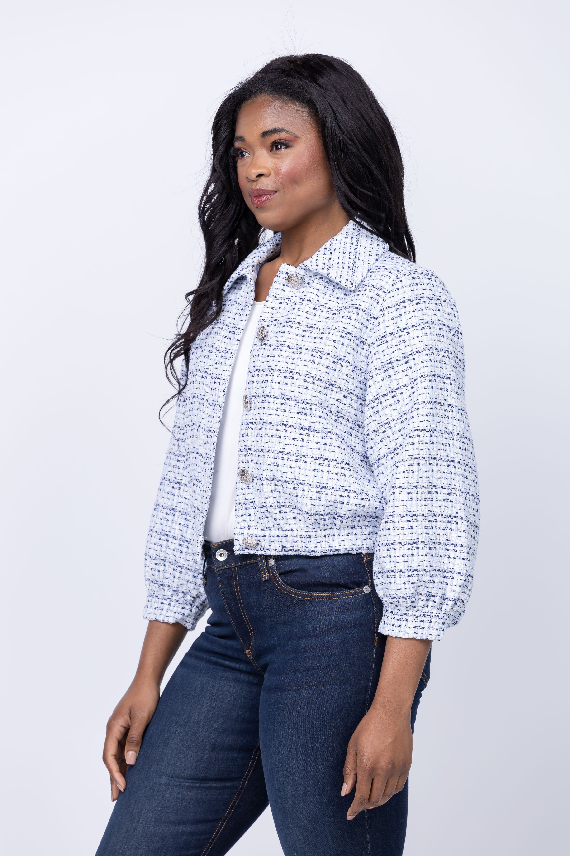 Upgrade your wardrobe with the Tyler Boe Harper Boucle Jacket in Light Blue. This versatile jacket features puffed sleeves and a cropped hem for a flattering silhouette, along with our signature embossed dome buttons. Perfect for both the office and weekend occasions, pair with denim and a tee for an effortlessly elevated look.