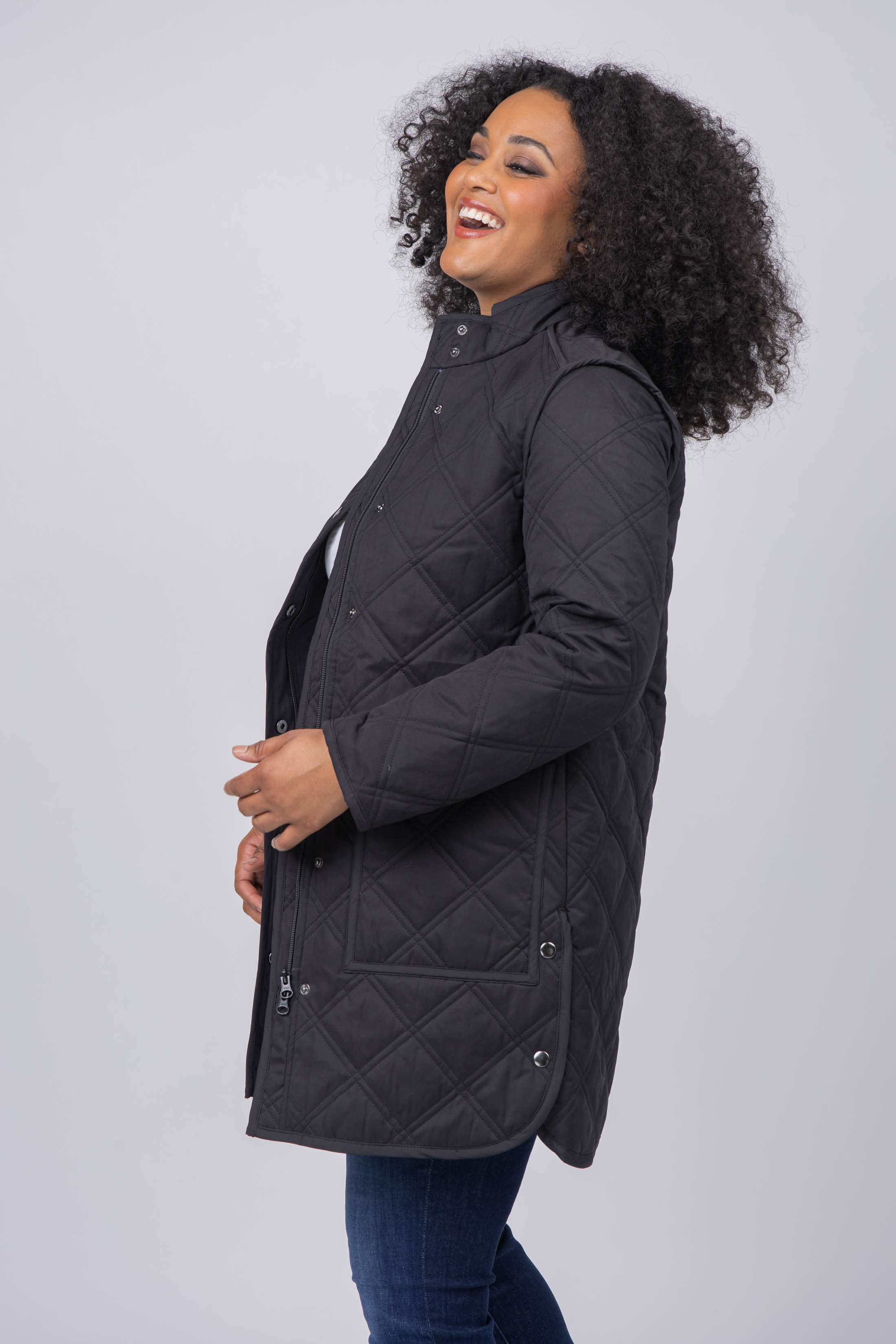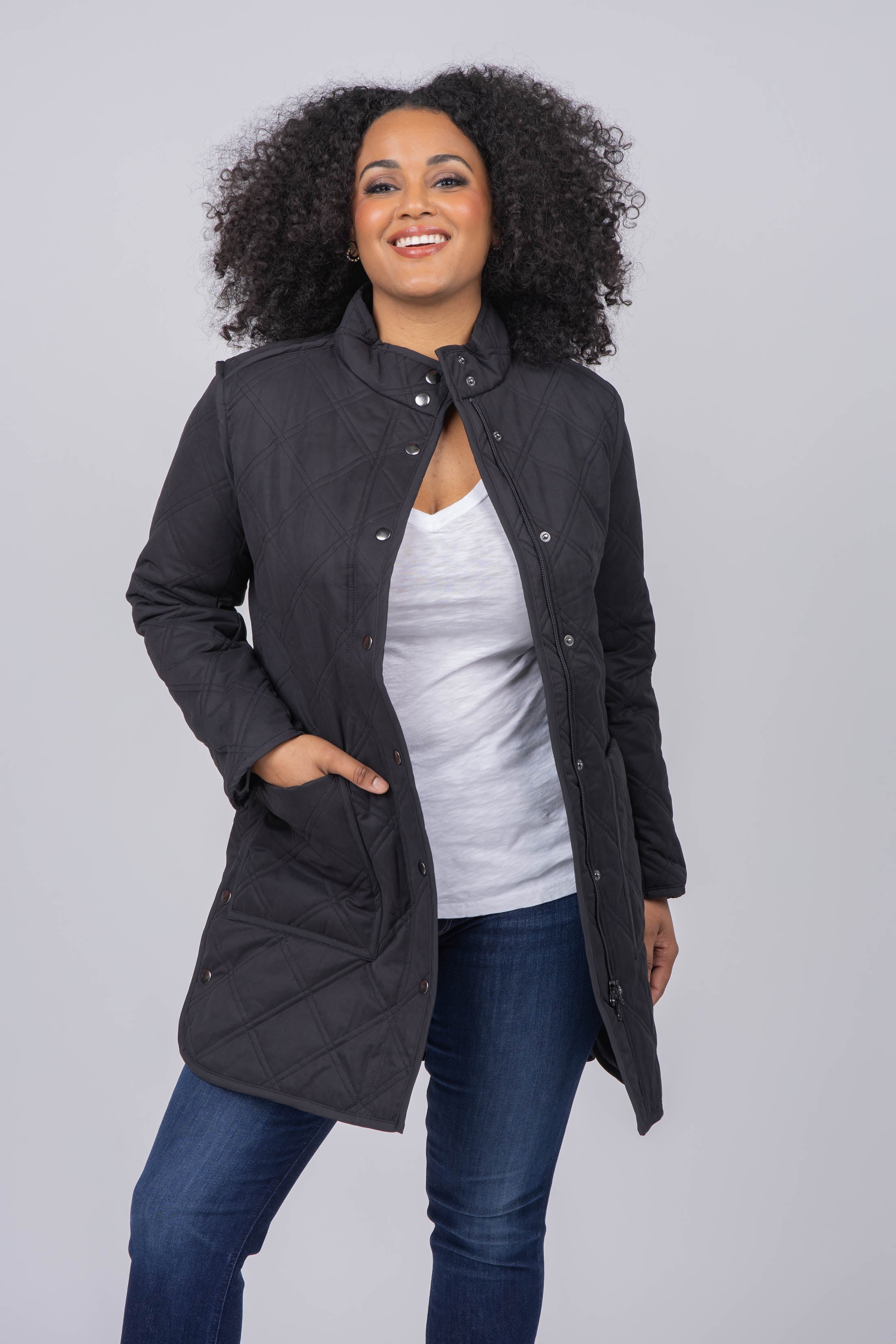 A classic, year-round jacket for town or country. This style features a quilt design, faux-suede piping and a chic stand collar. With a more feminine, tailored fit, this is the perfect durable outerwear layer for any season.