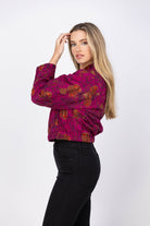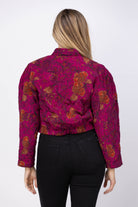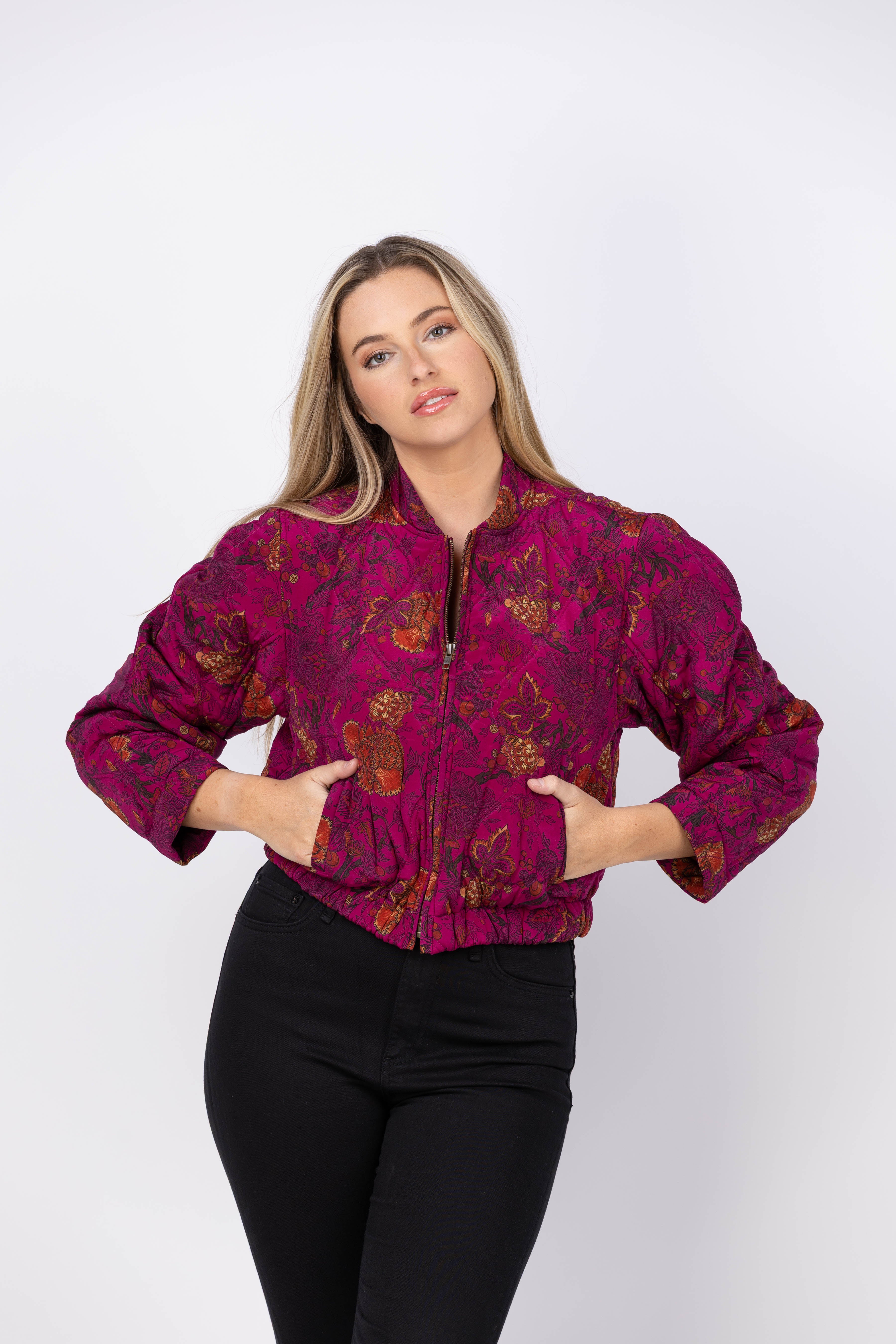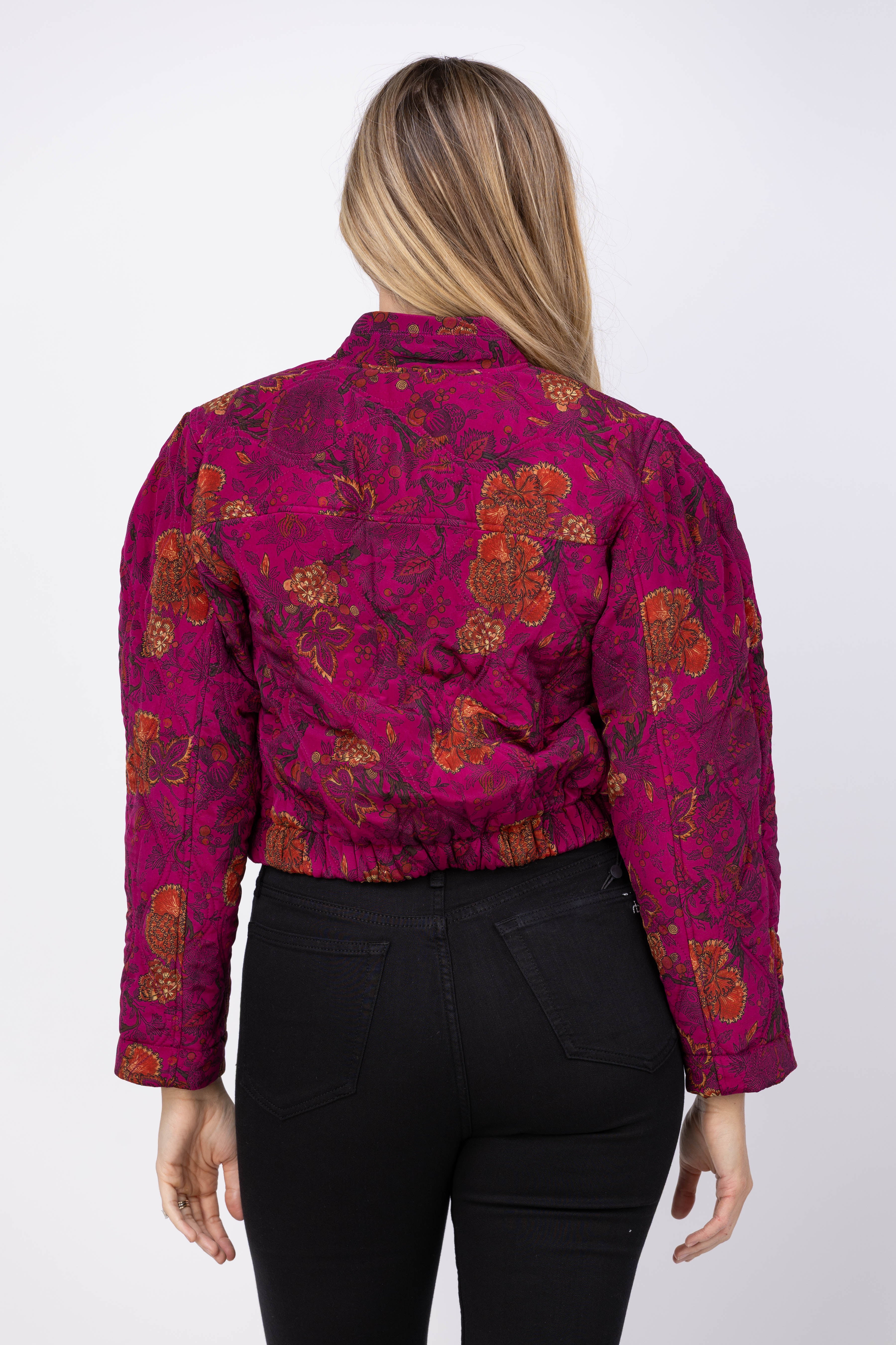 The Ulla Johnson Lavinia Silk Quilted Bomber Jacket in Peony transforms classic style with a vibrant 19th-century French floral print and bold graphic engravings. Crafted from non-stretch silk crepe de chine, this jacket offers a luxurious texture alongside sculptural sleeves and an elegantly oversized fit. Perfect for adding a striking, refined statement to any outfit, it elevates the traditional bomber into a sophisticated, fashion-forward piece.