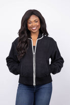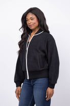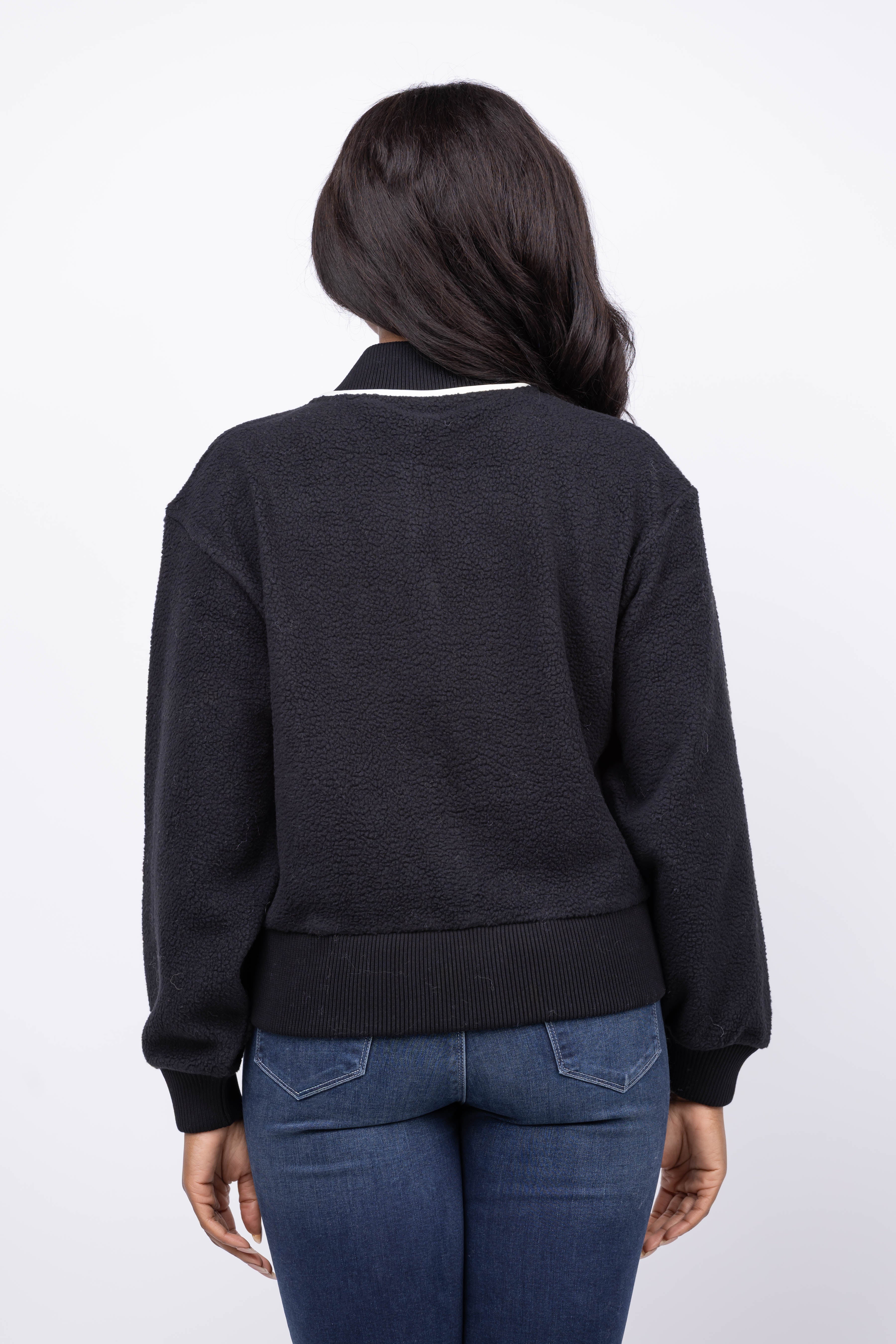 The Varley Hansley Fleece Jacket in Black combines timeless bomber style with cozy warmth. Made from soft fleece, it features a chunky knitted rib collar and cuffs for added comfort on chilly days. Elegant contrast tipping along the collar and front adds refined structure, making this jacket a versatile layering essential that effortlessly enhances your cold-weather wardrobe.