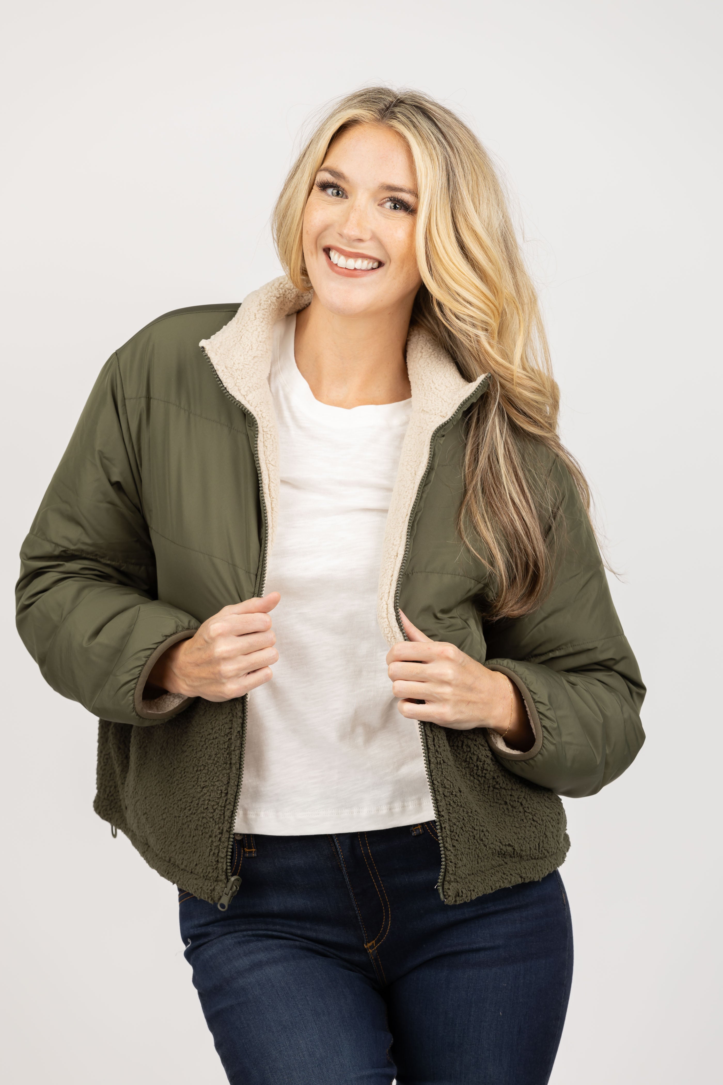 Embrace the cool fall weather in our Velvet Tasha Jacket! This stunning shearling jacket in an olive hue is the perfect addition to your wardrobe. Stay warm and stylish with the perfect fall puffer. Don't miss out on this must-have piece!