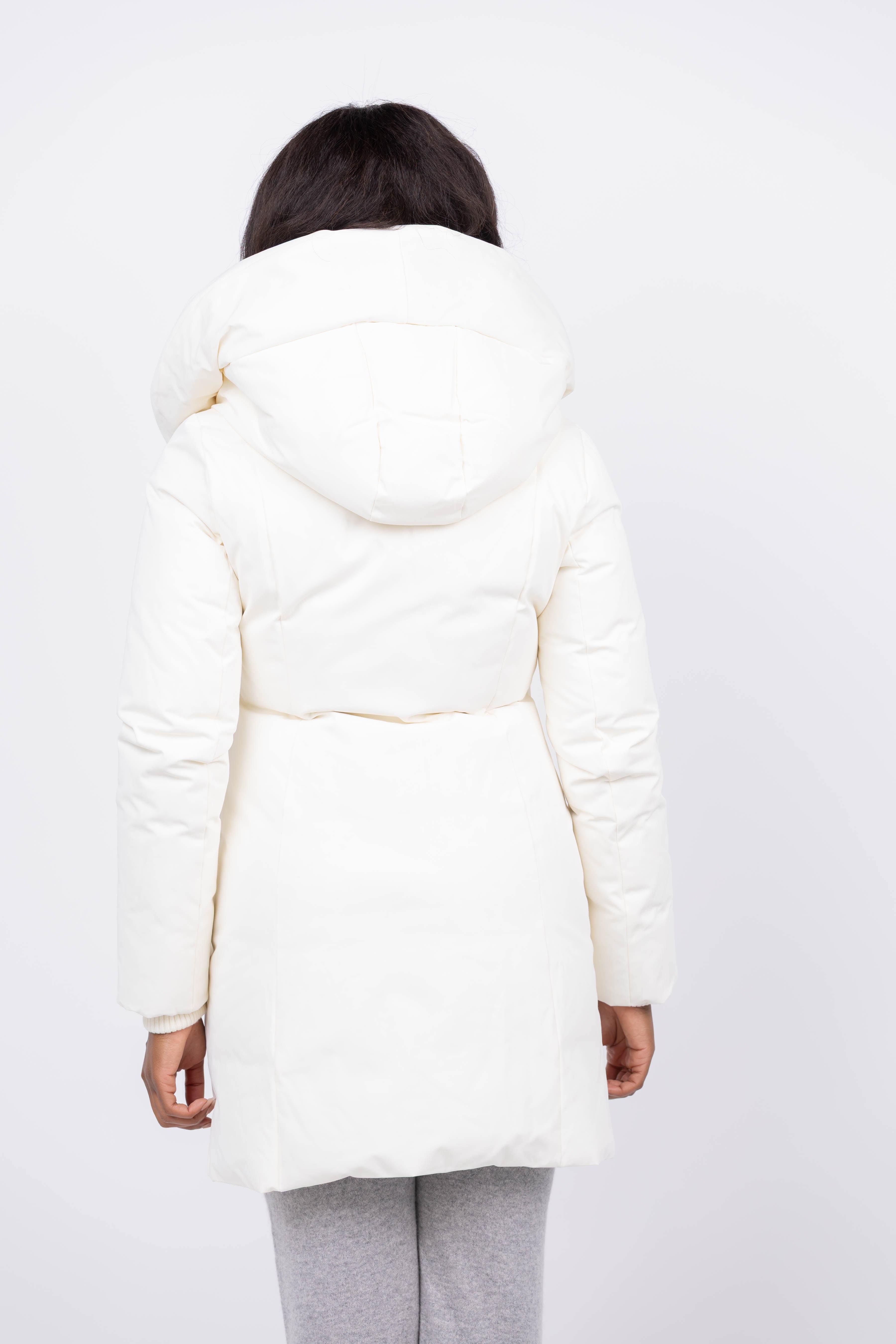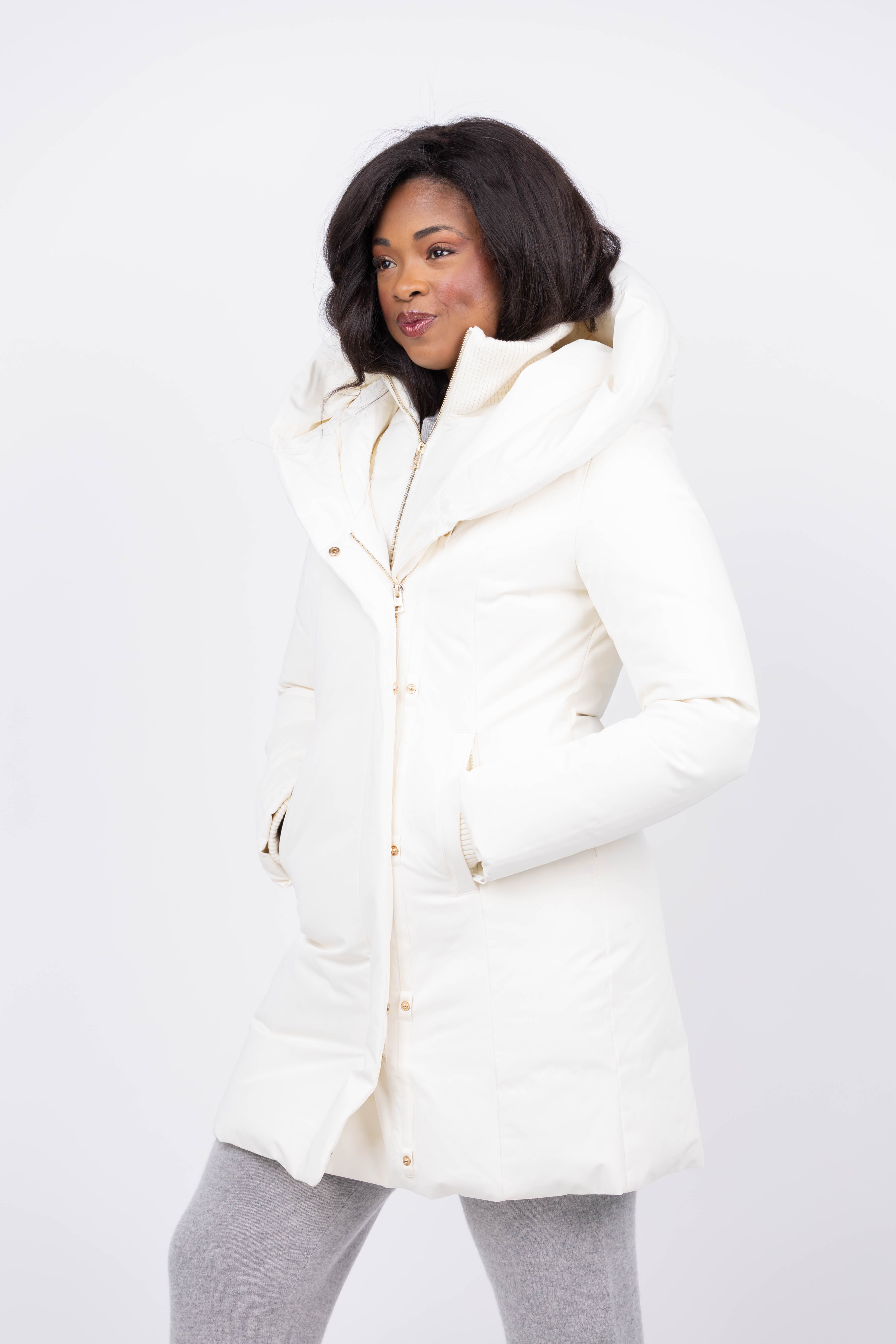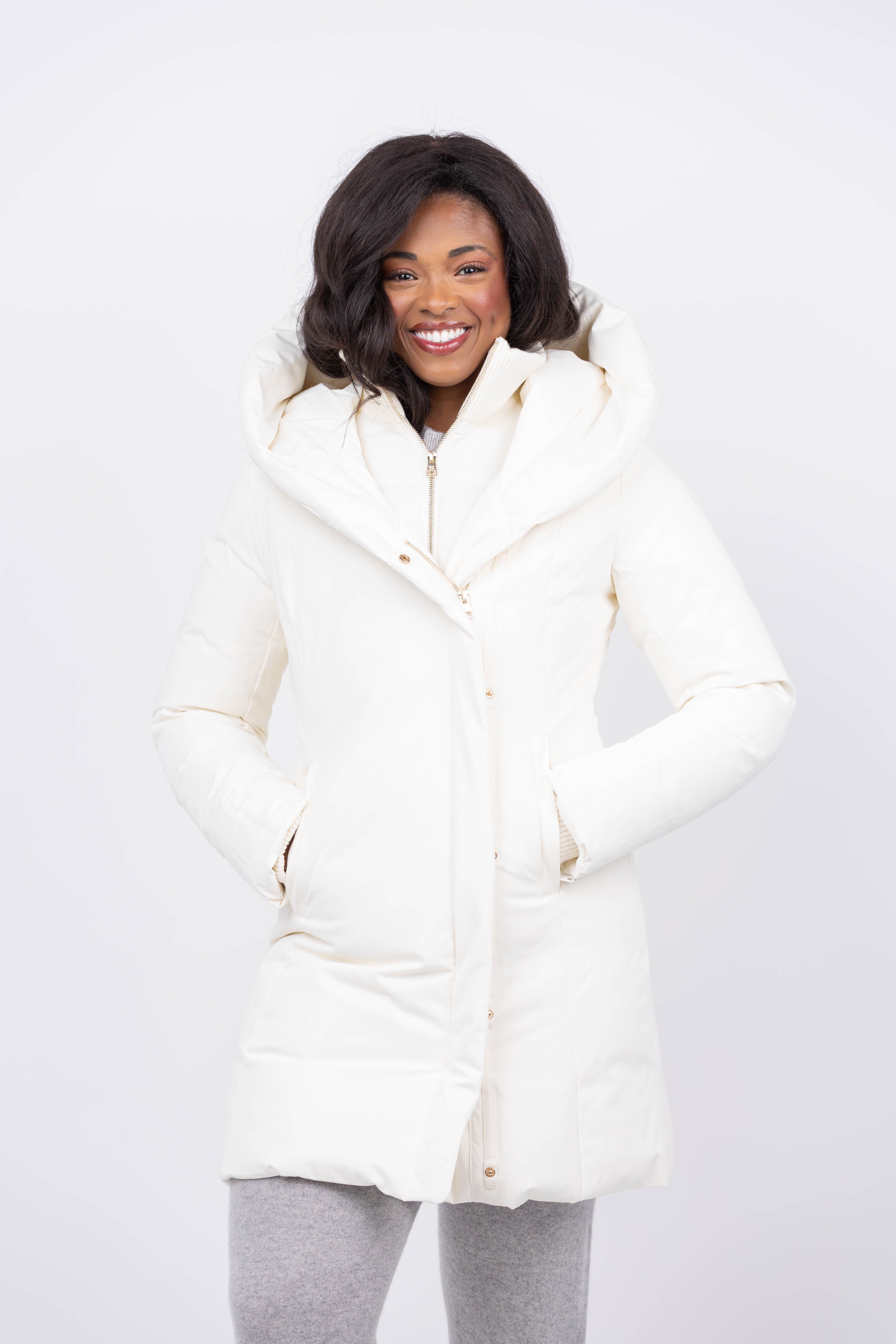 The Soia & Kyo Camelia Coat in Powder combines winter-ready performance with elegant design. Engineered to withstand temperatures as low as -30 °C, it features RDS-certified down insulation and a quilted puffer bib for added warmth. Thoughtful details like a hidden zip closure, rib-knit storm cuffs, and fleece-lined pockets enhance comfort and protection. The cotton-blend shell offers a refined texture, creating a sleek, sophisticated silhouette ideal for harsh winter days. Stay warm in style with this expertly crafted coat.