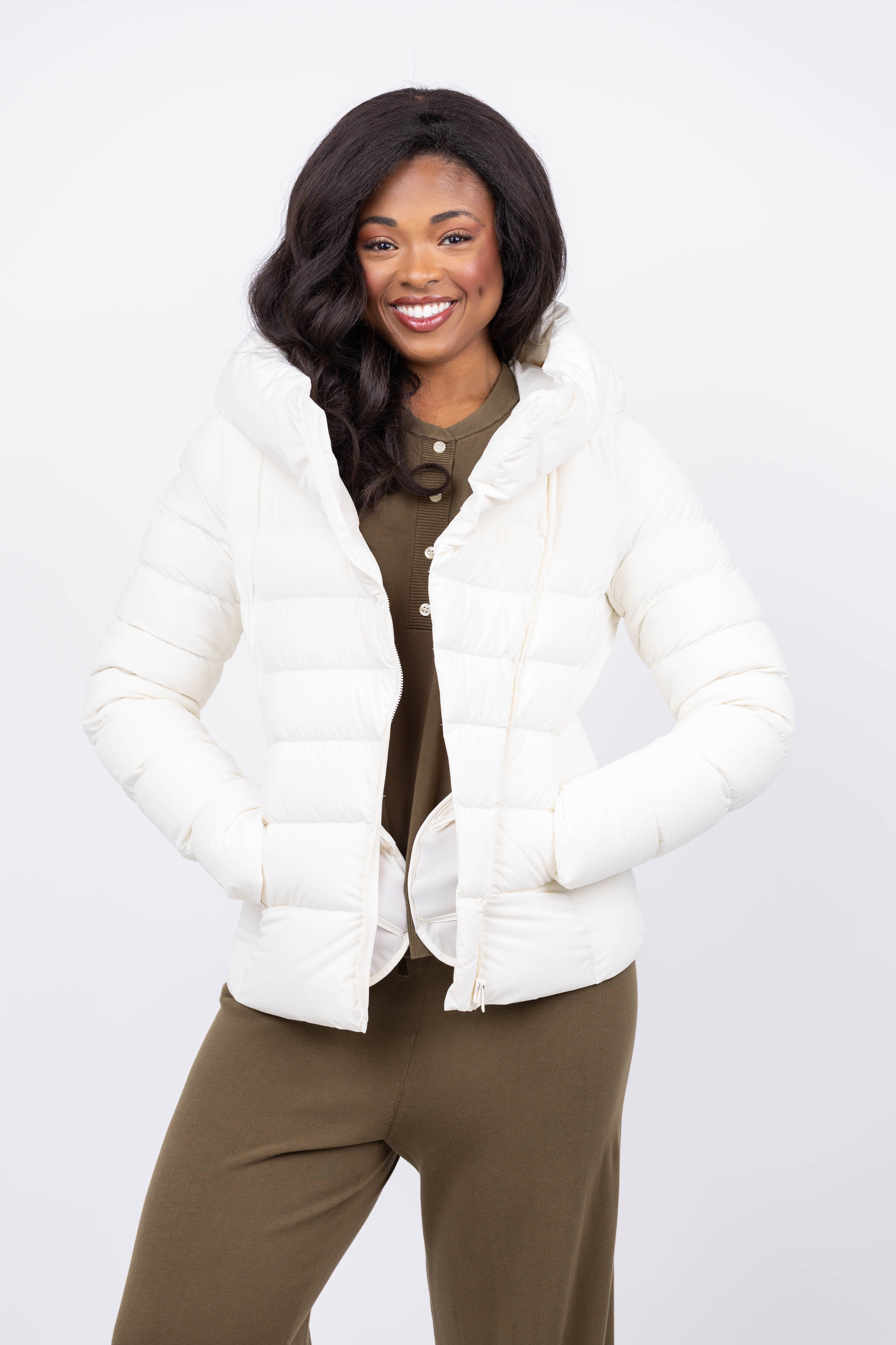 The SOIA & KYO Judy Puffer Coat in Powder combines flattering stretch fabric with lightweight down insulation, offering both style and warmth. Its slim fit features unique channel quilting and an asymmetric front zip for a modern edge. Finished with a water-resistant shell, it ensures you stay comfortable and protected in any weather—all while looking effortlessly chic.