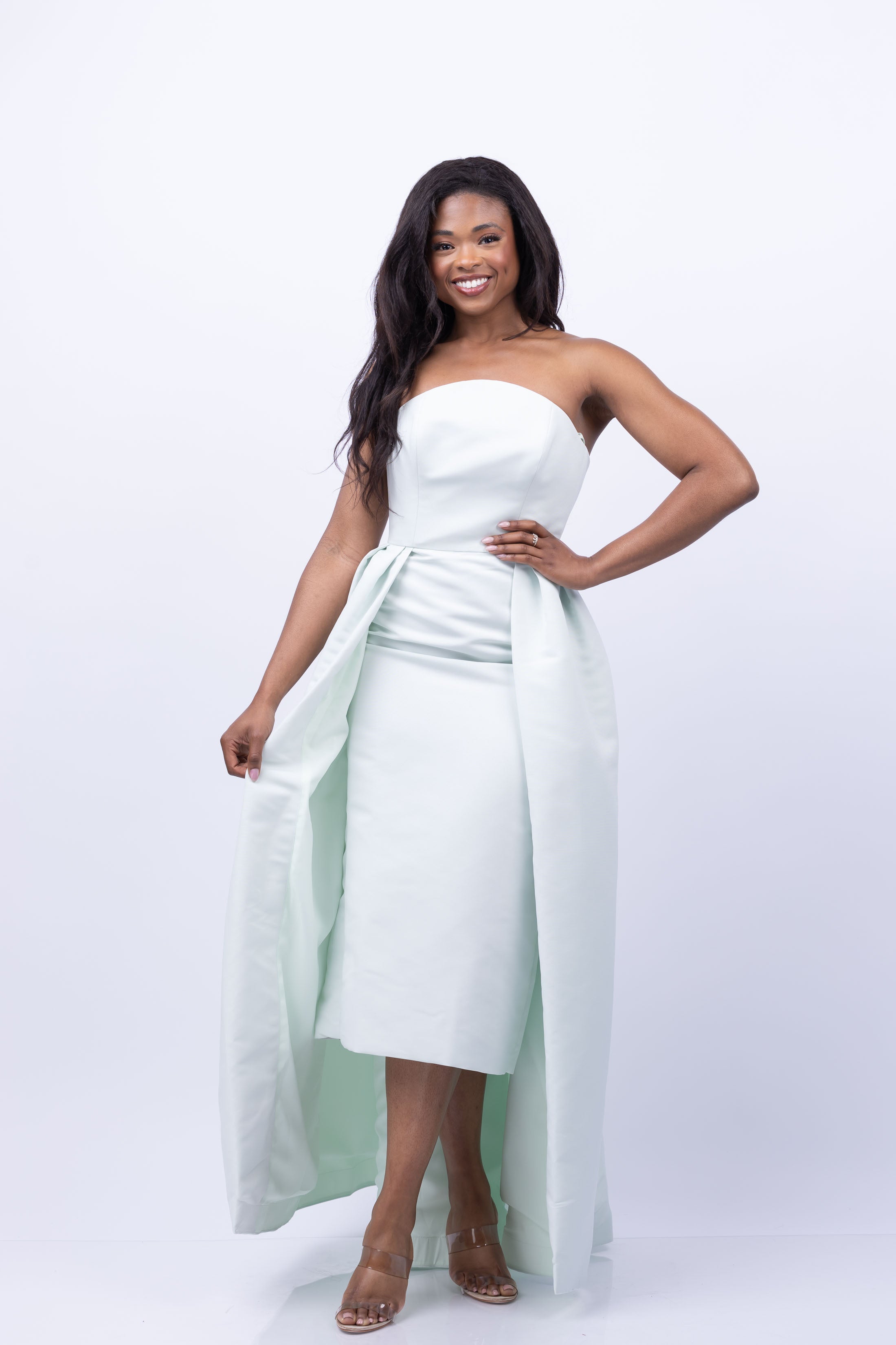 Elevate your style with the Amsale Tea Length Dress in Mint. Featuring a beautiful faille arched neckline and elegant tea-length cut, this dress exudes sophistication. The attached over-skirt adds a touch of drama, making this dress perfect for special occasions. Own the spotlight in this stunning mint dress.