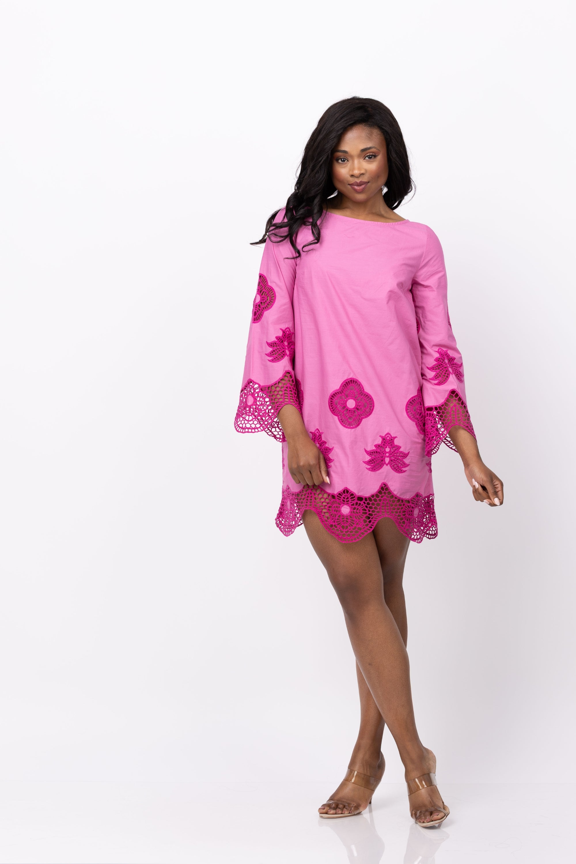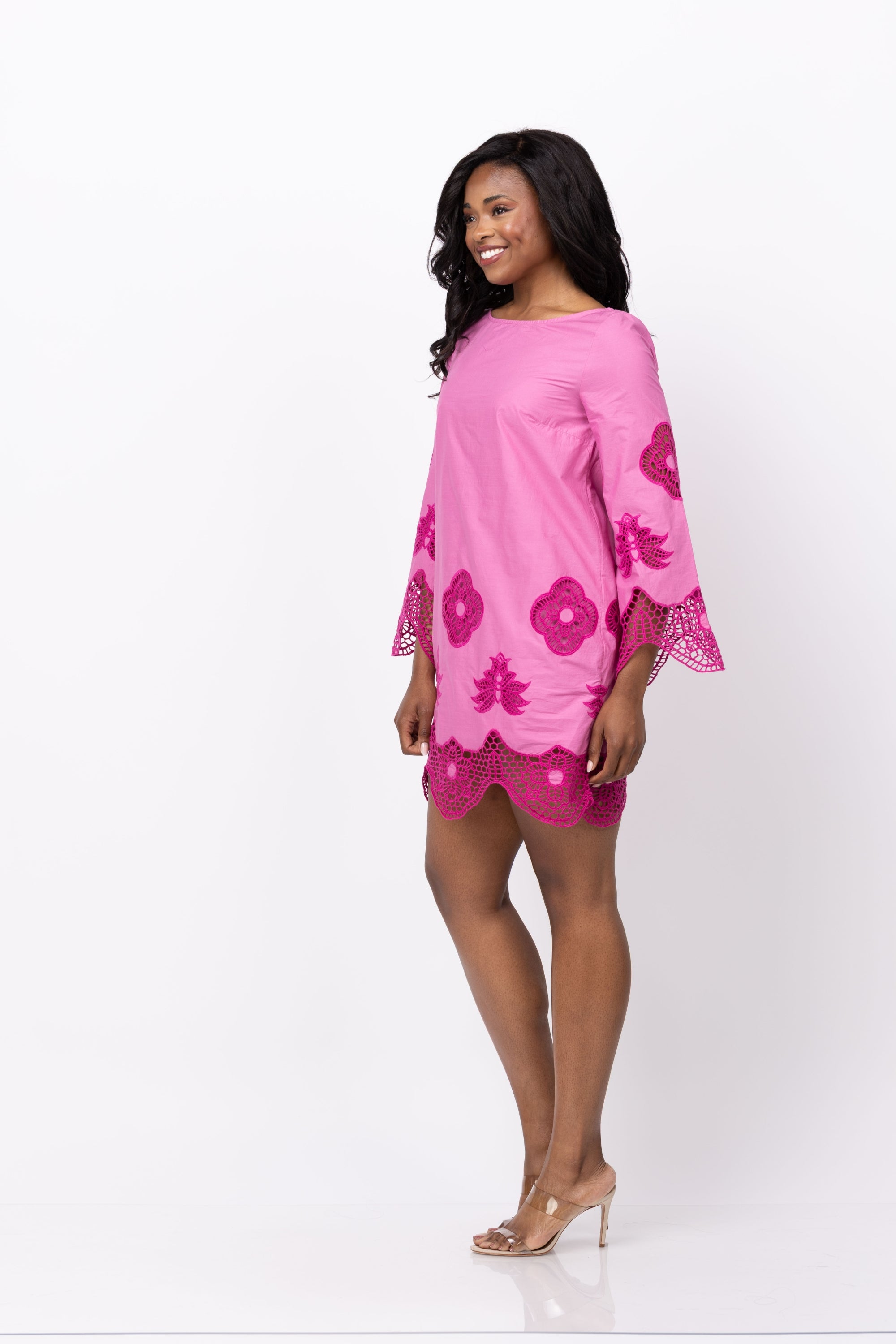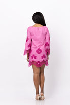 Experience the vibrant versatility of the Misa Los Angeles Gallica Dress! Transition from spring to summer with ease in this fuchsia cotton dress, featuring delicate embroidered lace details. The boat neckline and three-quarter length sleeves add a refined touch, while the fully lined dress guarantees all-day comfort. Perfect for any occasion, pair with sandals for a effortless daytime look.
