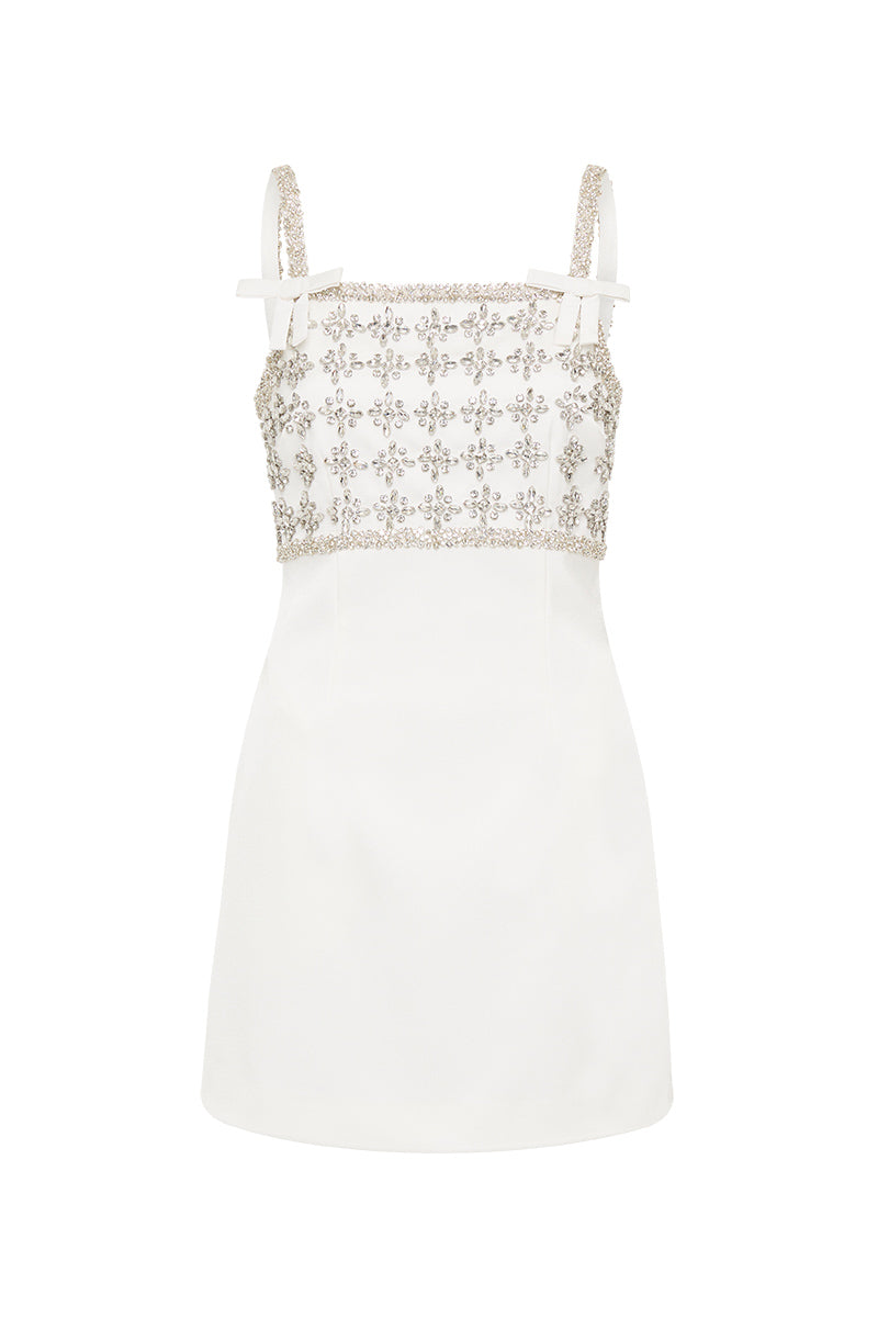 Elevate your style with the Rebecca Vallance Lia Strap Mini Dress. Adorned with diamanté embellishments and a playful bow detail, this crêpe dress features a chic square neckline and slim straps for a sparkling and elegant look. The fitted bodice and A-line skirt flatter your figure, while side seam pockets and a back zip fastening add both practicality and style. Perfect for any occasion, this lined dress will make you stand out in the crowd.
