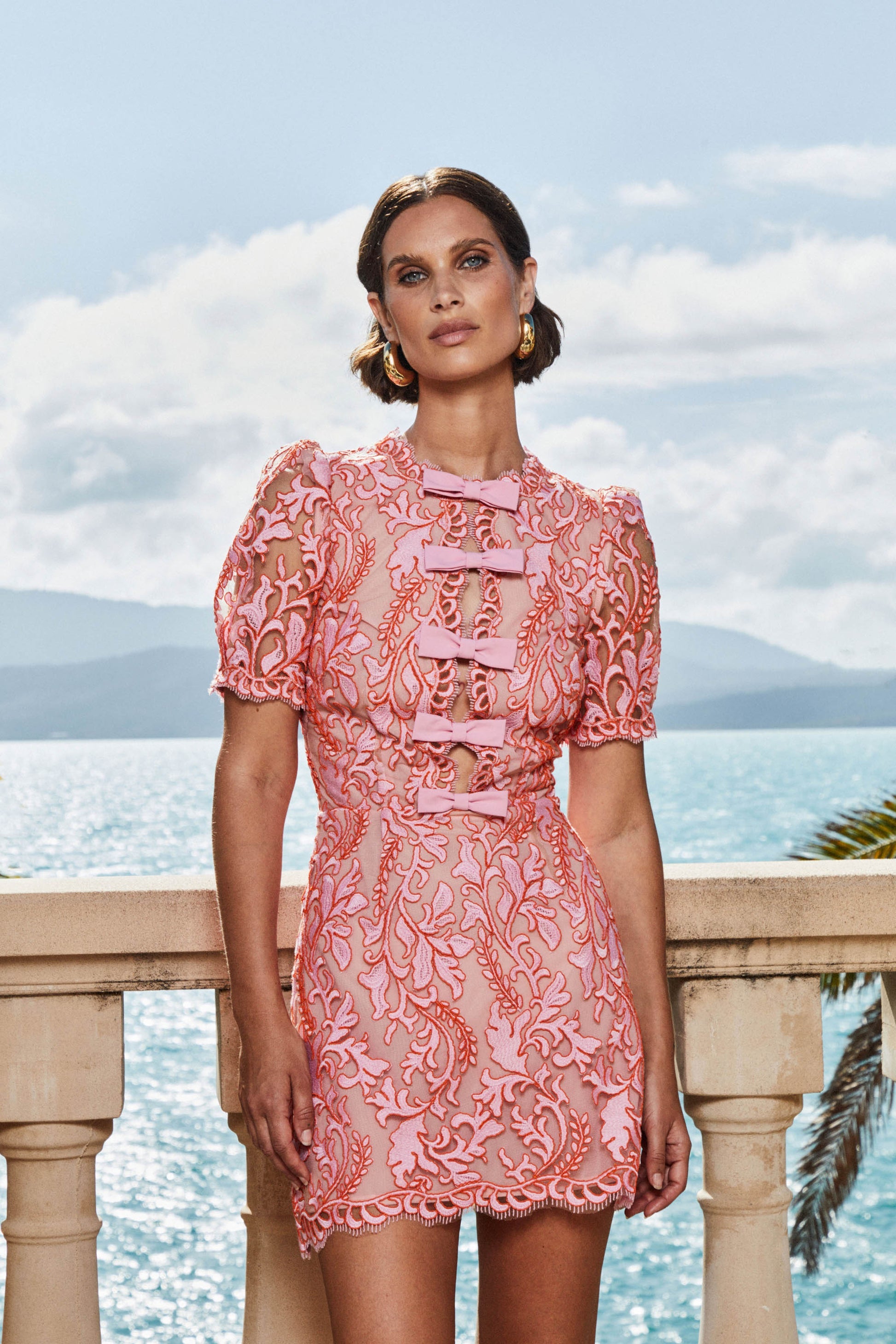 The Maribella Bow Midi Dress in pink combines elegance with playful details. Its rounded neckline and scalloped short sleeves frame a fitted bodice featuring chic front cutouts and a stylish bow accent. The cinched waist flatters your silhouette, while the A-line mini skirt with a scalloped hem adds a refined finish. Fully lined and secured with a back zip, this dress offers both comfort and sophistication—ideal for making a memorable impression.