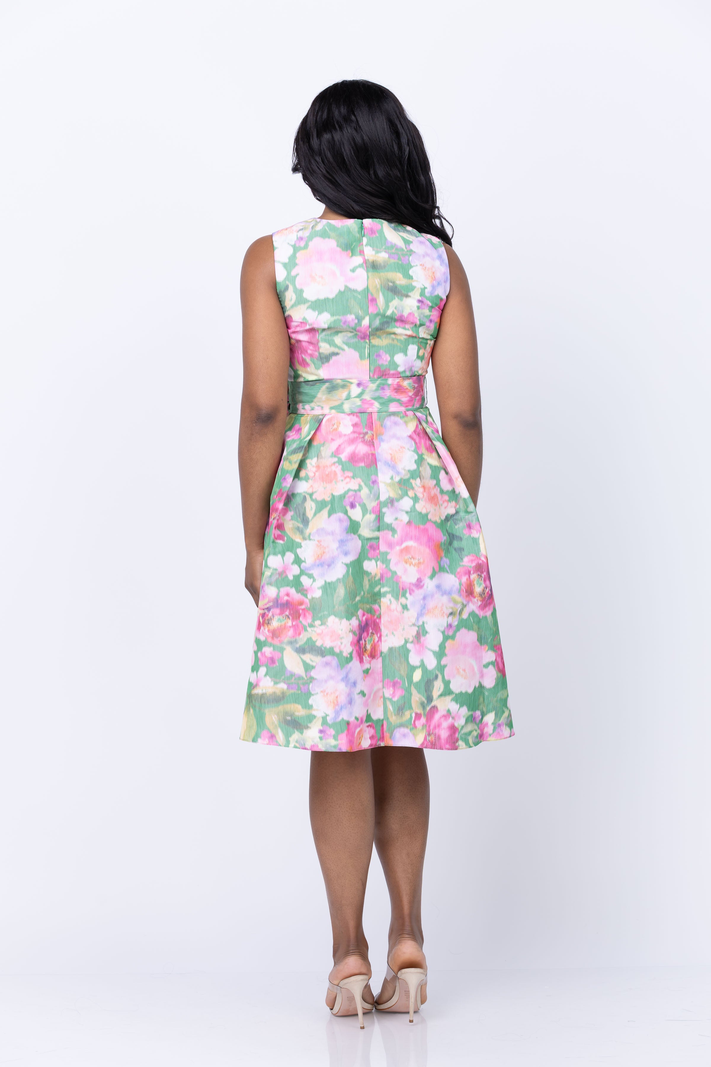 Elevate your cocktail attire with the Shoshanna Keegan Dress In Kelley Multi. Crafted from a stunning floral taffeta, this dress features a timeless round neckline and sleeveless bodice. The full-volume skirt with high low hemline and tie belt adds a touch of whimsy to this sophisticated style. Perfect for any special occasion, this dress is fully lined and includes a hidden back zipper for a flawless fit.