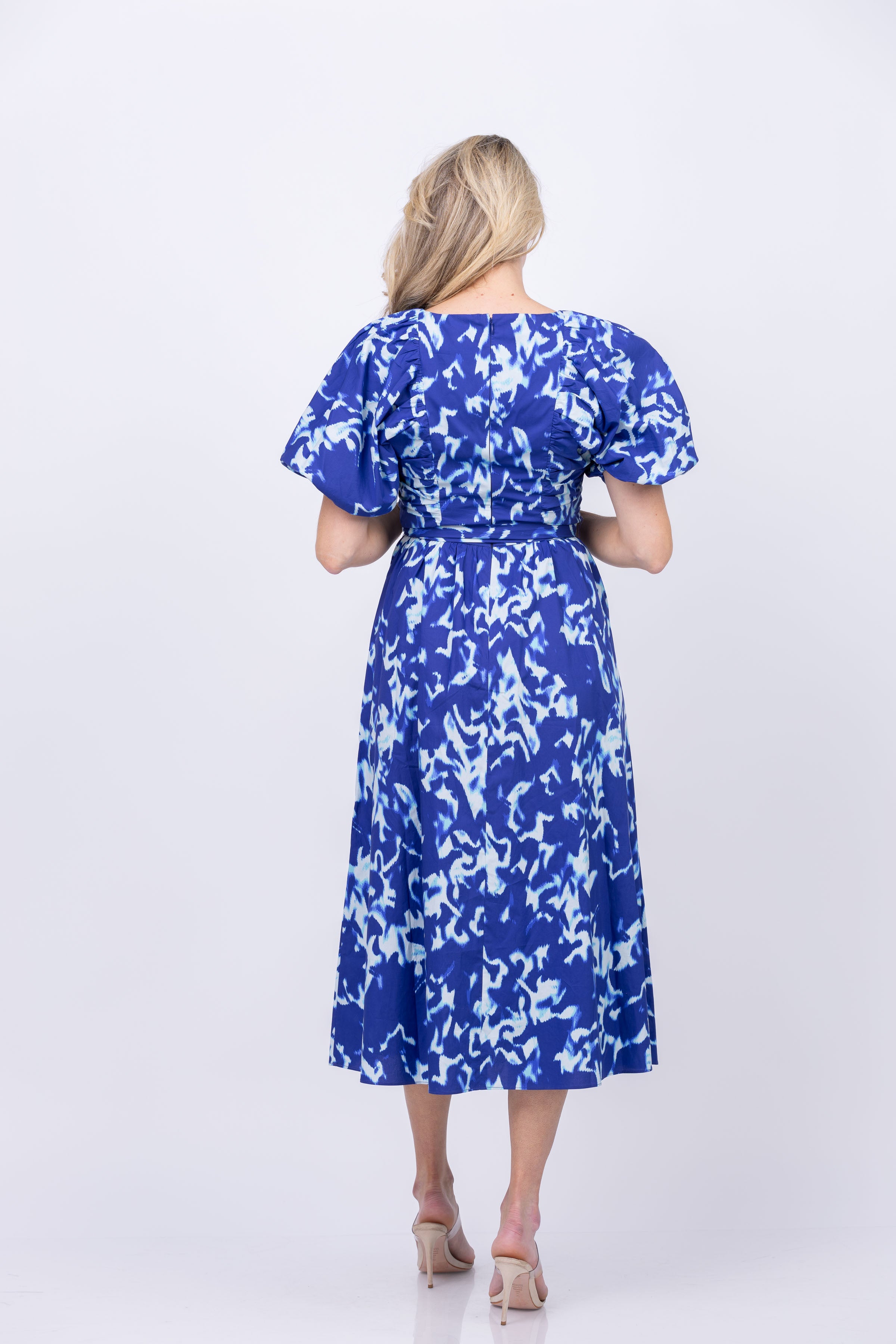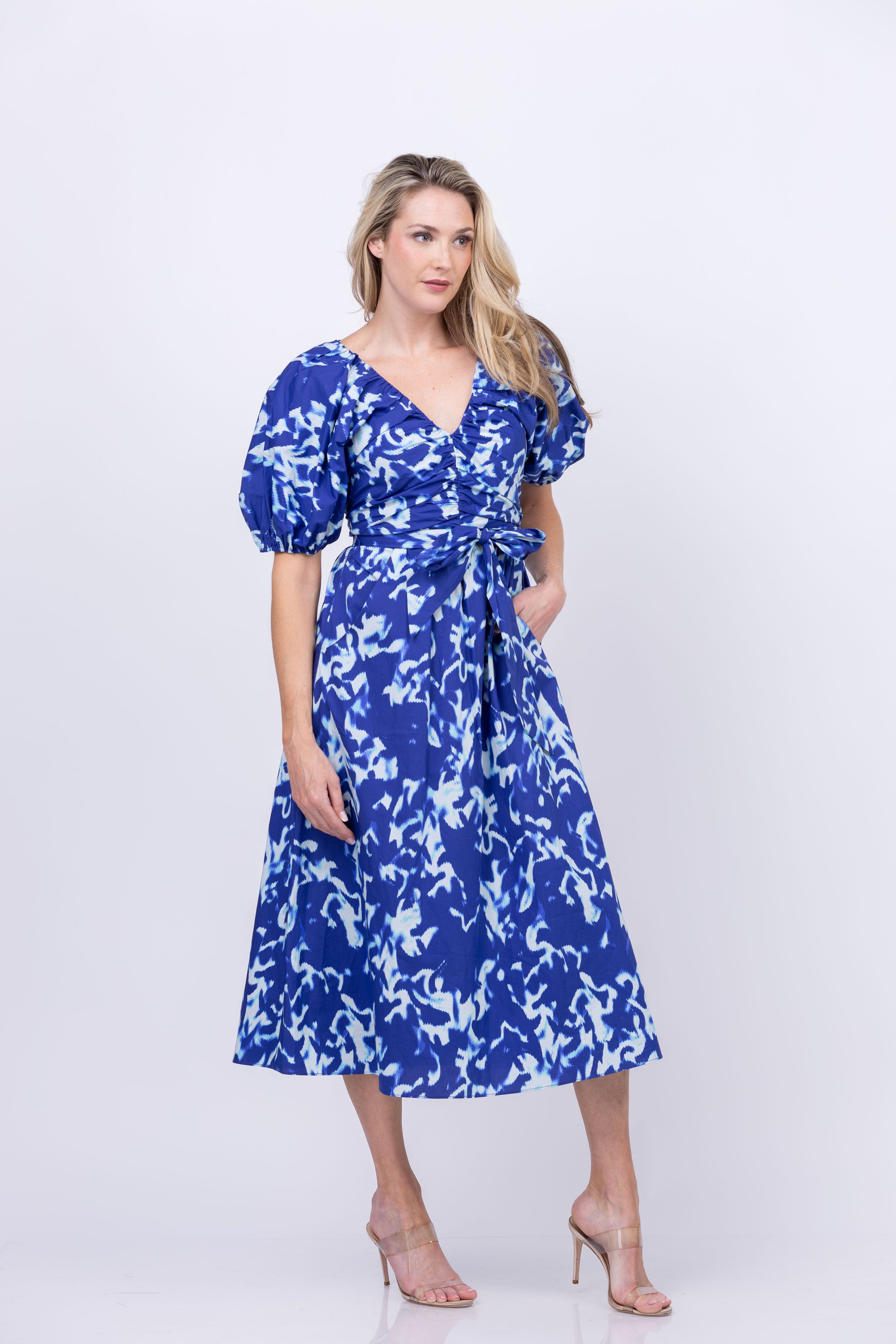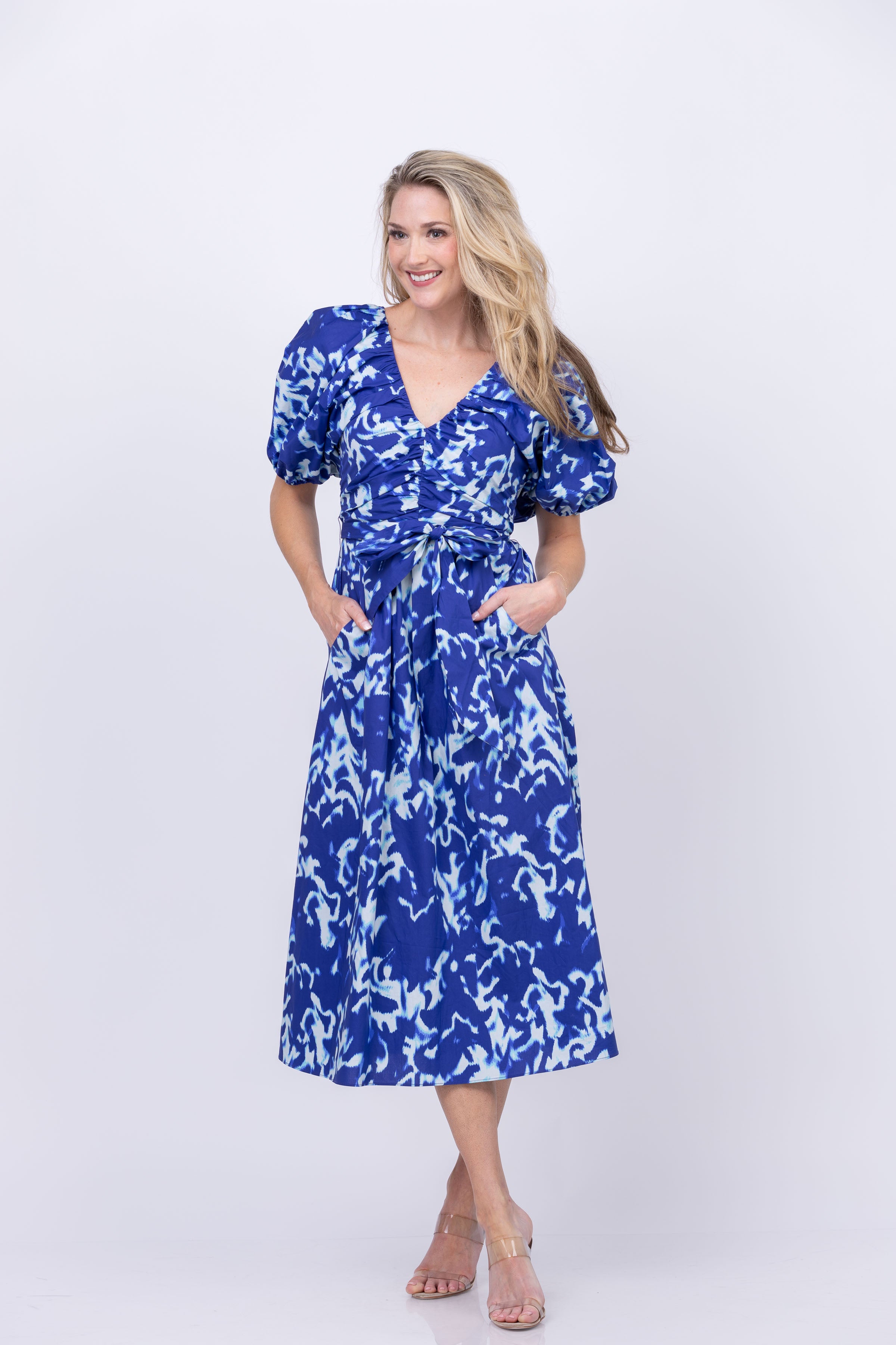 Embrace the effortlessly chic style of the Gilner Farrar Kayson Dress in Waves. Featuring a 3/4 sleeve sheered v-neck design and convenient pockets, this midi dress combines both fashion and functionality. Stay comfortable and on-trend with every wear.