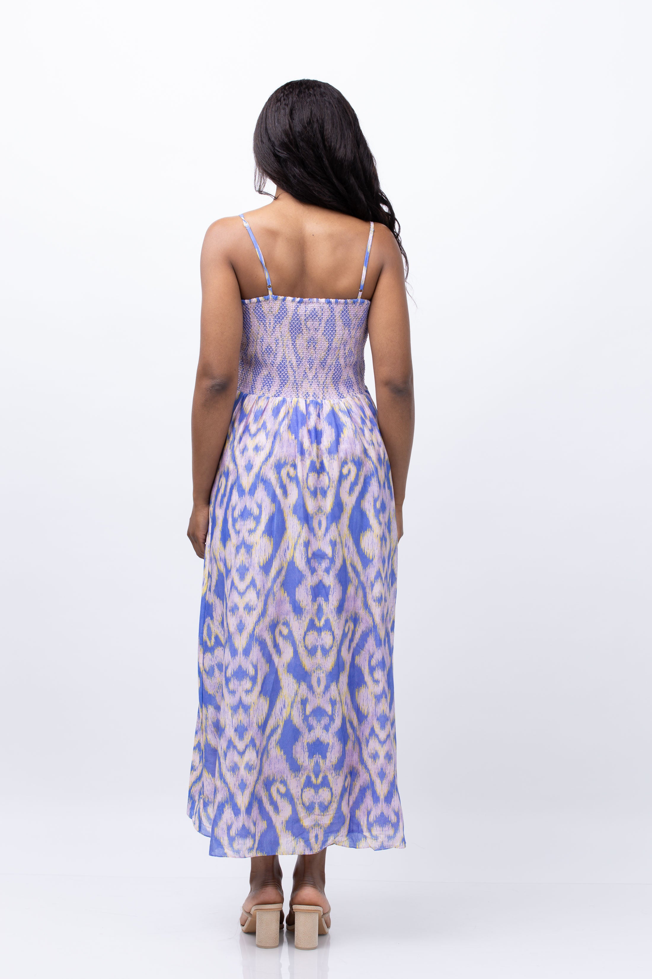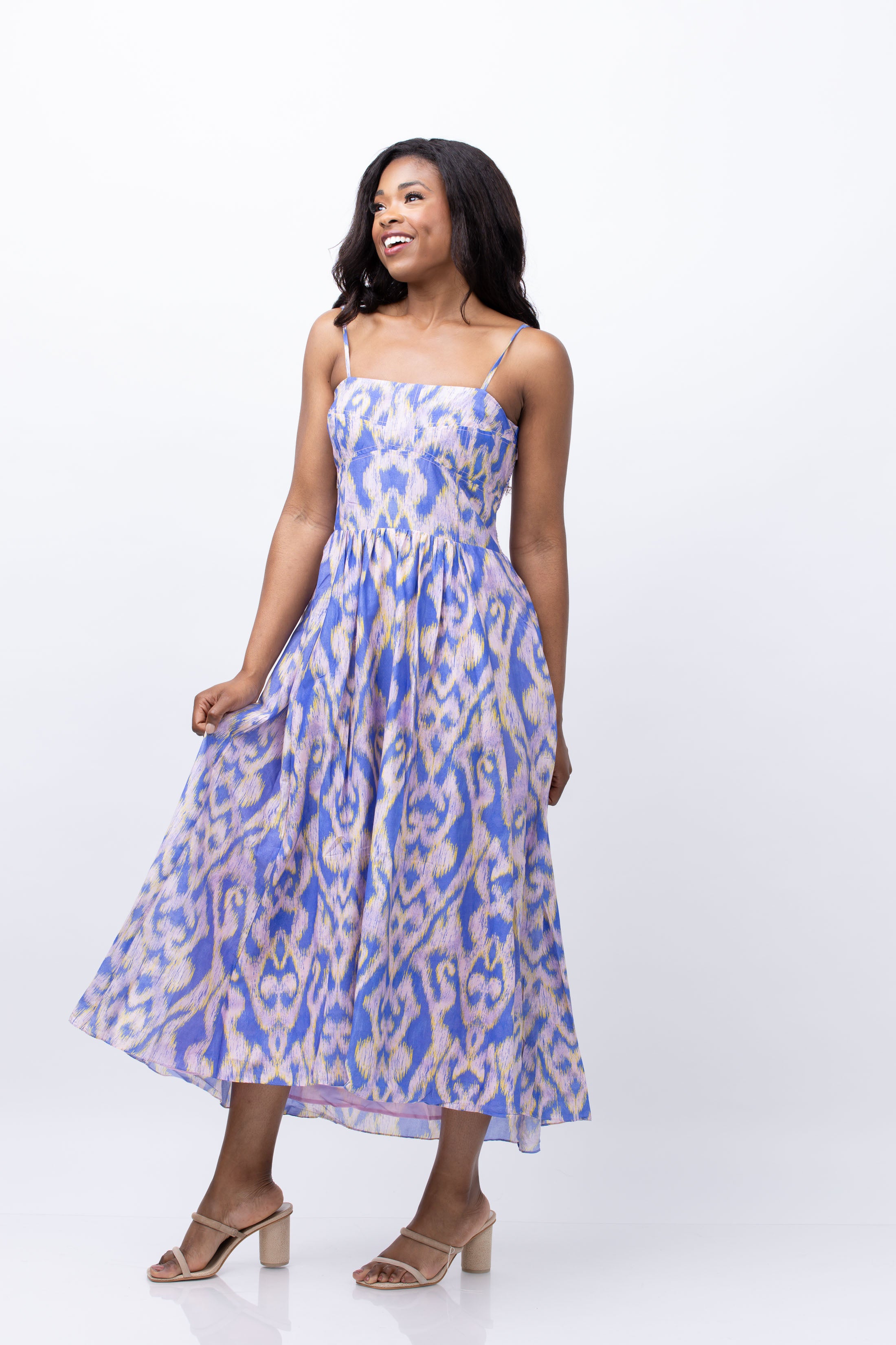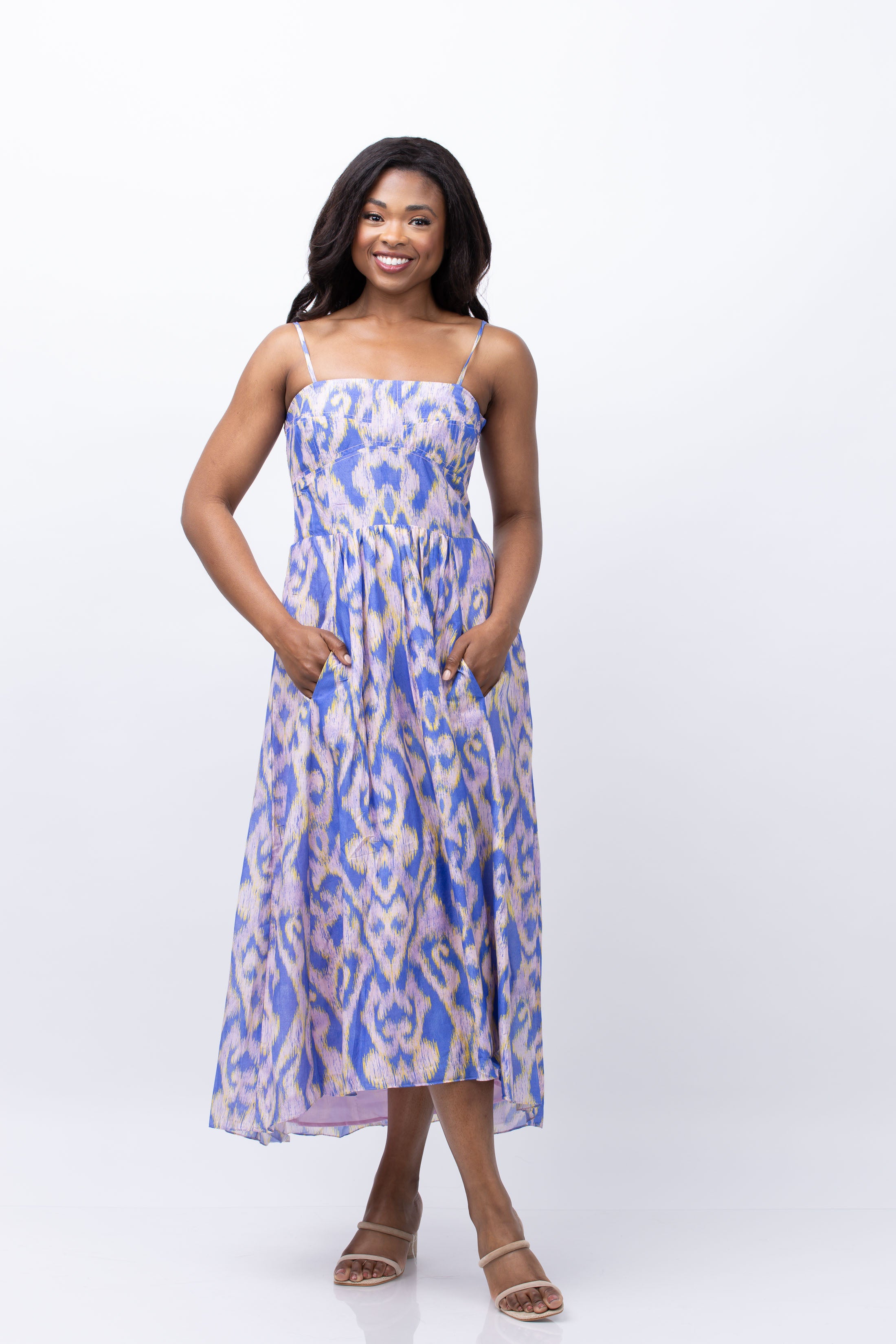 Experience the allure of our Maria Cher Moreno Maive Midi Dress in Ethnic Lavander. Made from a luxurious blend of cotton and silk voile, this charming dress features a straight cut neckline and slim straps that provide the perfect support. Radiate effortless elegance with every step in this stunning piece.