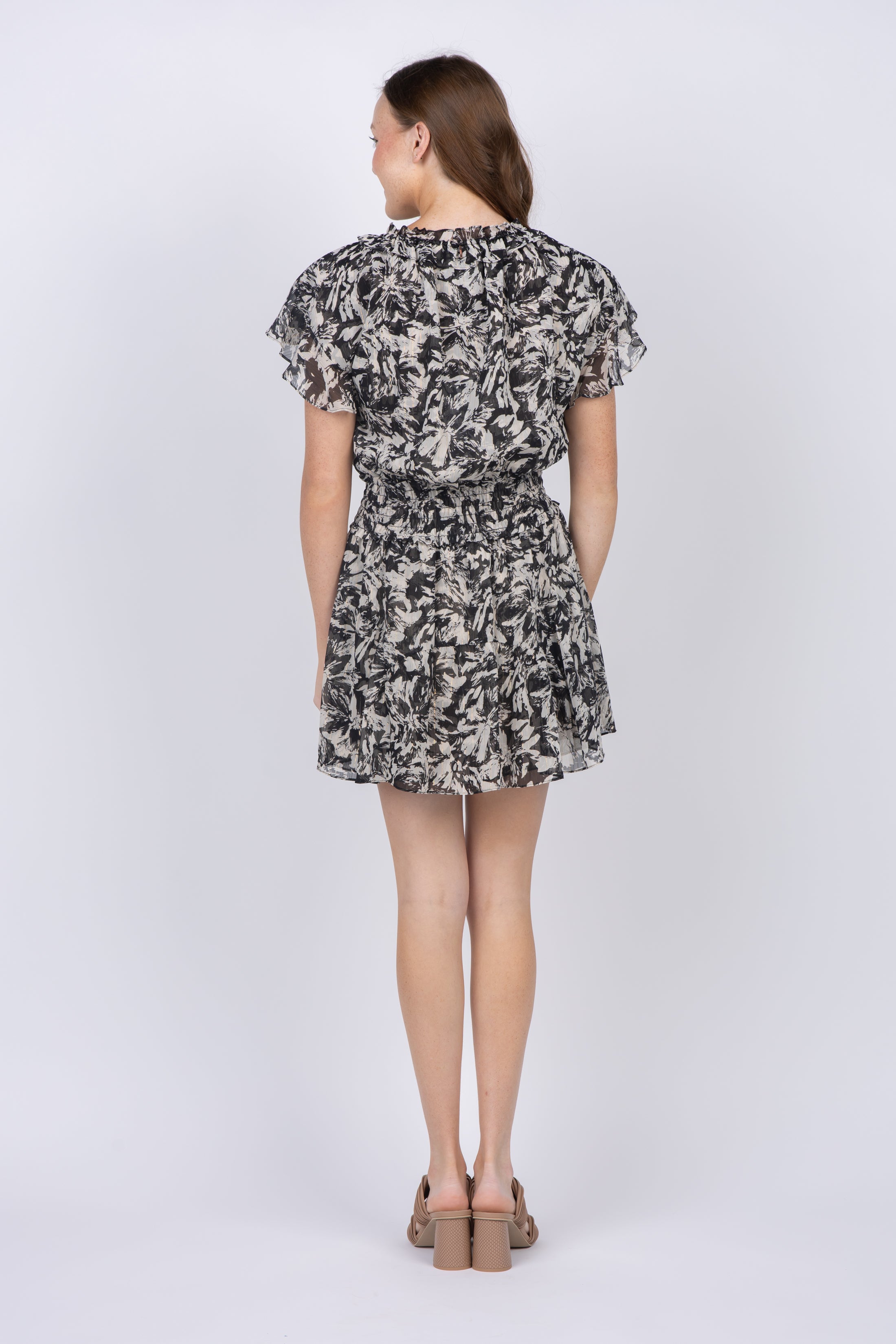 Look and feel splendid in this Misa Los Angeles Natalia dress in a tonal abstract print. With a romantic ruffle collar, flutter sleeve, smocked waist, and tiered skirt, you'll love the feminine detailing and flowing silhouette. Crafted from 100% polyester chiffon fabric, you can feel confident and beautiful every second you wear this classic fit dress.