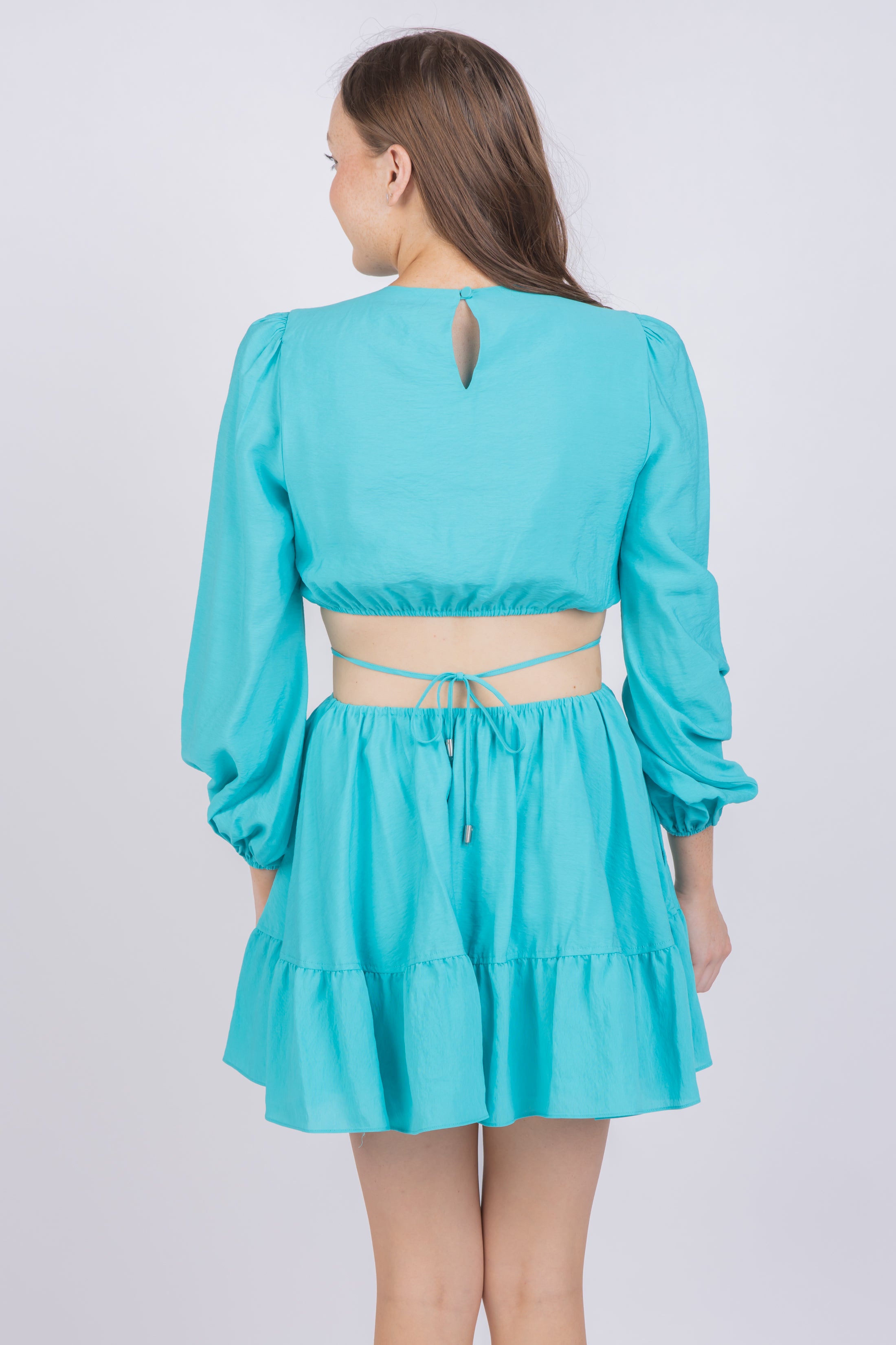 Turn heads in the Simkhai Issy Dress! This stunning summer staple features billowy long sleeves and a vibrant turquoise hue – perfect for that tropical vacation or special night out. Exude confidence and elegance.