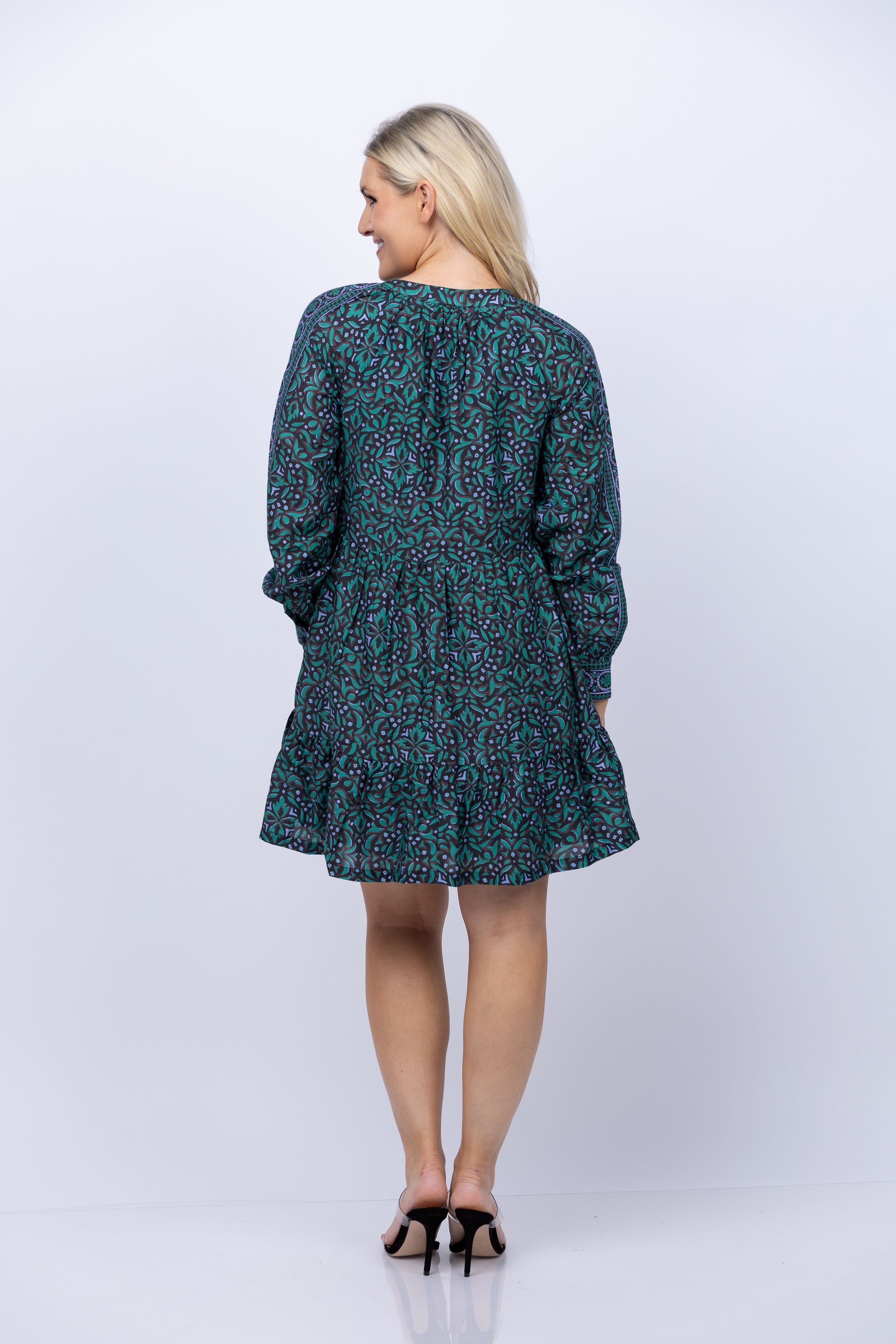 Discover effortless elegance and timeless style in XiRENA's Lilith Dress. Crafted from luxurious cotton silk twill and adorned with a beautiful woodblock medallion print, this tiered mini dress features a round neck, self-covered buttons, side seam pockets, and a charming border printed front yoke, sleeves, and cuff. Enjoy elegance and comfort with every wear!