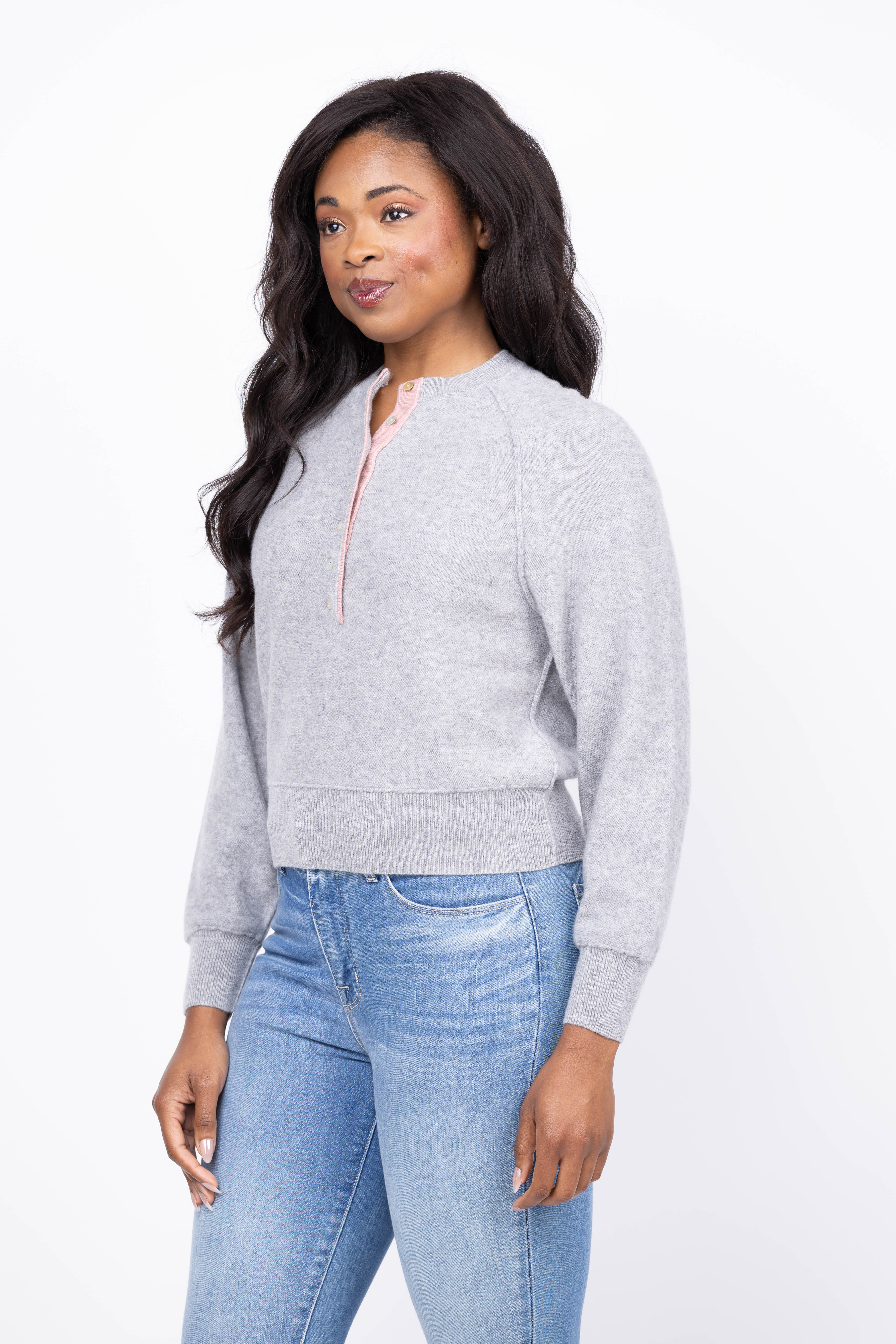 Experience cozy luxury with the Design History Henley Pullover in Oxford Combo. This cashmere sweater features a classic button-front Henley design, enhanced by striking pink contrast details for a fun touch. Perfect for layering or wearing solo, its soft fabric keeps you warm while adding effortless style to your wardrobe. Elevate your everyday look with this versatile and timeless pullover.