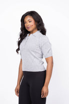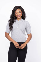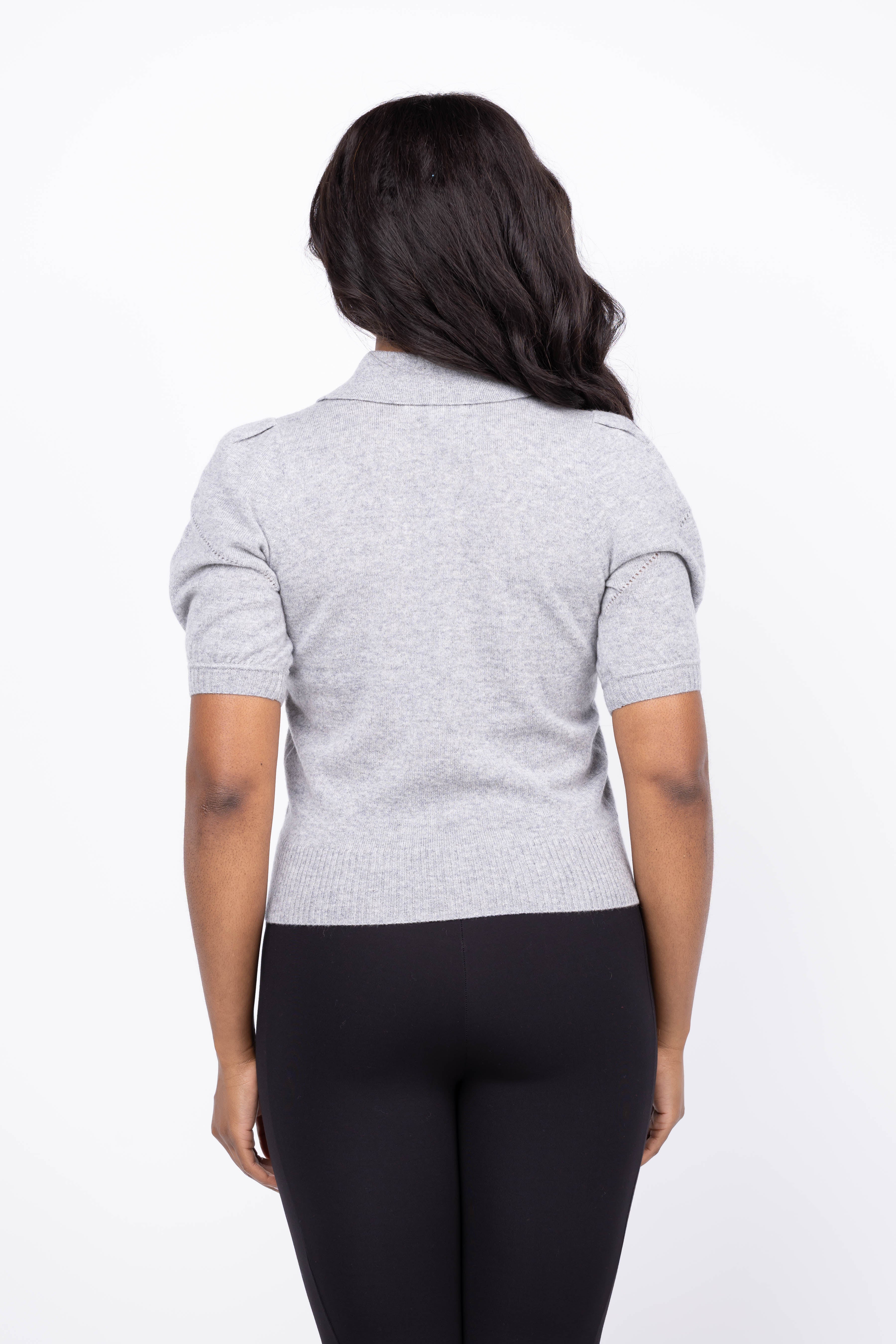 Elevate your wardrobe with the Design History Puff Sleeve Sweater in Oxford. Crafted from soft cashmere, this short-sleeve sweater features elegant puff sleeves and delicate eyelet detailing on the shoulders for a subtle touch of charm. The classic collar and henley-style button front add versatile sophistication, making it perfect for both casual days and refined occasions. Experience cozy luxury with a stylish edge.