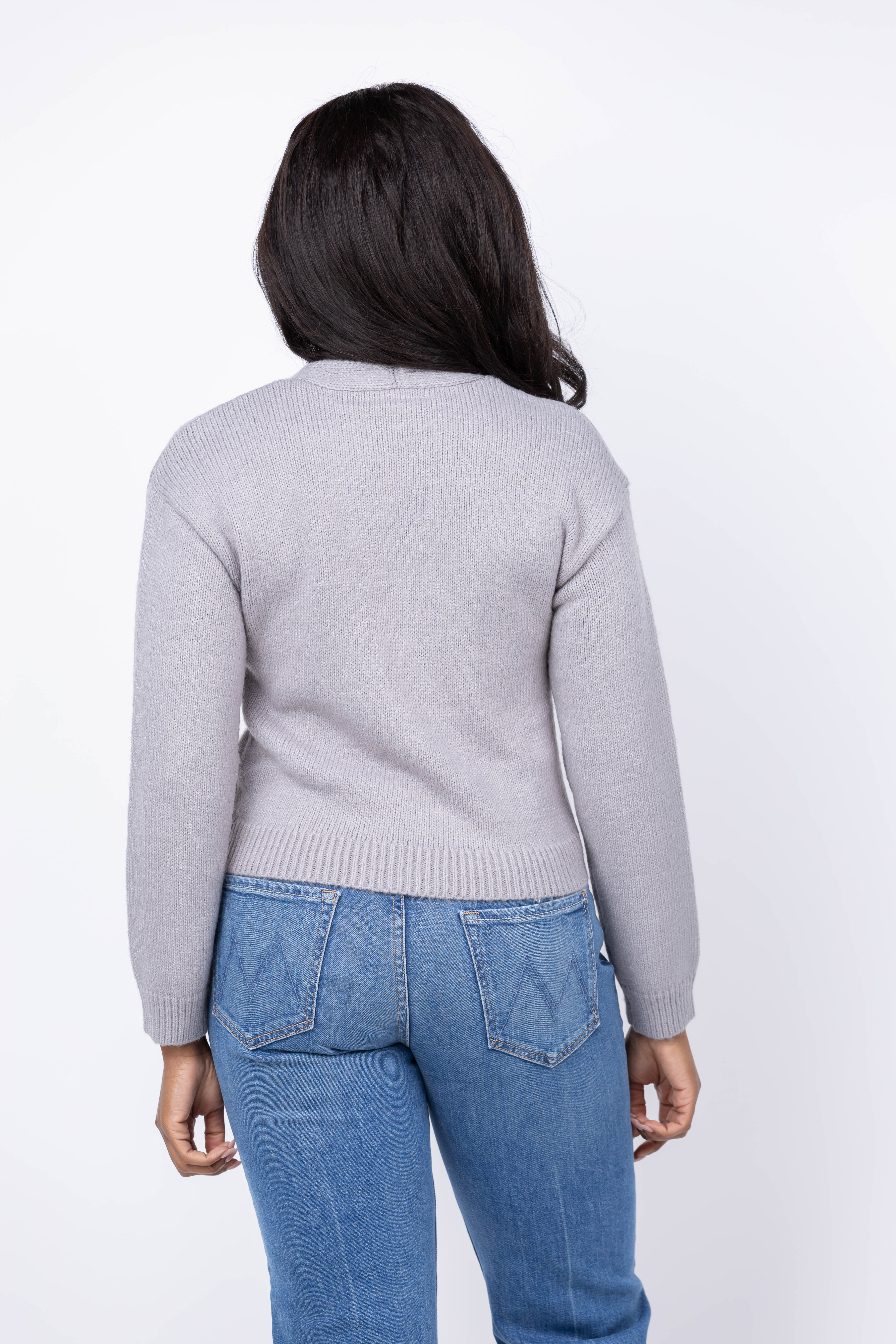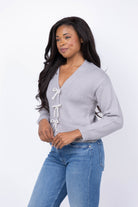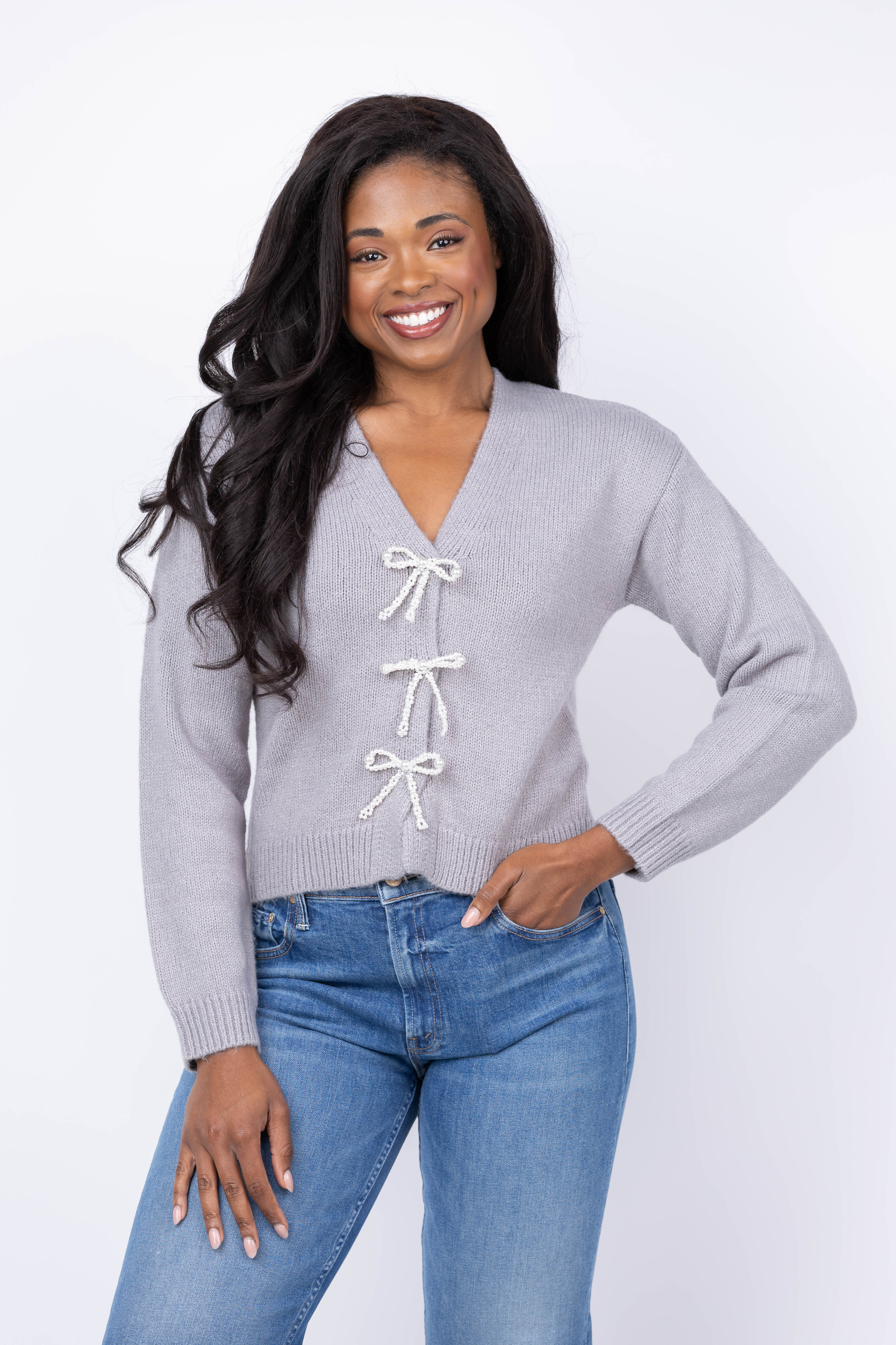 Design History V-Neck Gem Bow Cardi in Silver Mist