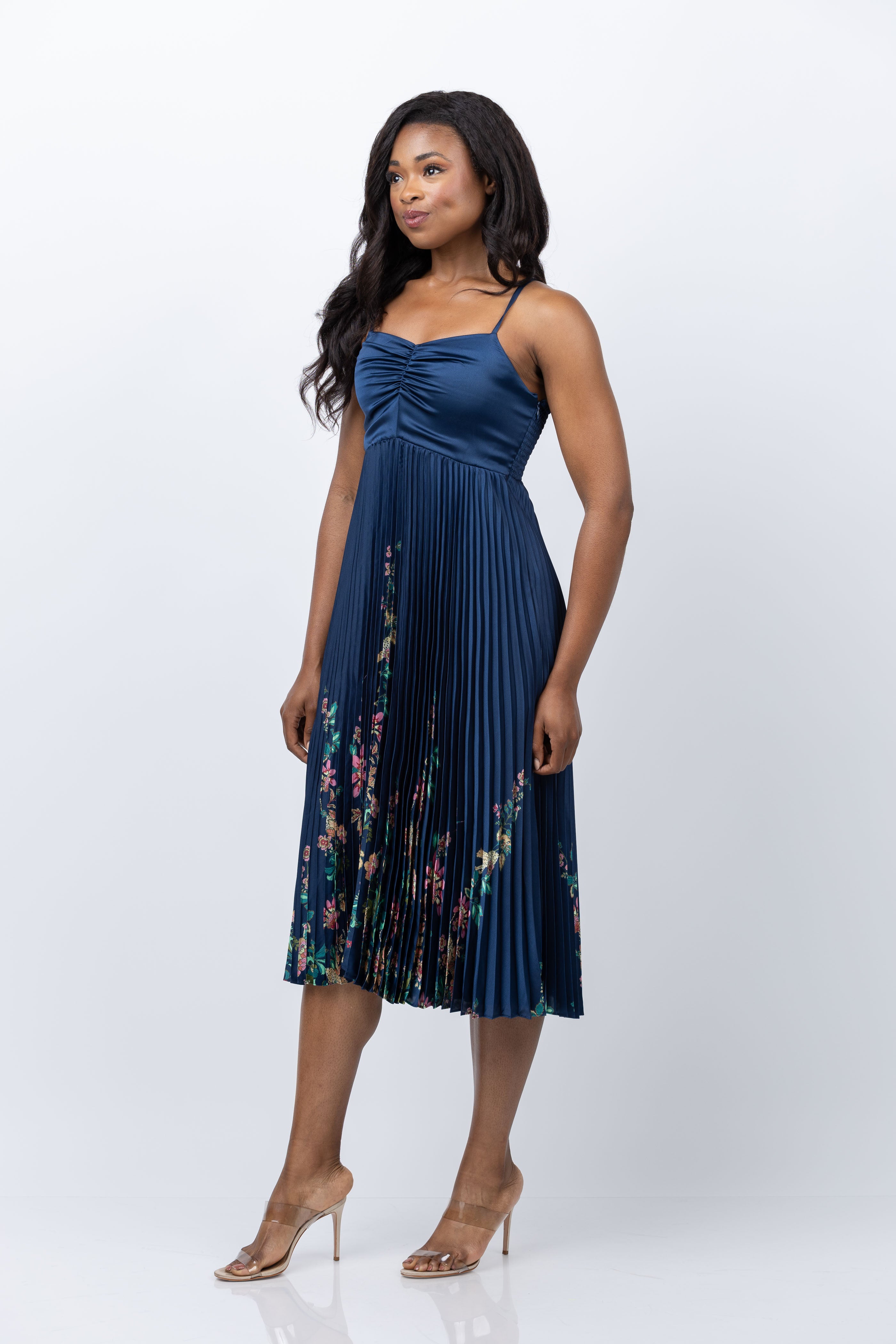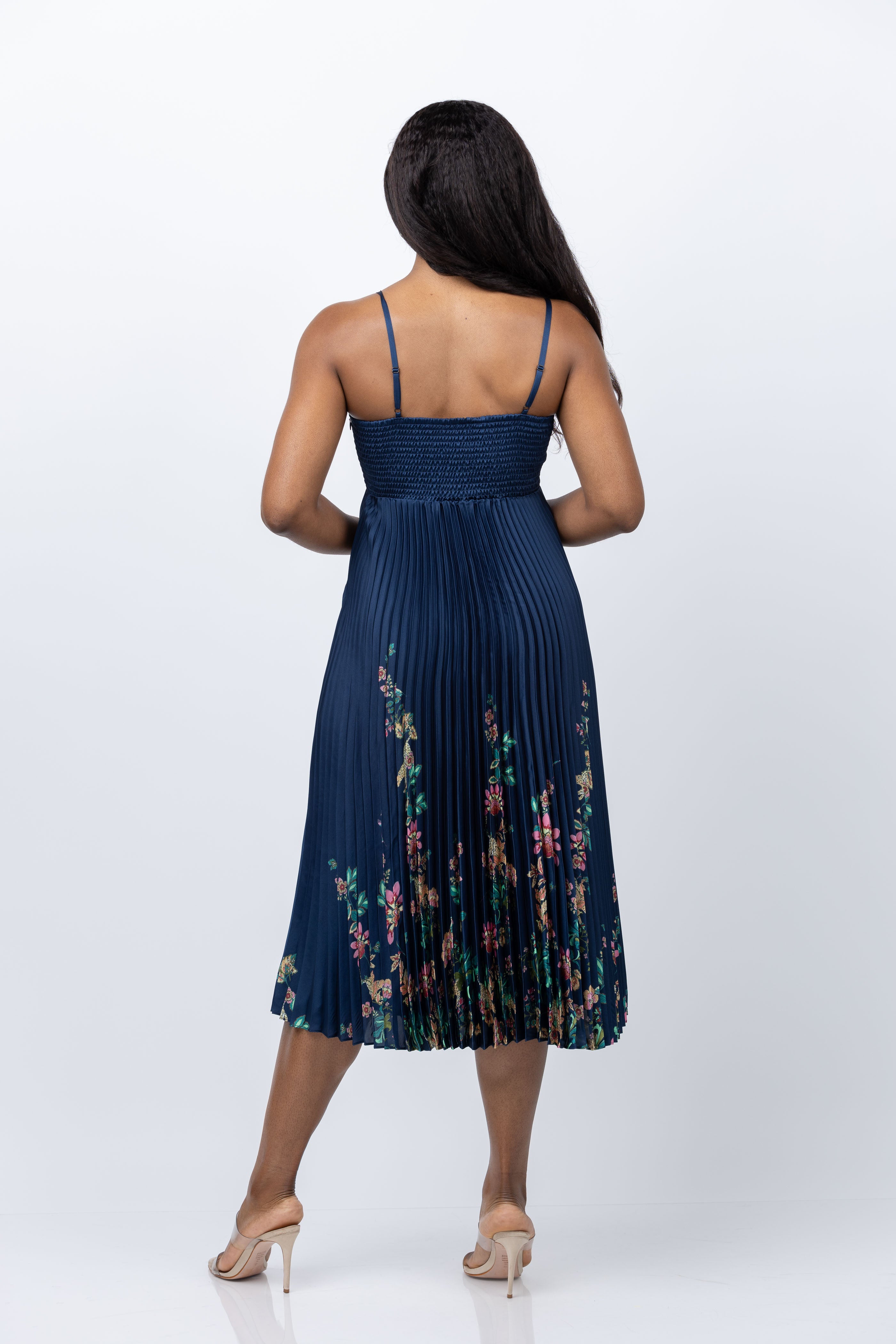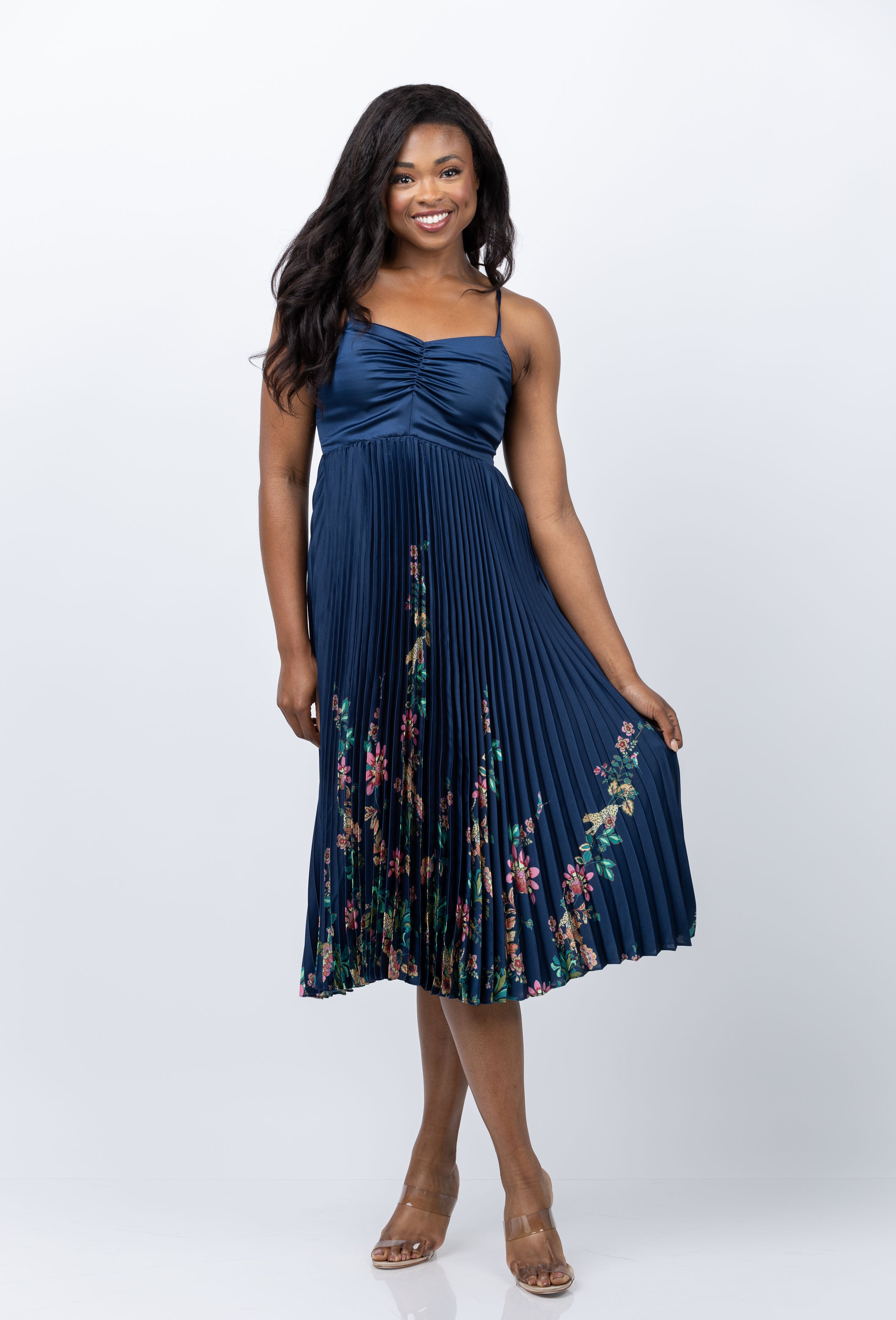 Turn heads in the Donna Dress! This vibrant midi dress features a strappy, ruched bodice with adjustable straps and smocking for the perfect fit. Move around with ease in the swingy pleated skirt; you'll be the star of the show! 100 % Polyester. Gorgeous navy blue print with color flowers at border.