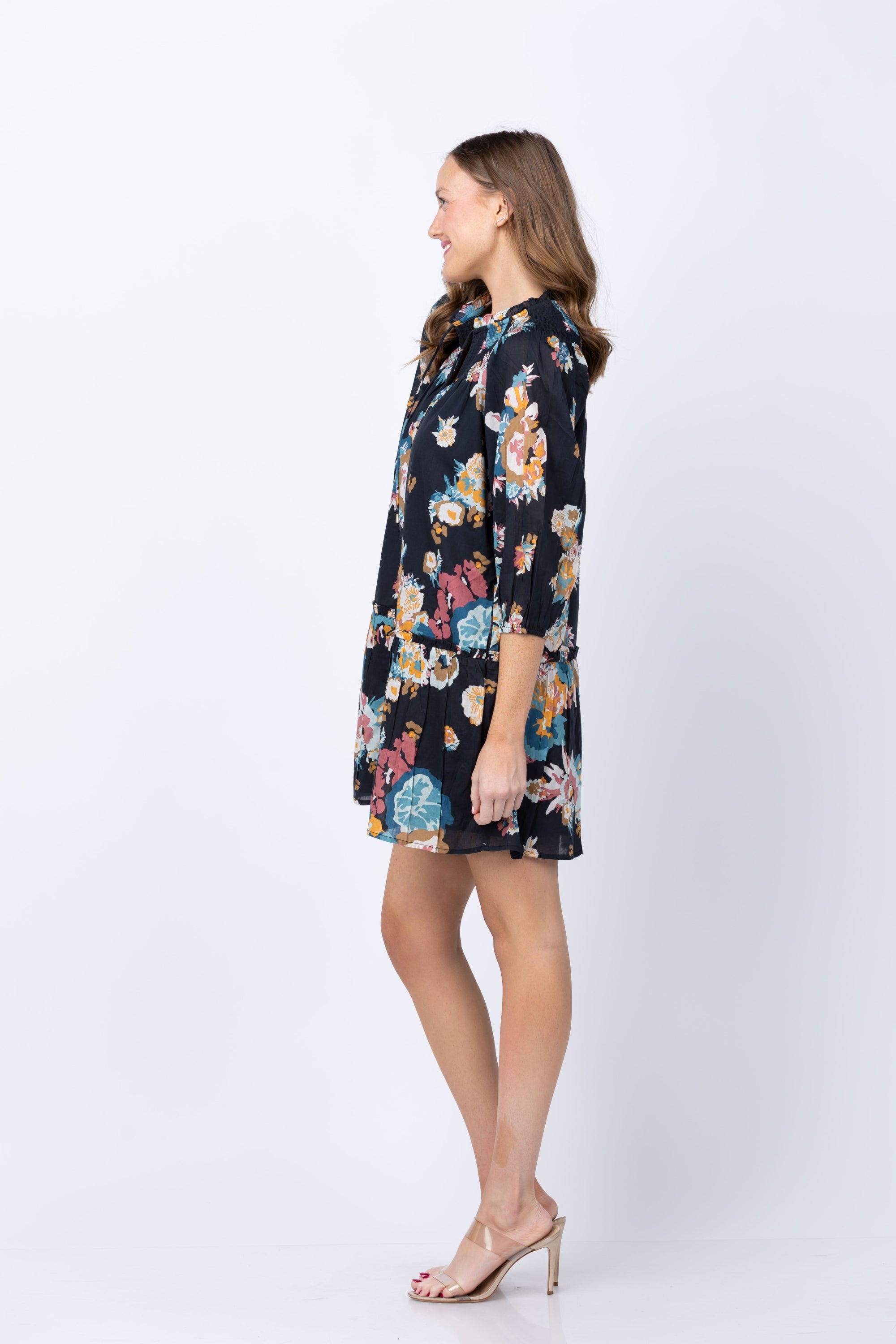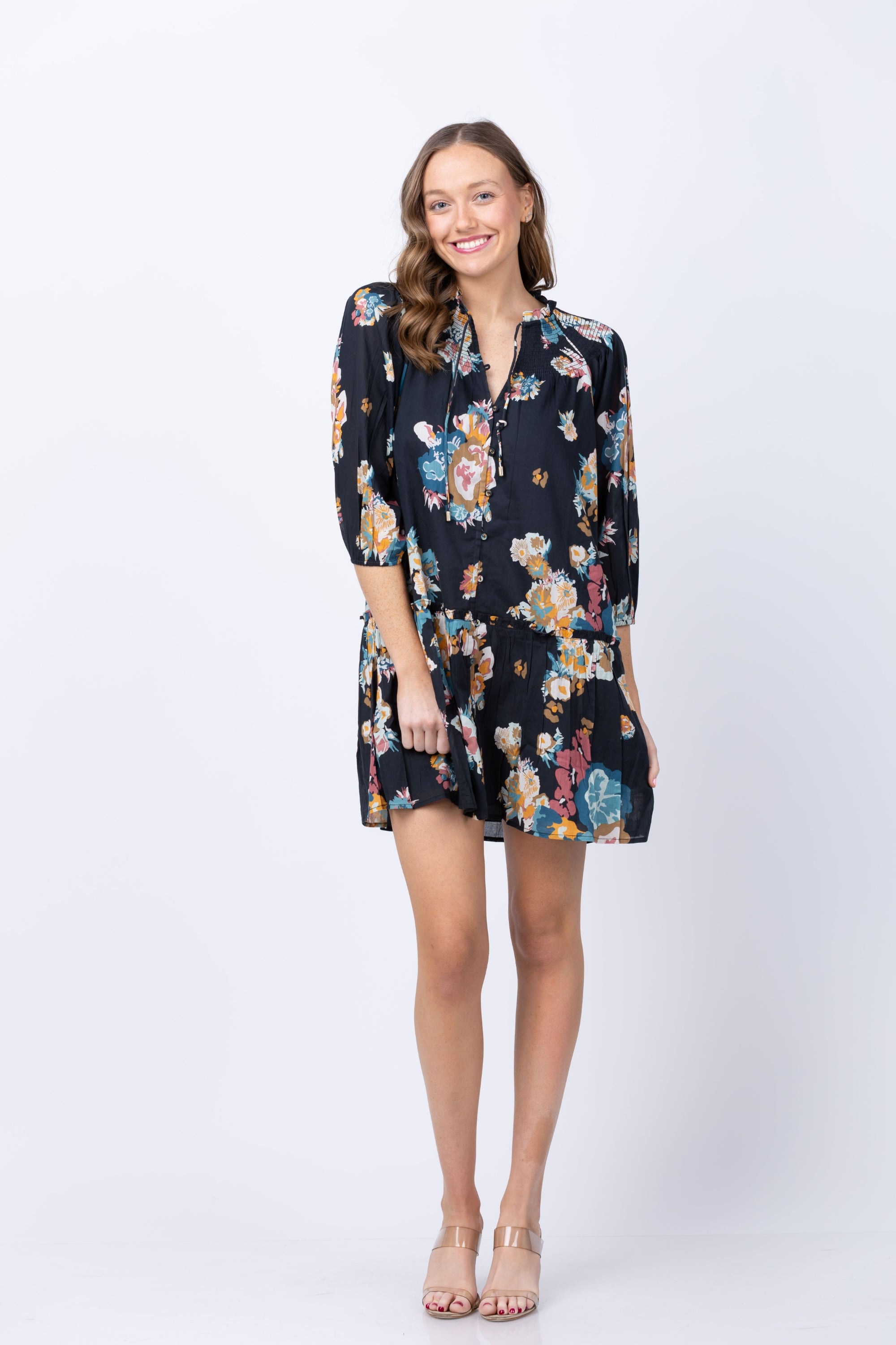 The Cleobella Emmanuelle Mini Dress transforms warm-weather dressing with its captivating Vitet floral print and thoughtfully crafted details. Delicate smocking frames the neckline while a soft necktie adorned with gold beads adds an elegant finishing touch. Voluminous sleeves and a tiered mini skirt create effortless movement and a flattering silhouette that feels both playful and refined. Whether you're heading to a weekend brunch, tropical getaway, or casual gathering, this dress delivers the perfect blend of comfort and style—a versatile piece that makes every occasion feel special.