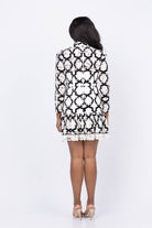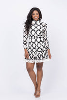 Elevate your wardrobe with the Milly Willa Velvet Flock Mock Neck Dress in White/Black. Crafted from delicate white lace, this long sleeve dress features a striking black velvet geometric print that adds sophisticated contrast. The modest mock neckline and flounce skirt create a flattering silhouette perfect for any occasion. Combining elegance with a modern edge, this dress ensures you stand out with understated confidence.