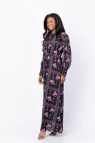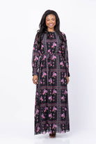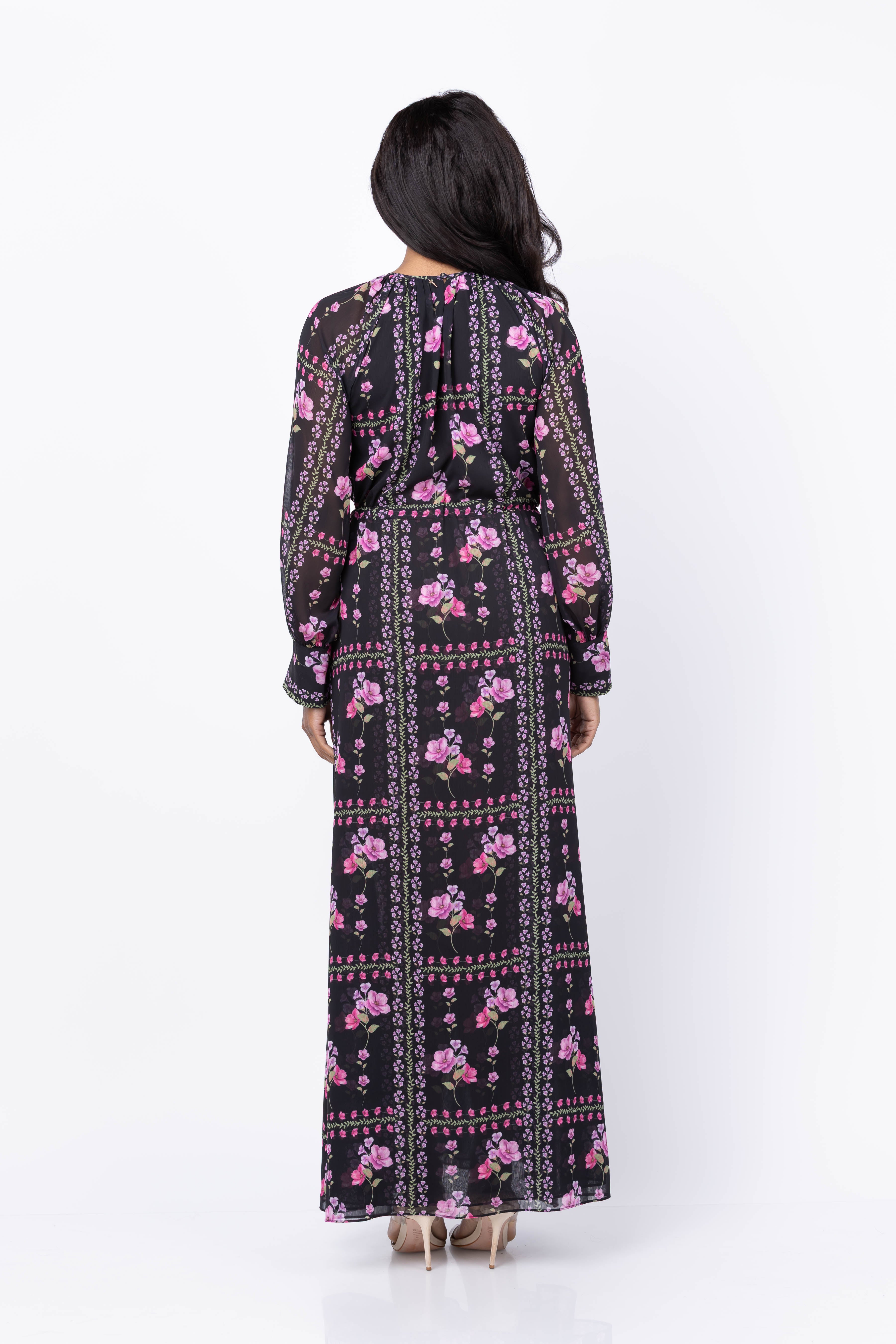 Introducing the MISA Los Angeles Moira Dress—a sophisticated maxi that effortlessly bridges day and night. Crafted from luxurious Midnight Lattice printed chiffon, this timeless piece features a double-lined bodice and skirt for refined structure. The high gathered neckline and adjustable tie waist create a flattering silhouette, while sheer blouson sleeves with structured button cuffs add an elegant touch. Flowing to the ankles with graceful side slits and finished with a keyhole back closure, Moira is the versatile investment piece every wardrobe deserves—seasonless, elegant, and endlessly wearable.