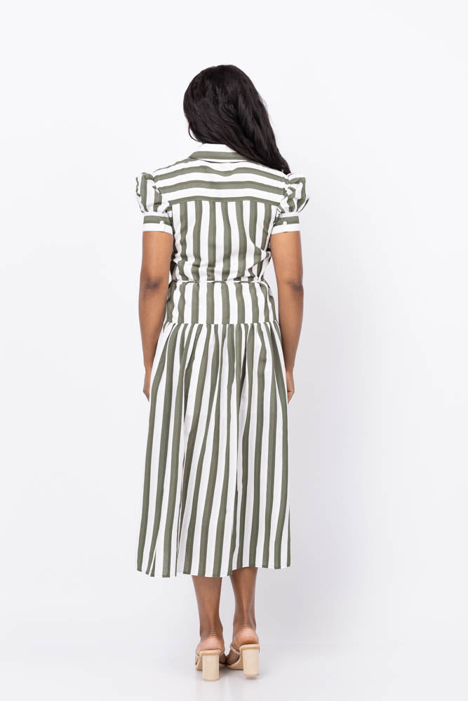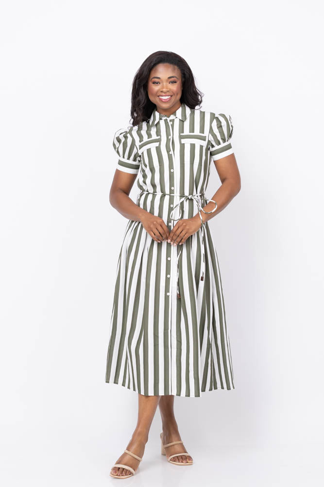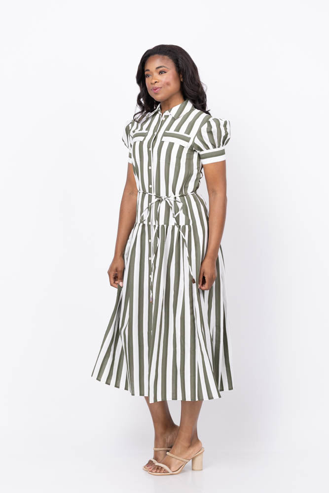 The Tanya Taylor Carrington Dress in Fern/Ivory combines timeless style with effortless comfort. Crafted from lightweight seersucker stripe cotton, it features a flattering tiered skirt, a self-tie waist for a customizable fit, and convenient side pockets. This classic shirt dress silhouette offers a feminine, breezy look perfect for summer days. Pair it with your favorite flats or sandals for a relaxed yet polished daytime outfit that moves seamlessly from casual outings to refined gatherings.