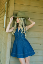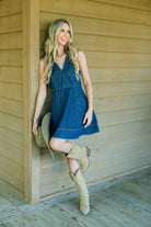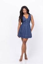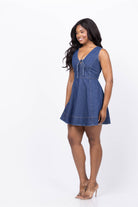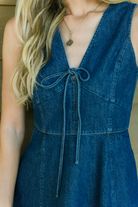The Tanya Taylor Nova Dress in Classic Indigo Blue is a chic denim mini designed to smoothly transition your wardrobe into fall. Crafted from crisp medium indigo denim, it features a flattering V-neck with a front tie and a feminine A-line silhouette, offering a polished yet effortless look. Pair it with flats or boots for stylish, versatile wear throughout the cooler months.