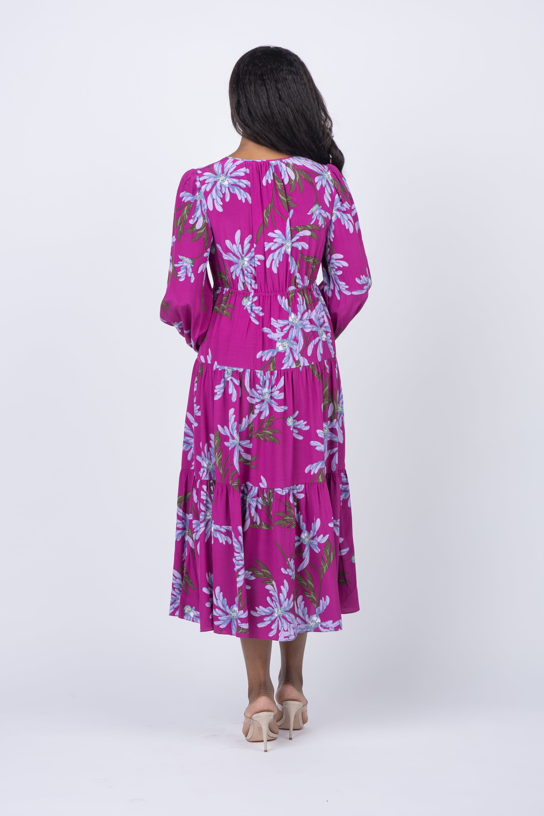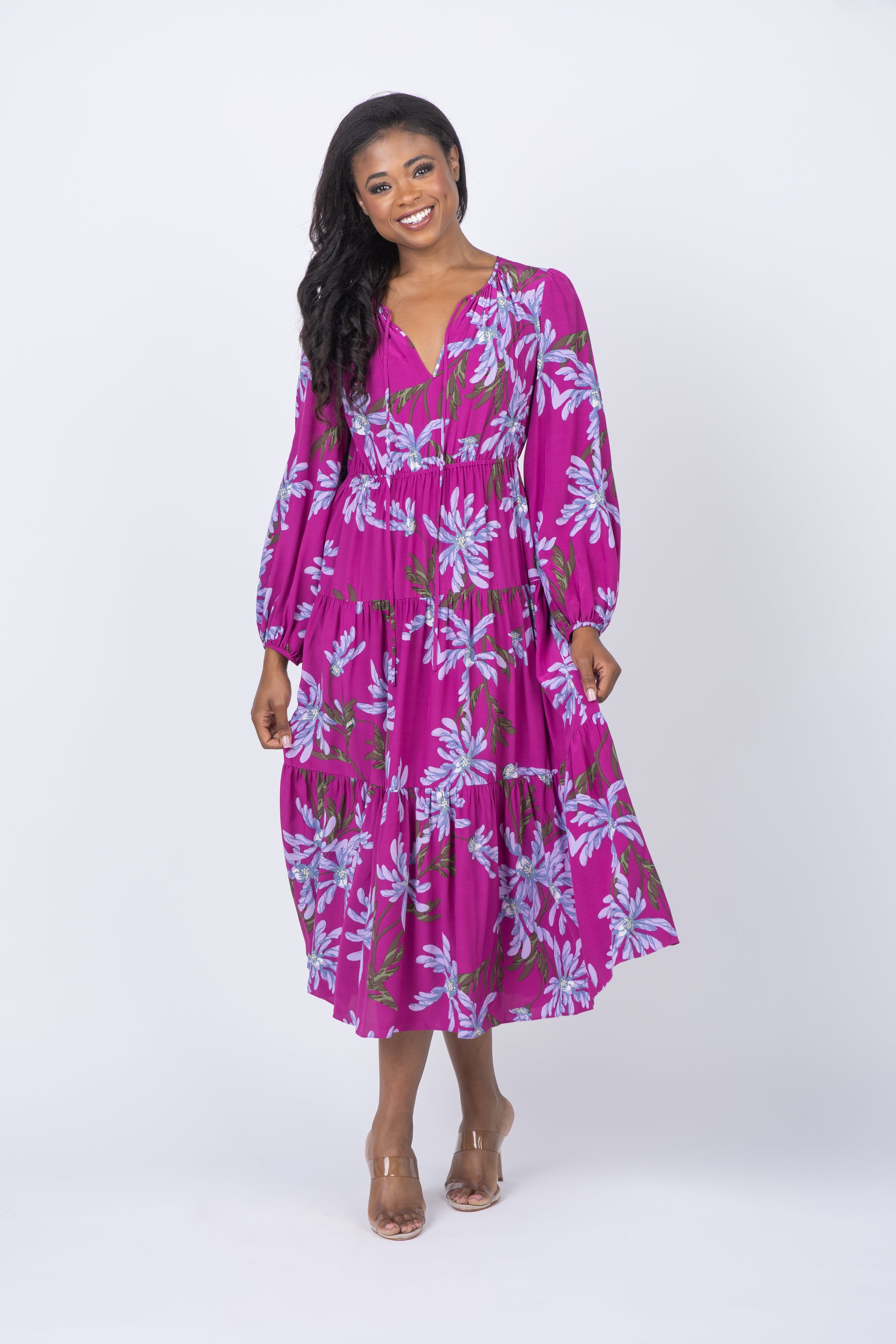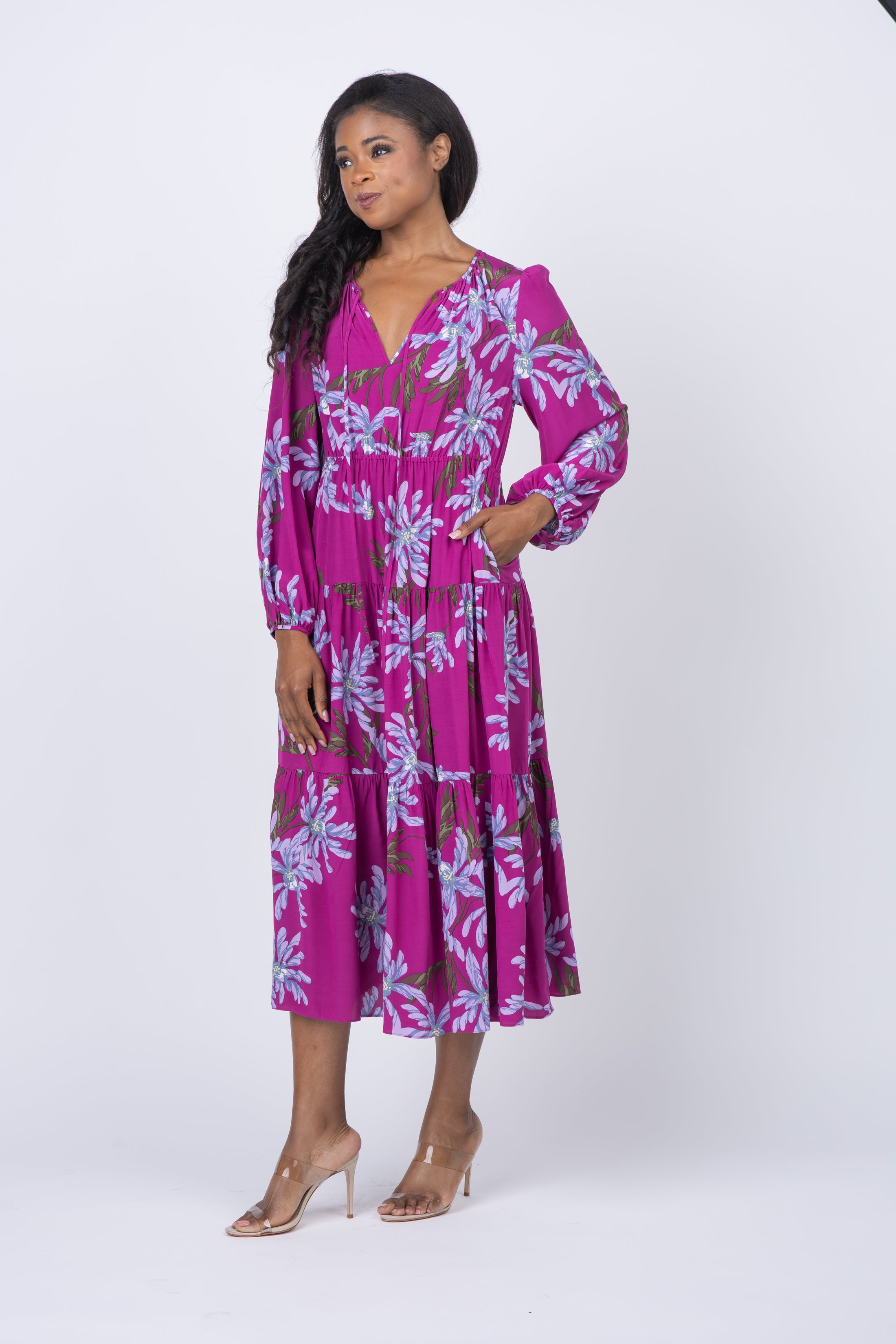 Cut from a soft crepe, the Dominique dress has a light, breezy drape. This piece has long billowy sleeves, a high neckline that can be tied to create cut-out detail, and a subtly cinched waist that fans out into a full, tiered skirt.