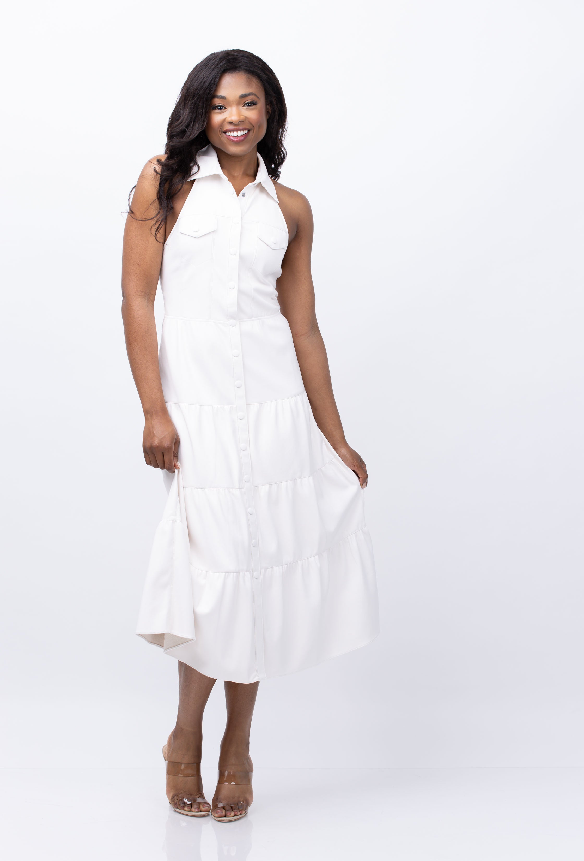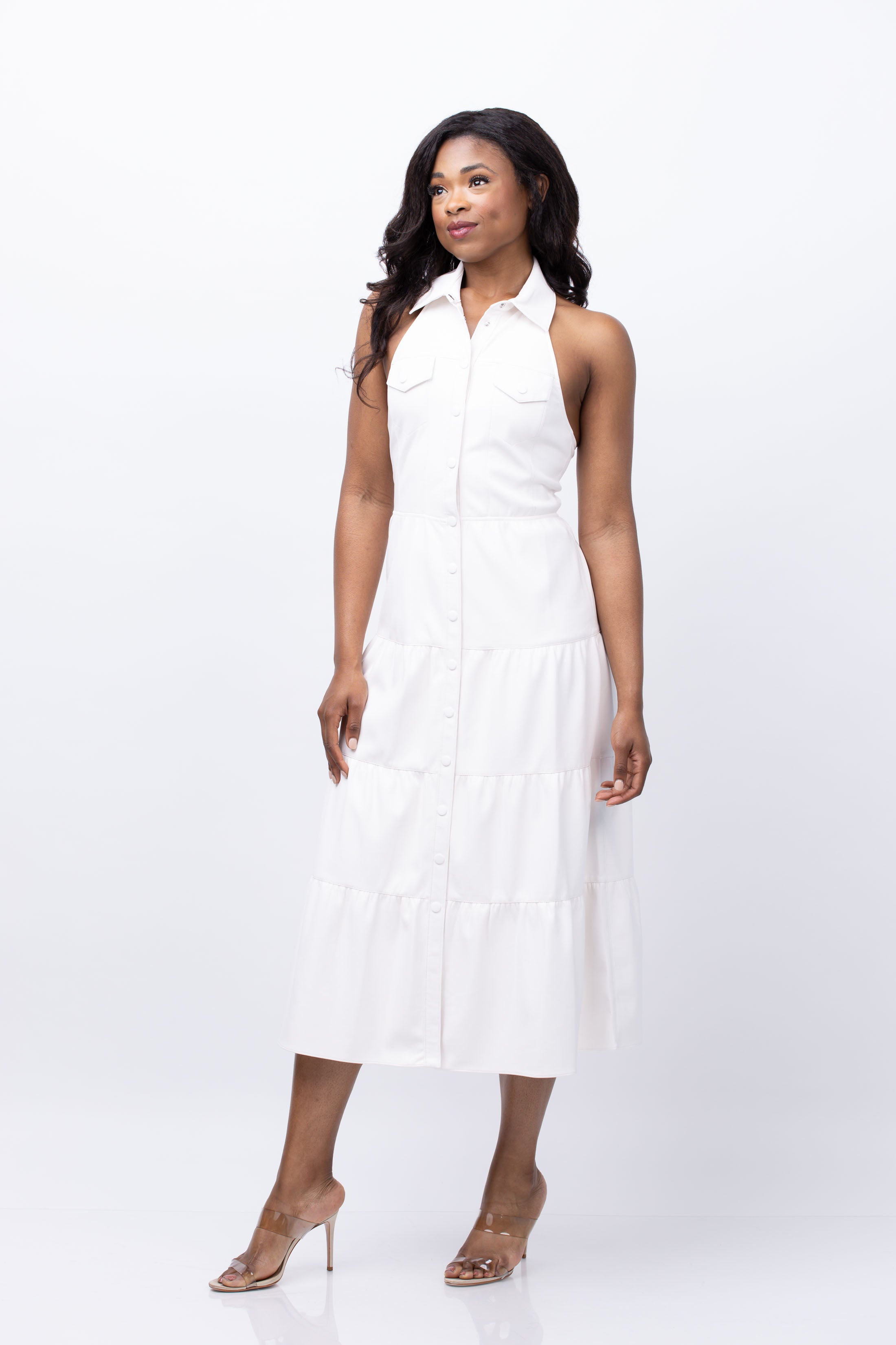 Experience the chic and modern style of the Alice + Olivia Miranda Faux-Leather Midi-Dress in Off White. Made with faux leather and featuring a tie-waist and tiered silhouette, this dress is perfect for adding a touch of edginess to any outfit. Elevate your fashion game with this versatile piece!