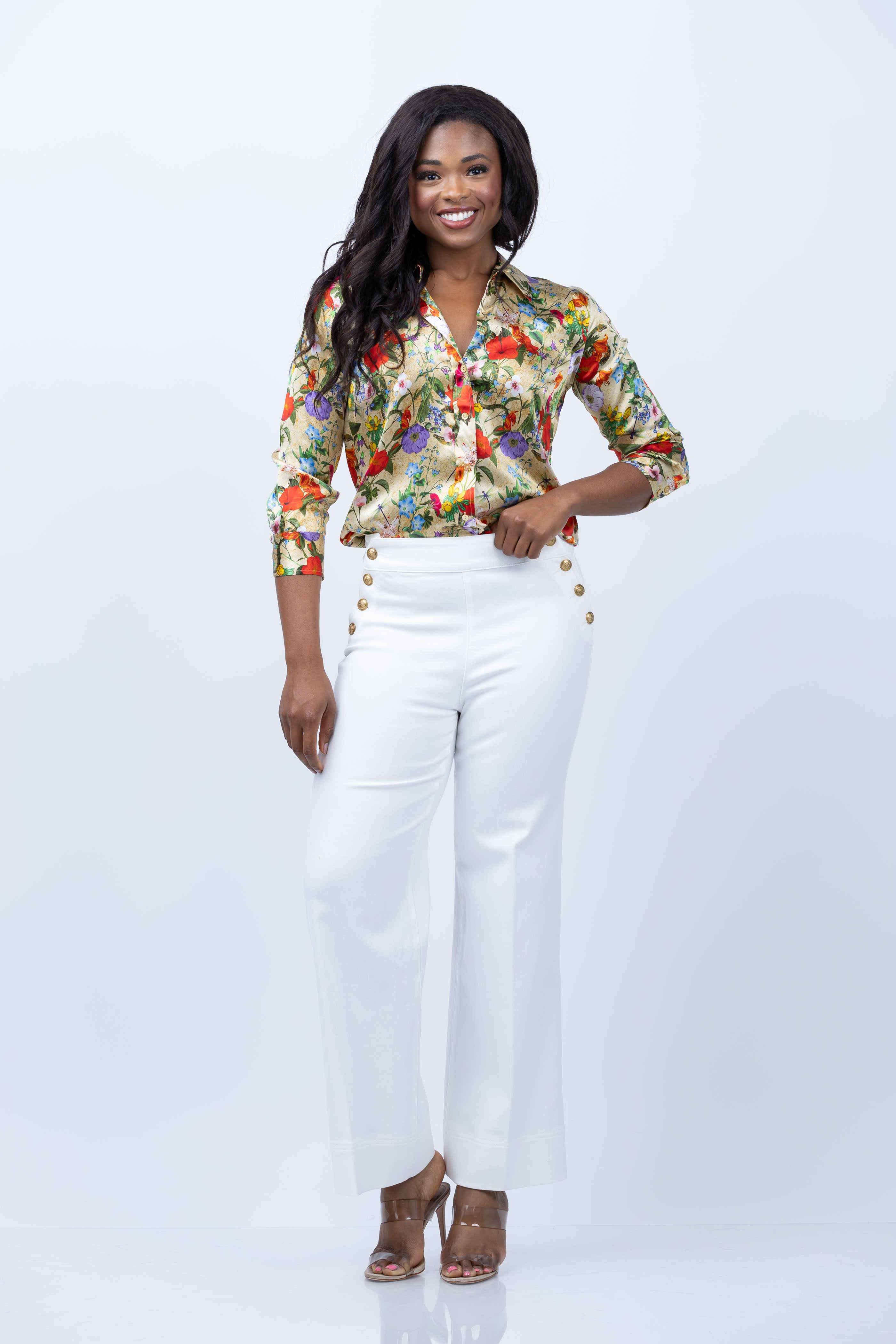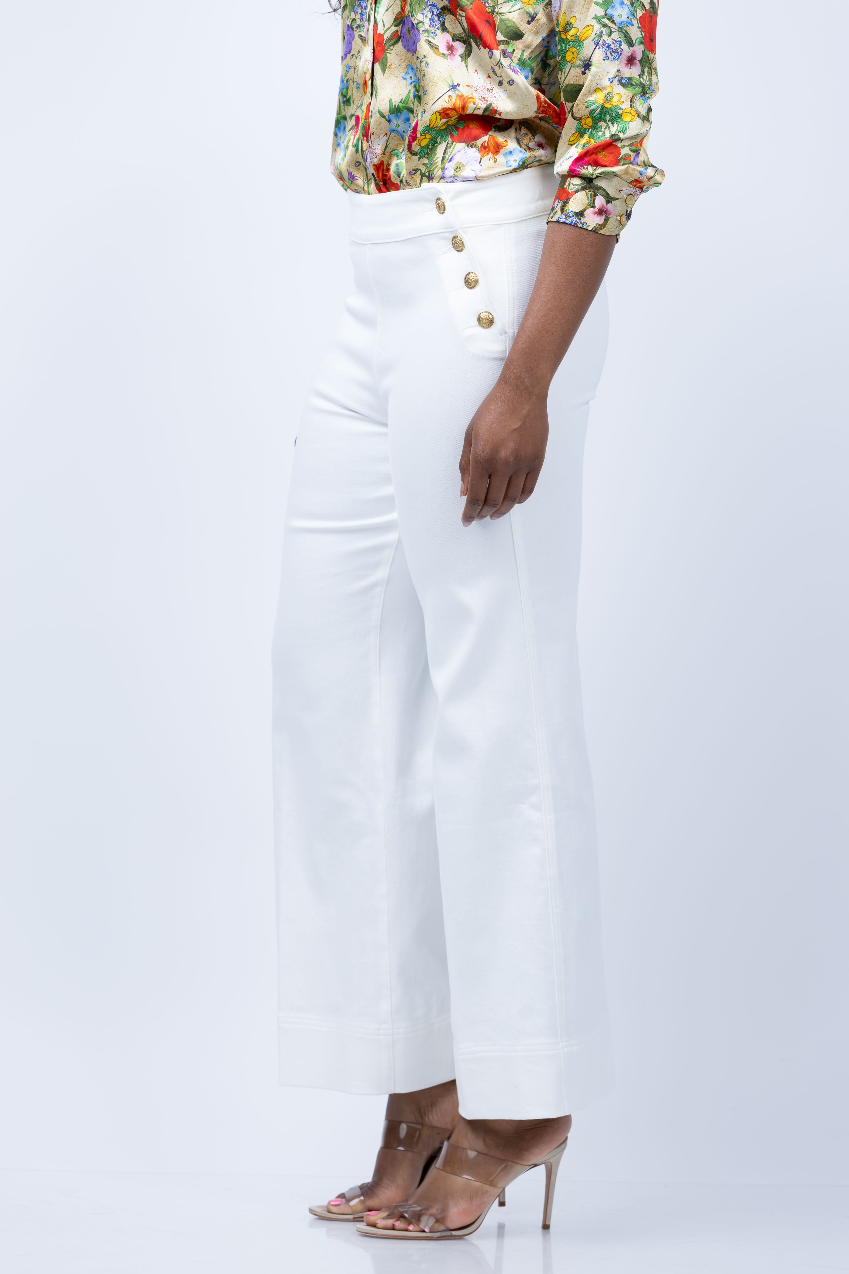 Introducing the Alice + Olivia Narin High Rise Jeans in Off White - the perfect nautical-inspired piece for warm weather! With a high rise and gold buttons at the front, these jeans offer a curve-hugging fit thanks to the hint of stretch in the denim. Add a touch of sophistication to your wardrobe today!