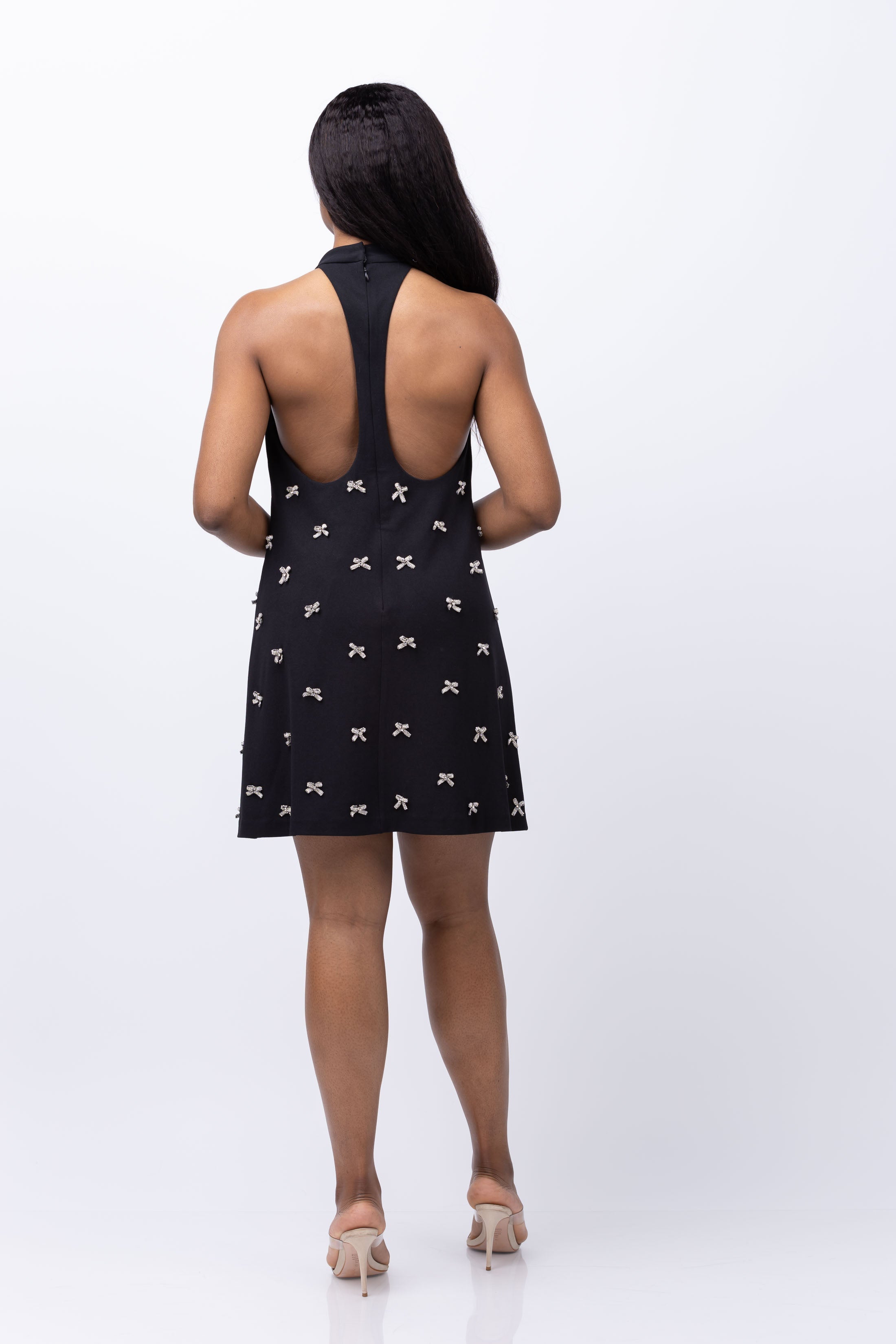 Elevate your style with the Emily Shalant Mini Bow Racerback Dress in Black. Made with stretch crepe fabric, this darling mini dress features delicate crystal bows that add a touch of sparkle. The racerback design adds a modern twist to the timeless silhouette. Perfect for any special occasion, this dress is sure to turn heads and make you feel confident and glamorous!