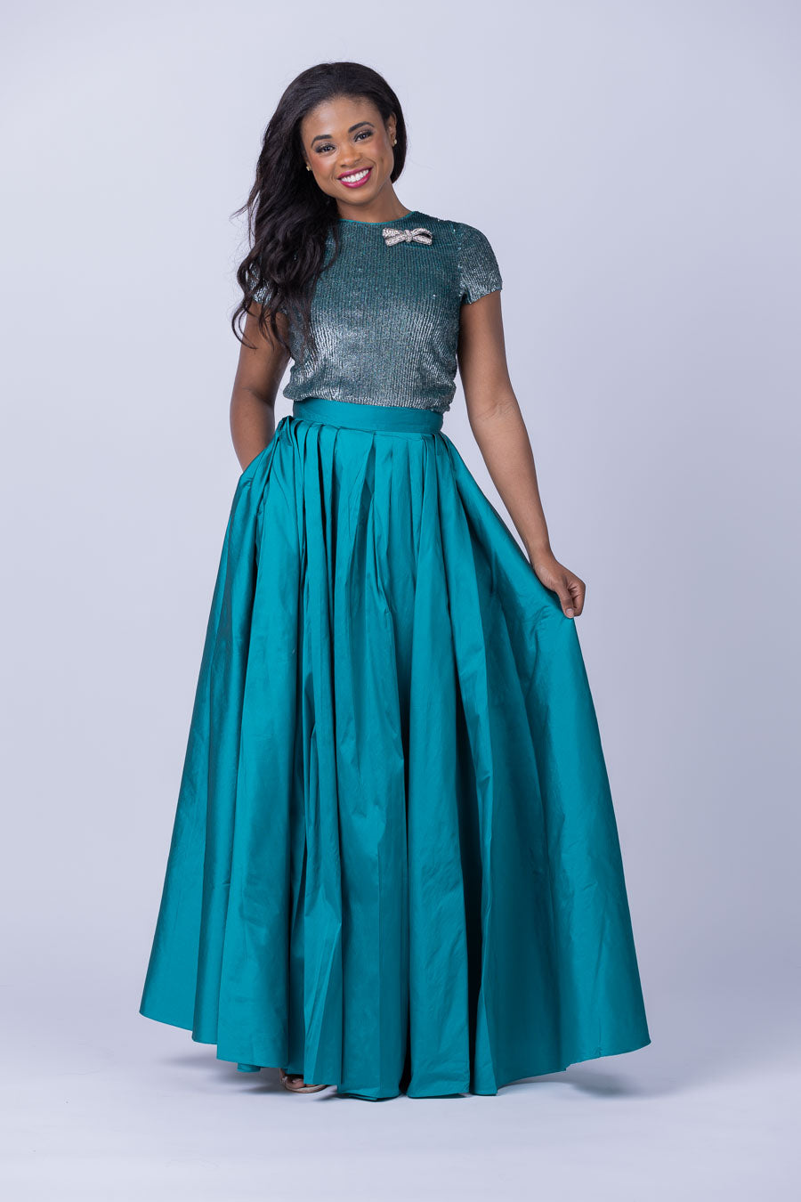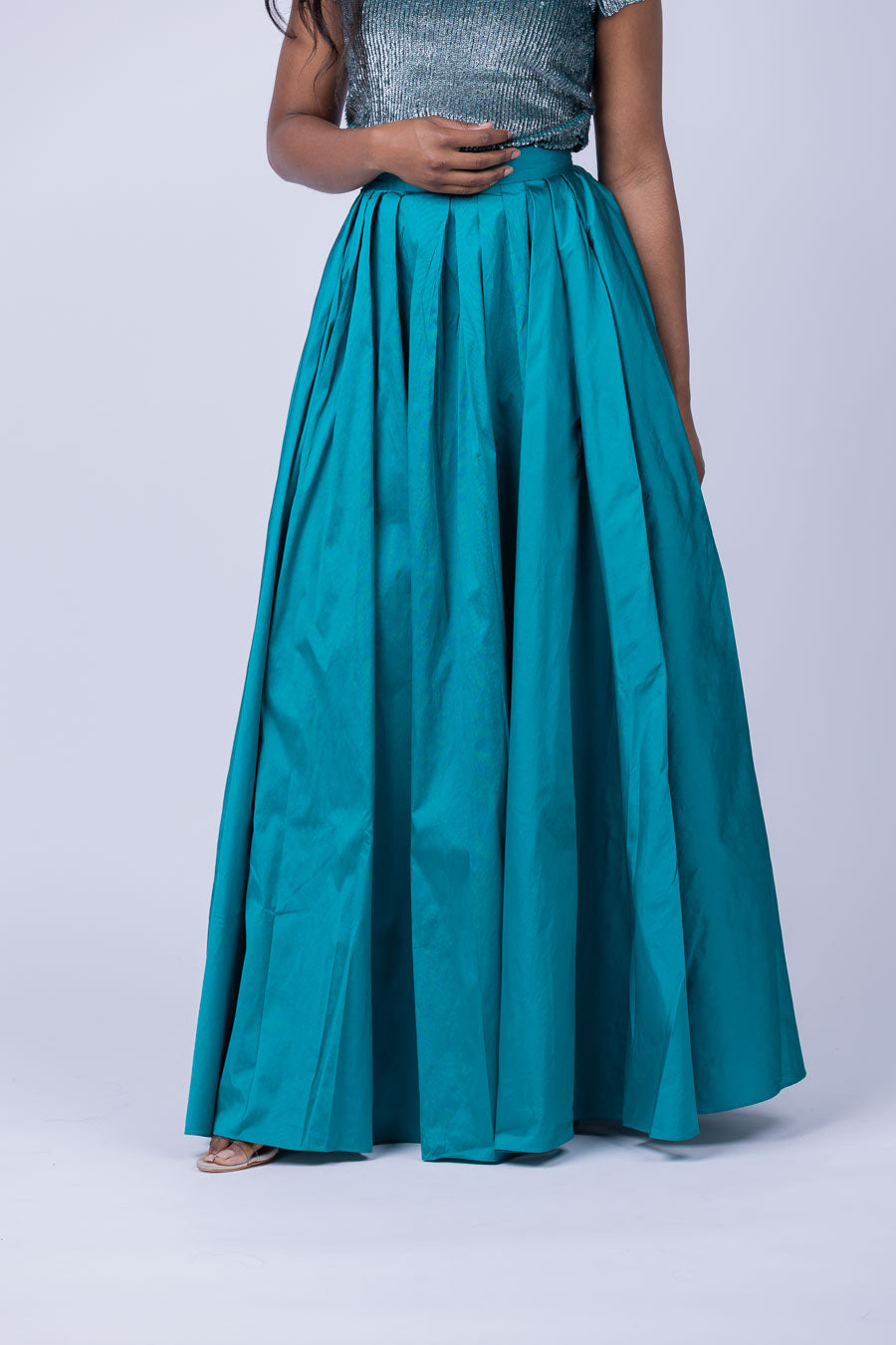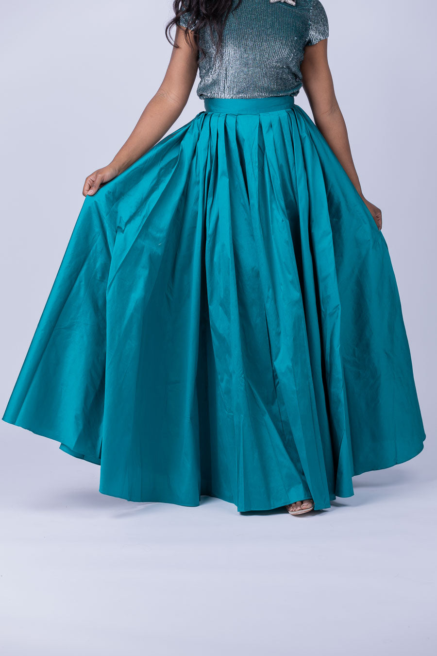 Look no further for a show-stopping look! The Emily Shalant Taffeta Ballgown Skirt Peacock will add a dramatic flair to any look. It is made from gorgeous taffeta that is sure to turn heads. Side seam pockets add a practical flair, while its perfect color for a monochromatic look or mix & match will take your outfit to the next level of glam! Made in India. Dare to go bold!