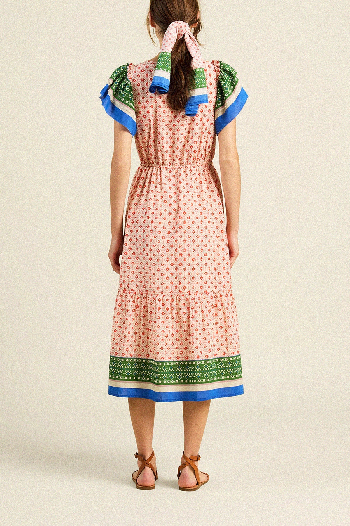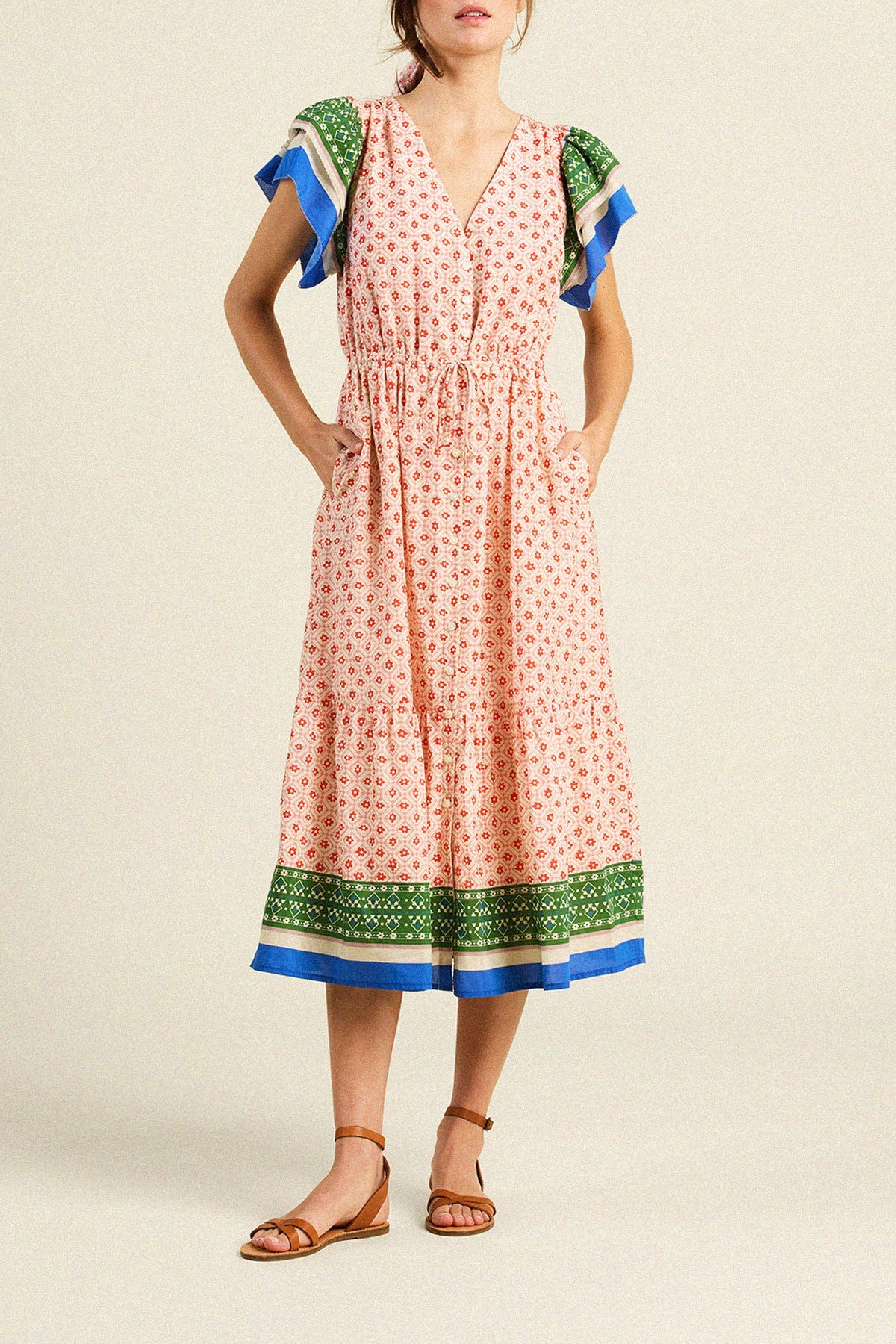 The Trovata Kristine Dress in Santorini Border combines elegance and comfort with its soft cotton silk fabric. Its midi length and flowing skirt with delicate gathers create a flattering silhouette, while double flutter sleeves add a feminine touch. The narrow waist casing with a drawstring allows for a customizable fit, and the functional buttoned placket enhances the v-neckline. Practical hidden side seam pockets complete this versatile dress, perfect for effortless style from day to night.
