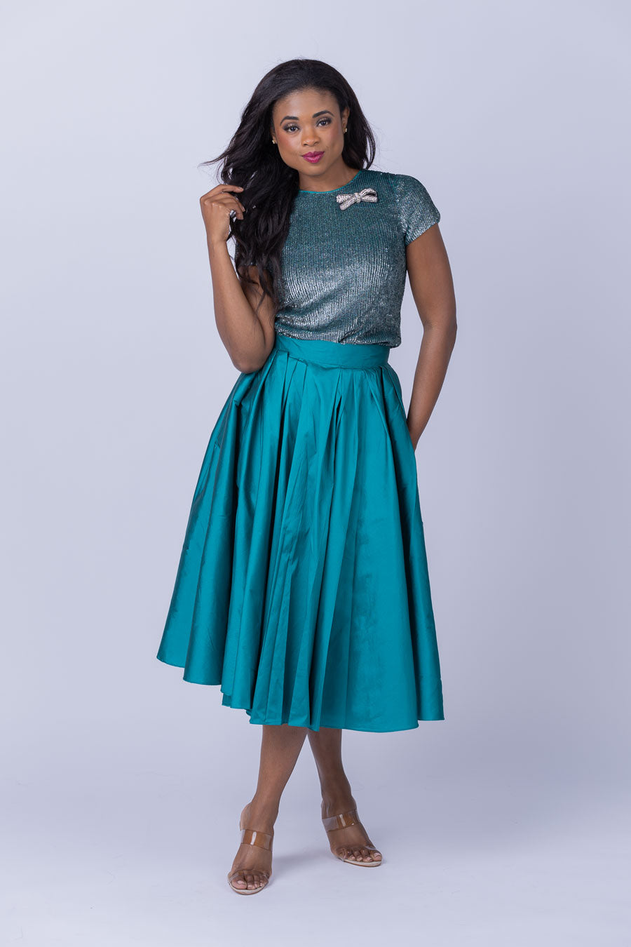 Add a dramatic flair to any outfit with the Emily Shalant Taffeta Tea Length Midi Skirt in Peacock. The gorgeous taffeta fabric and tea-length hem will take your looks to the next level of glam. With side seam pockets for convenience and a vibrant peacock color, you can create an effortlessly chic monochromatic look or a bold mix-and-match ensemble. Made in India with love. Let Emily Shalant be your fashion statement.