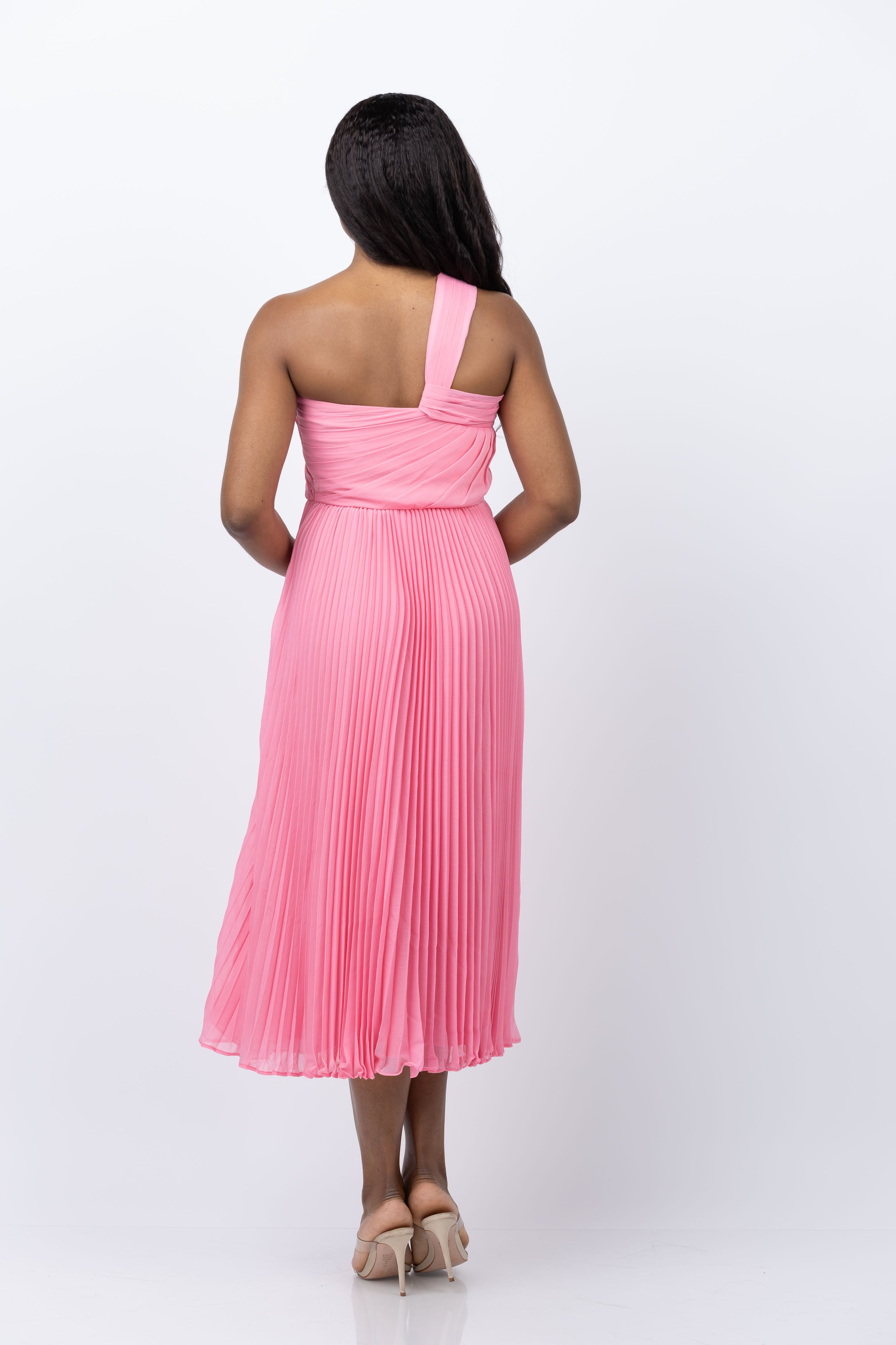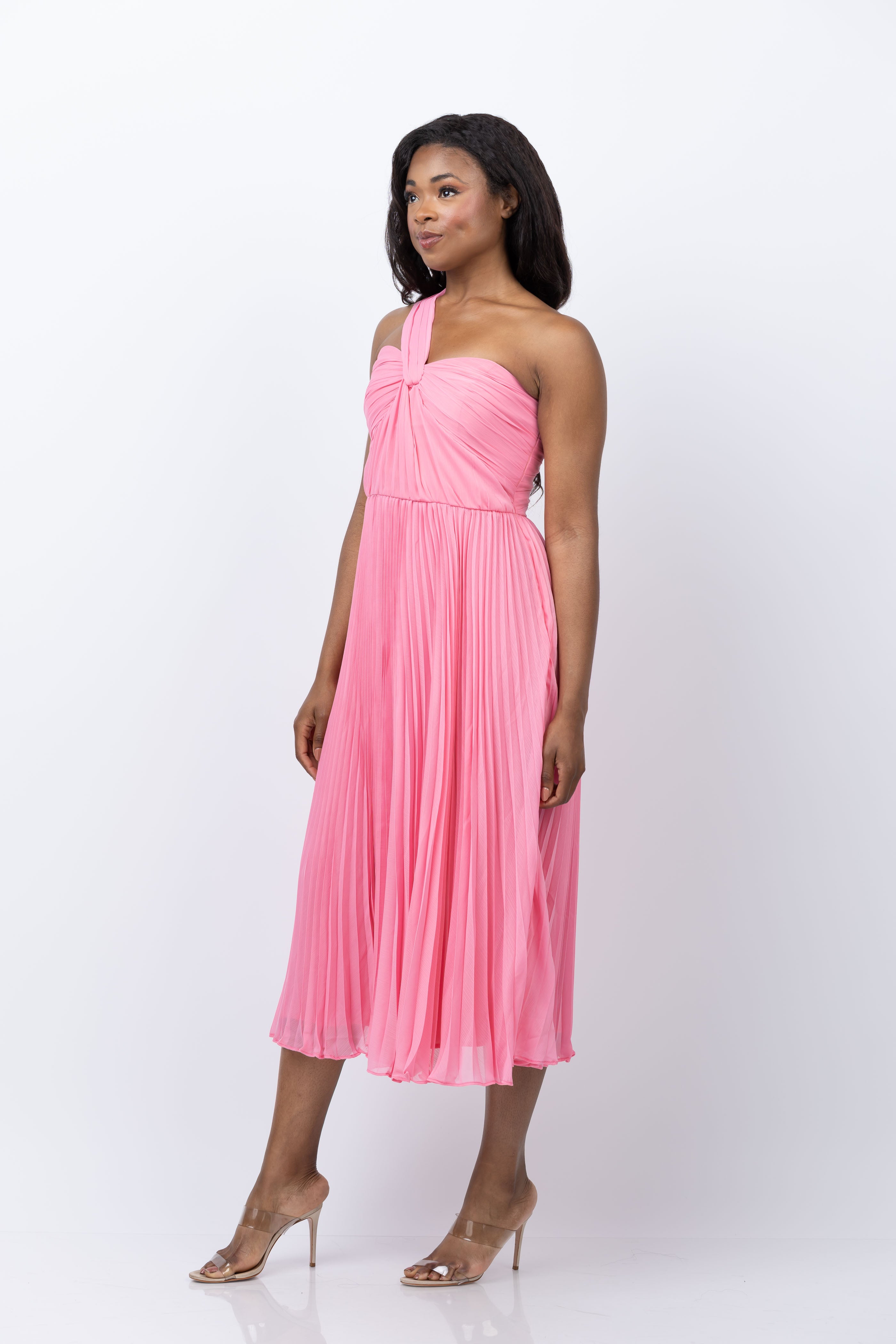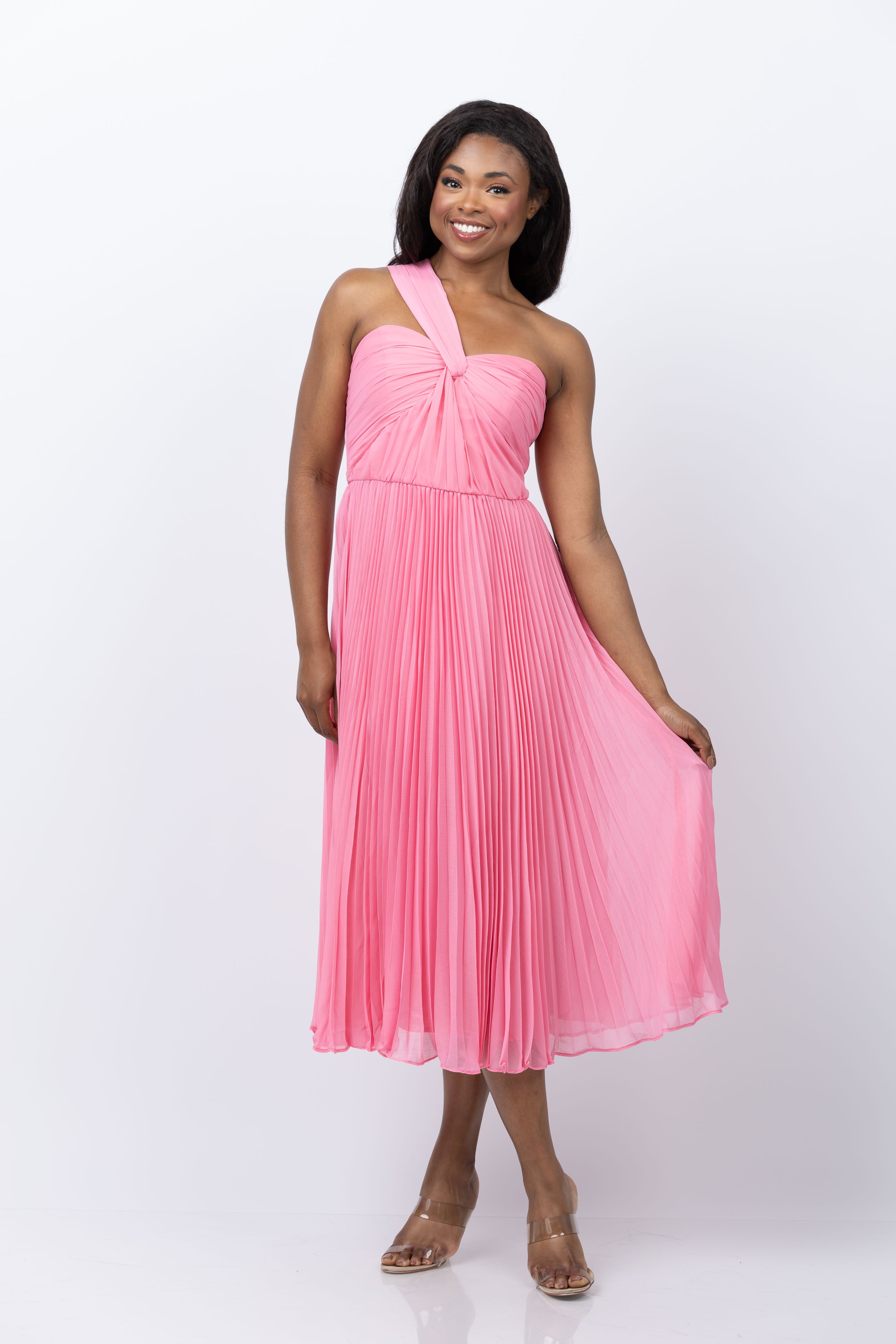 Be a showstopper at any summer event in the ML Monique Lhuillier Lindsay Chiffon Asymmetrical Midi Dress. The one shoulder design and pleated candy pink fabric exude elegance and would make the perfect wedding guest attire. Embody confidence and charm in this stunning midi dress!