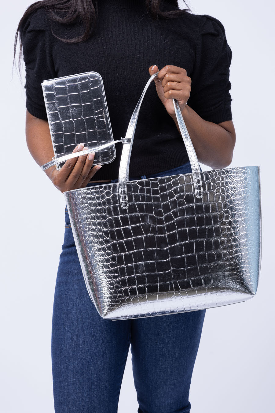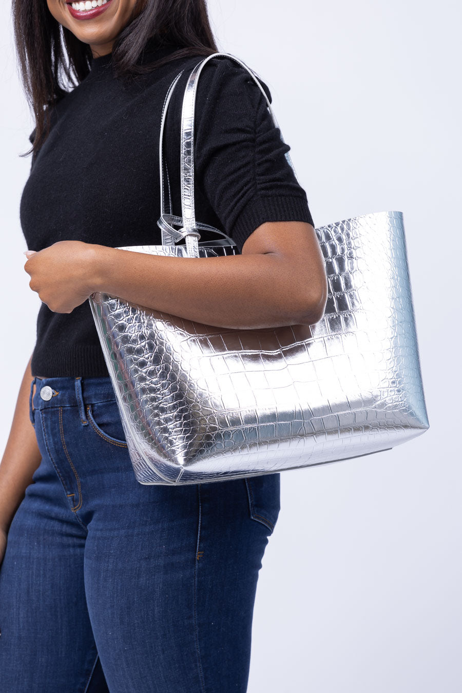 Mansur Gavriel Large Metallic Croc Tote in Silver