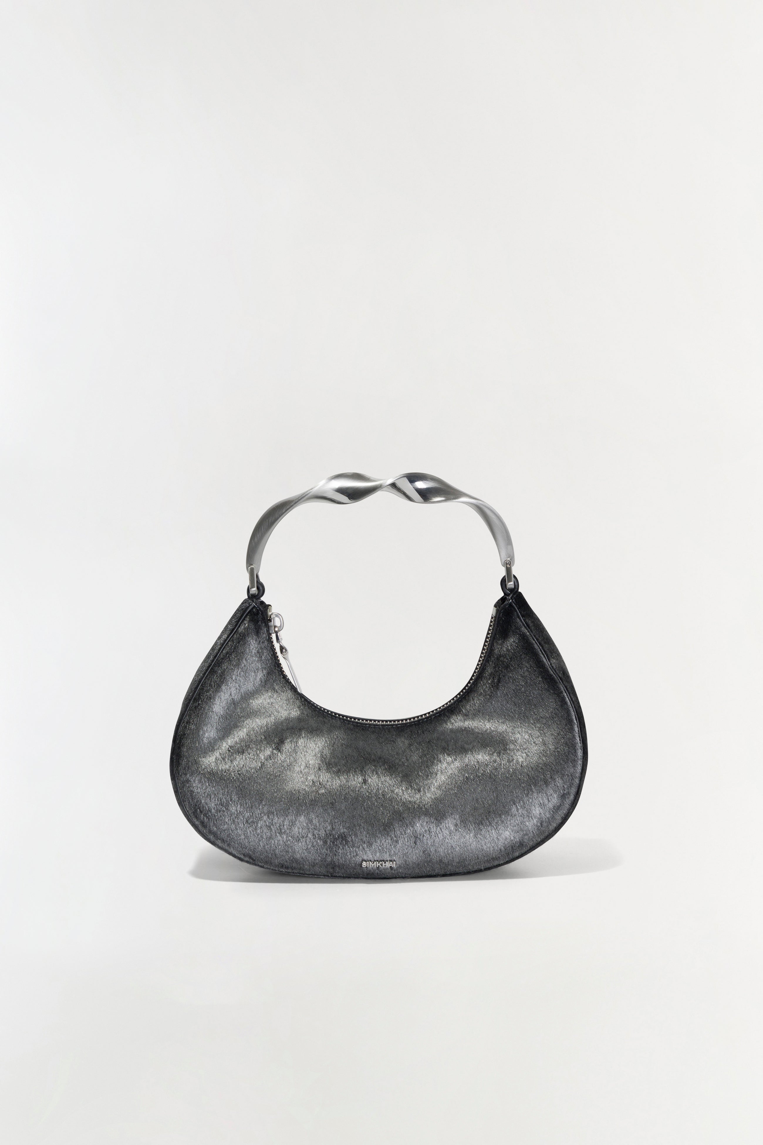 Elevate your style with the Simkhai Nixi Calf Hair Twist Handle Bag in Sterling. Designed in a structured crescent shape, this high-contrast handbag features a distinctive twisted metal top handle that adds an eye-catching detail. Its unique combination of textures and bold design makes it a standout accessory for both day and night, delivering sophistication with a modern edge. Perfect for those who appreciate artistry in fashion, this bag offers both style and substance in one striking piece.