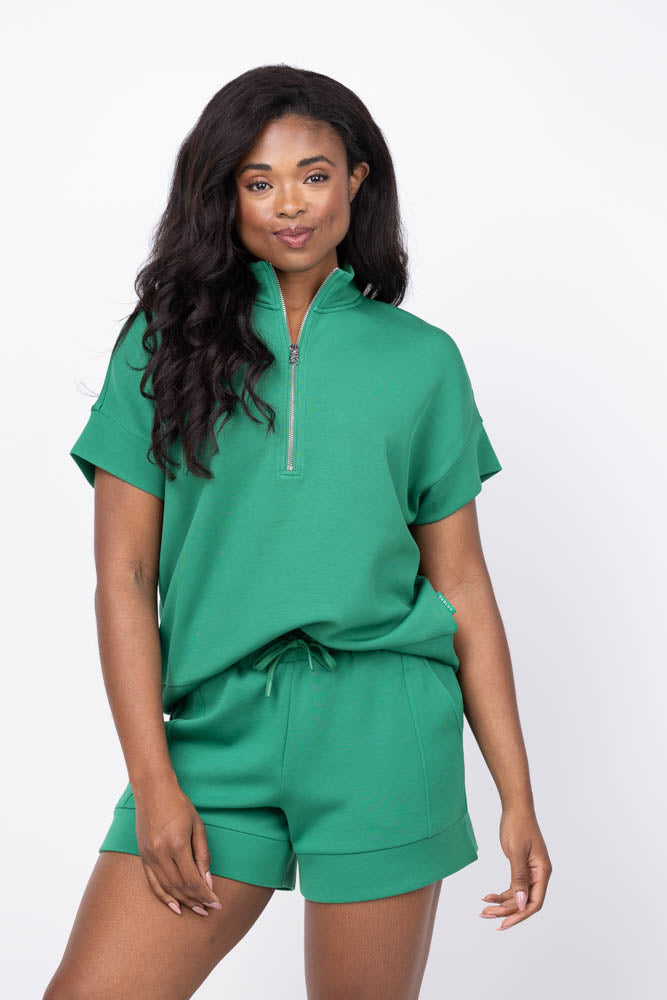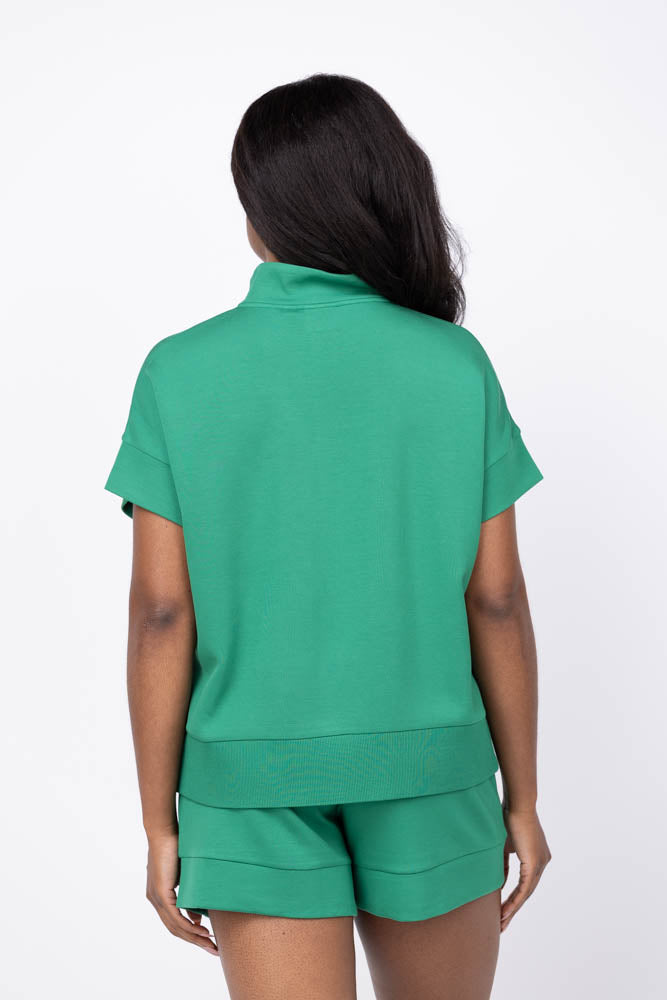 Experience effortless style and comfort with the Varley Ritchie Short Sleeve Sweat in Verdant Green. Designed for a relaxed fit, this piece features short sleeves, a mock neck, and a convenient half-zip for easy layering. Perfectly paired with matching shorts and pants, it offers a versatile look that transitions seamlessly from casual outings to cozy days at home.