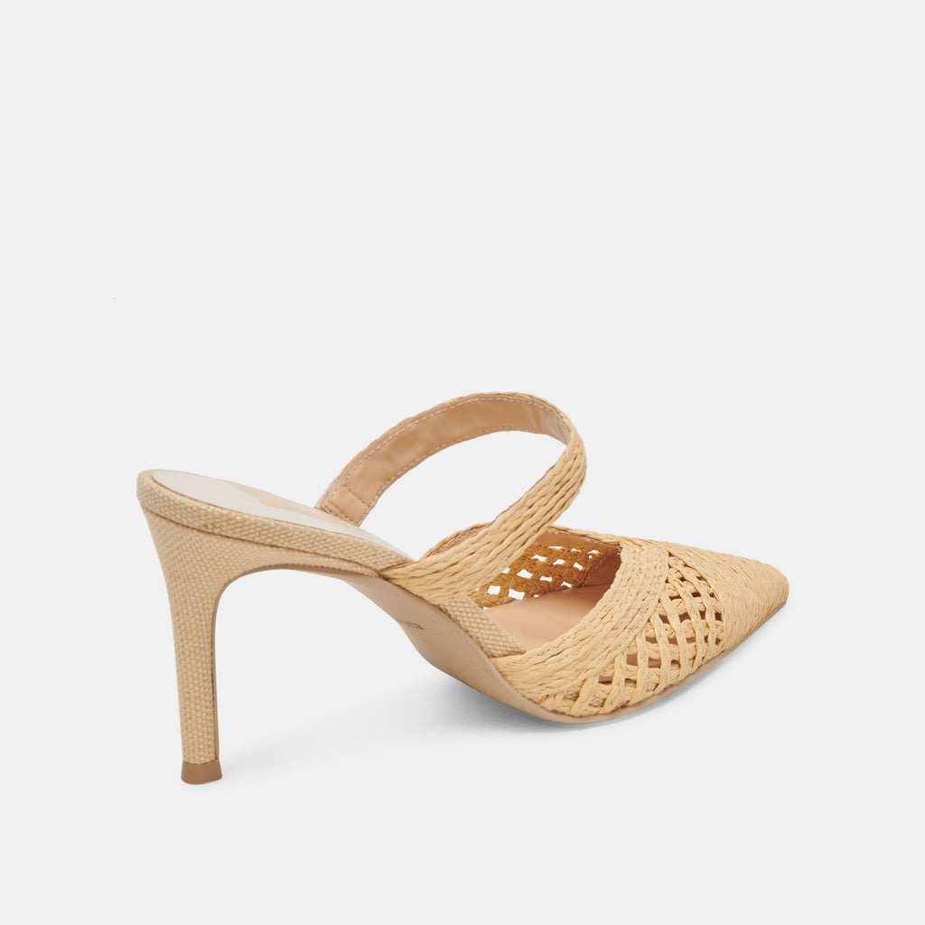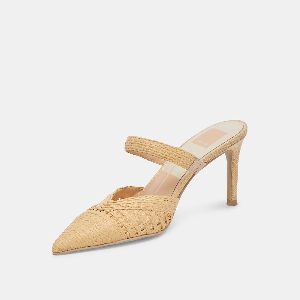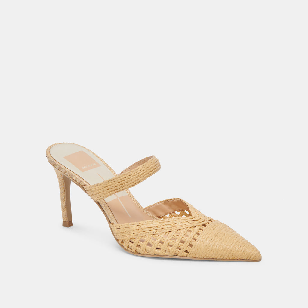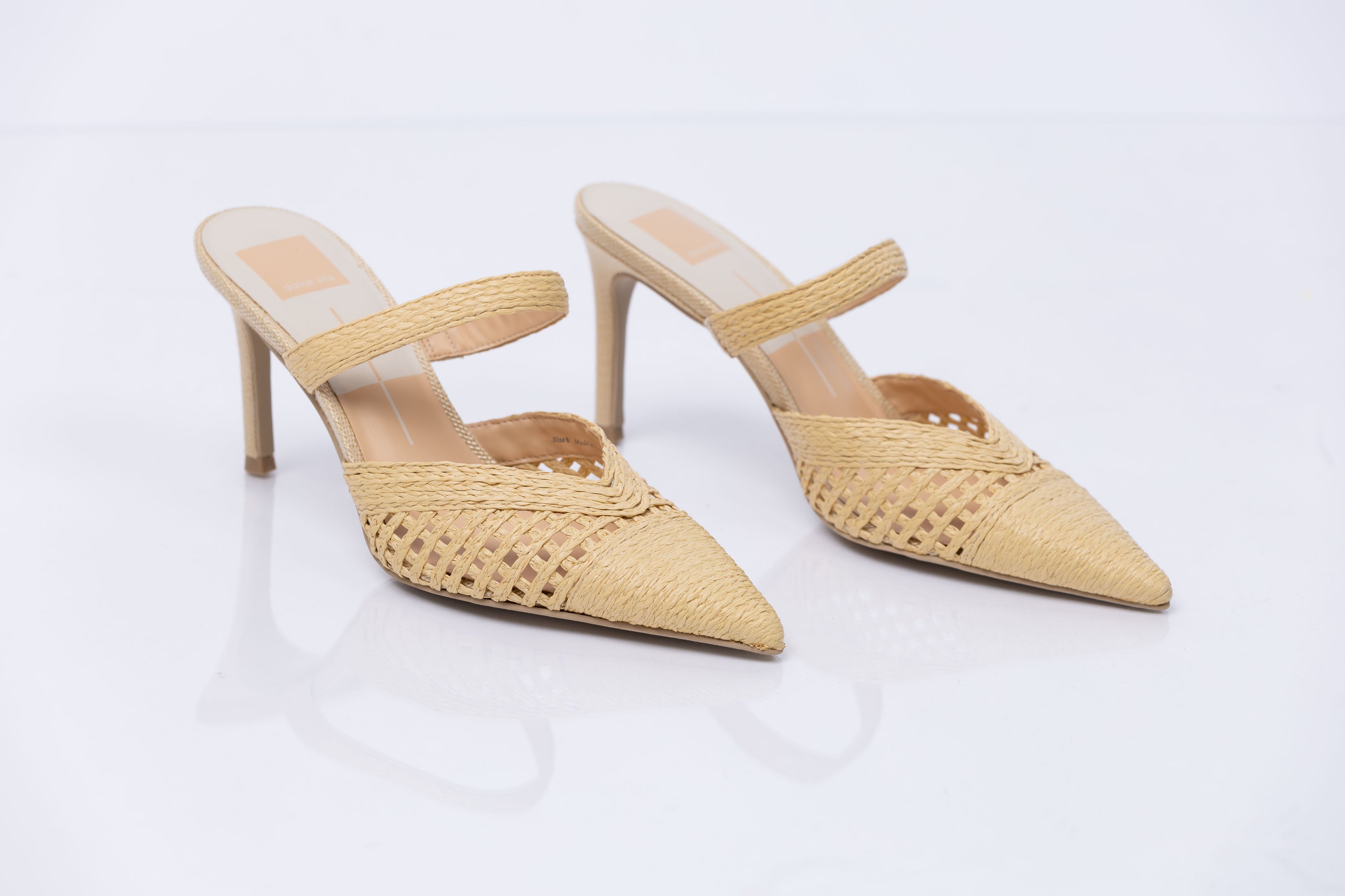 Elevate your style with Dolce Vita's Kaline Heels, featuring a pointed toe and stiletto heel in natural raffia. The perfect combination of sophistication and texture, these heels are sure to make a statement and complete any look. Step into effortless elegance with Kaline.
