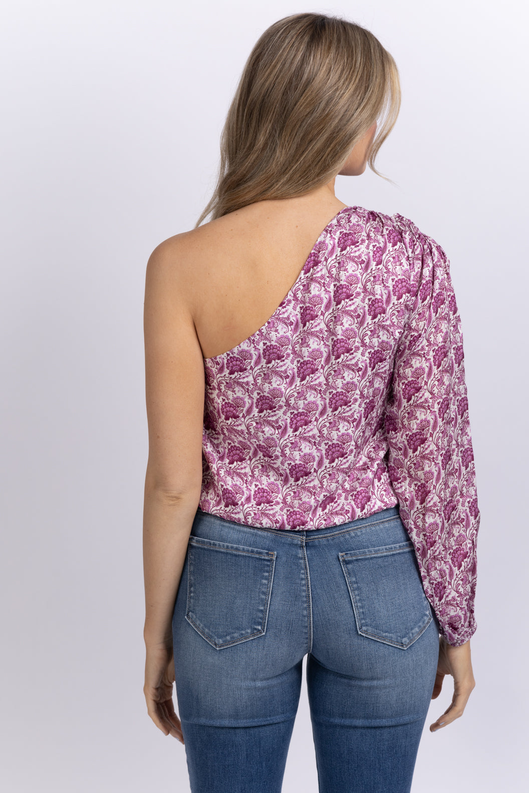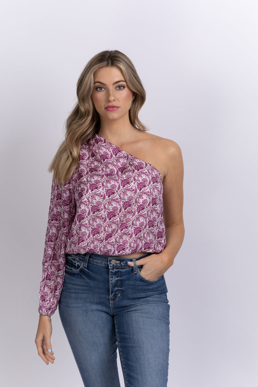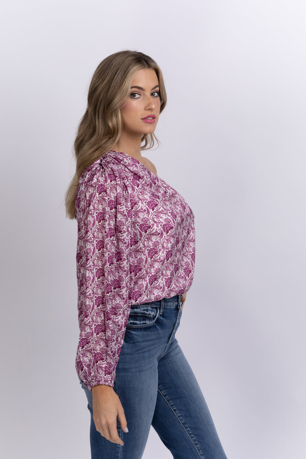 The perfect top for your next warm vacay! This sweet pretty in pink blouse is giving off all the spring and warmer weather vibes. Featuring a pleated shoulder, one long sleeve, luxurious cotton silk blend and a pansy paisley pink print.