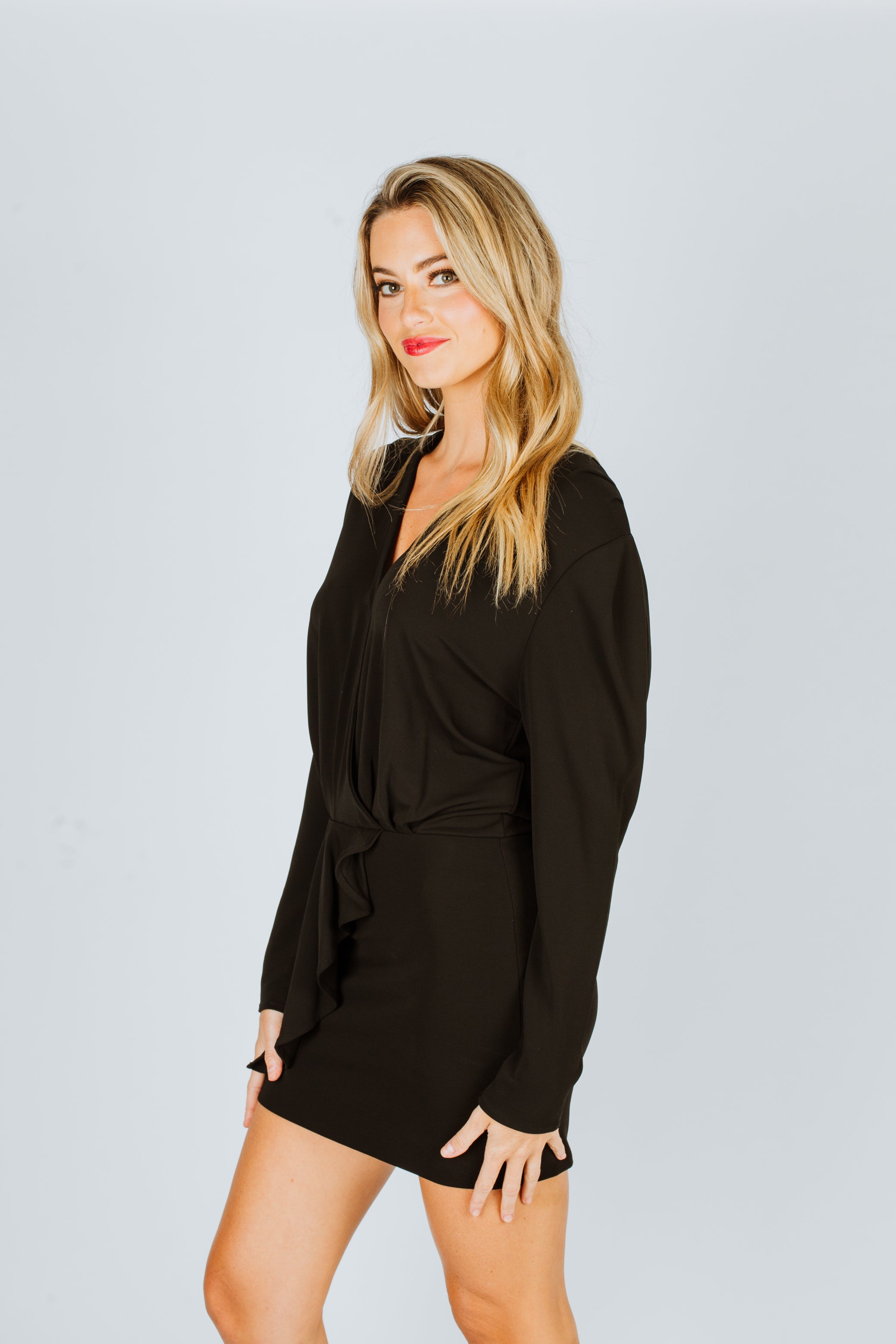 Jersey wrap-style mini dress from IRO featuring black, stretch-design, ruffled detailing, V-neck, long sleeves, straight hem and thigh-length.